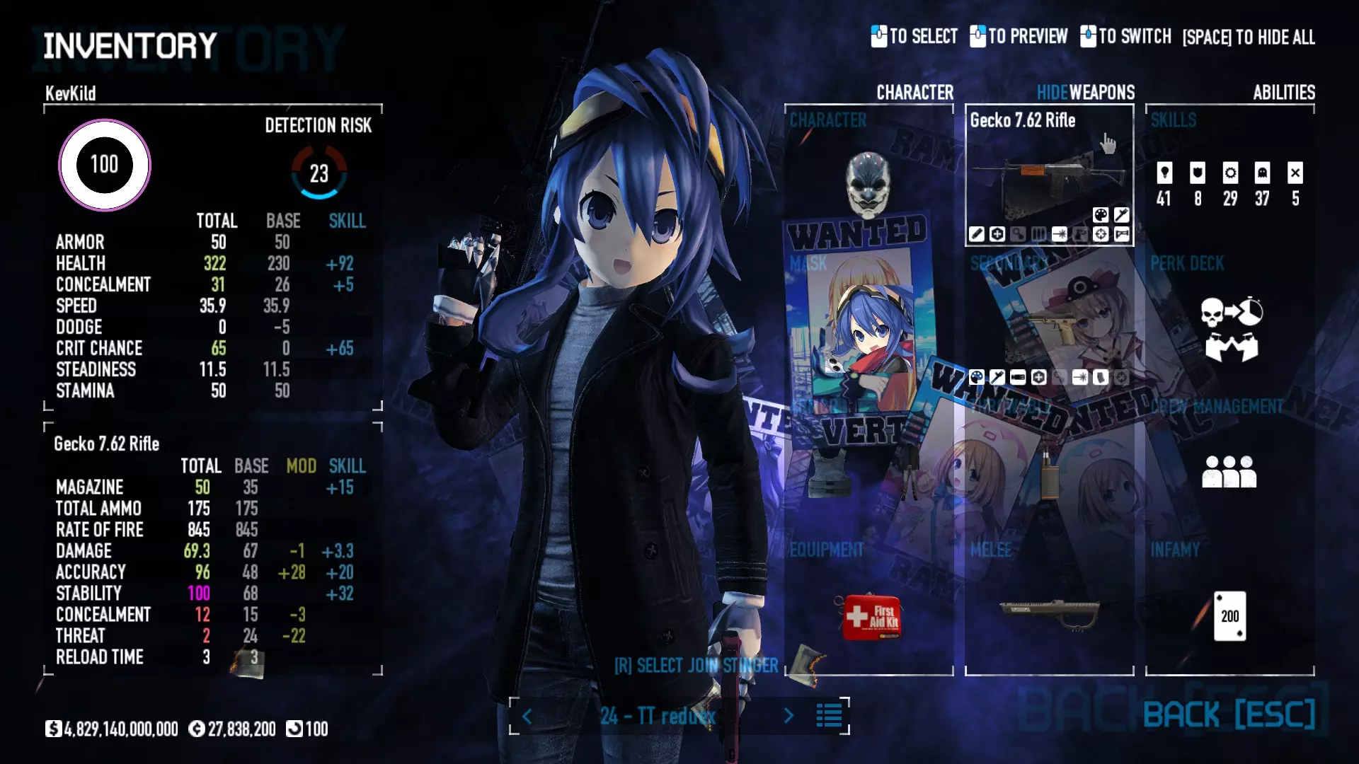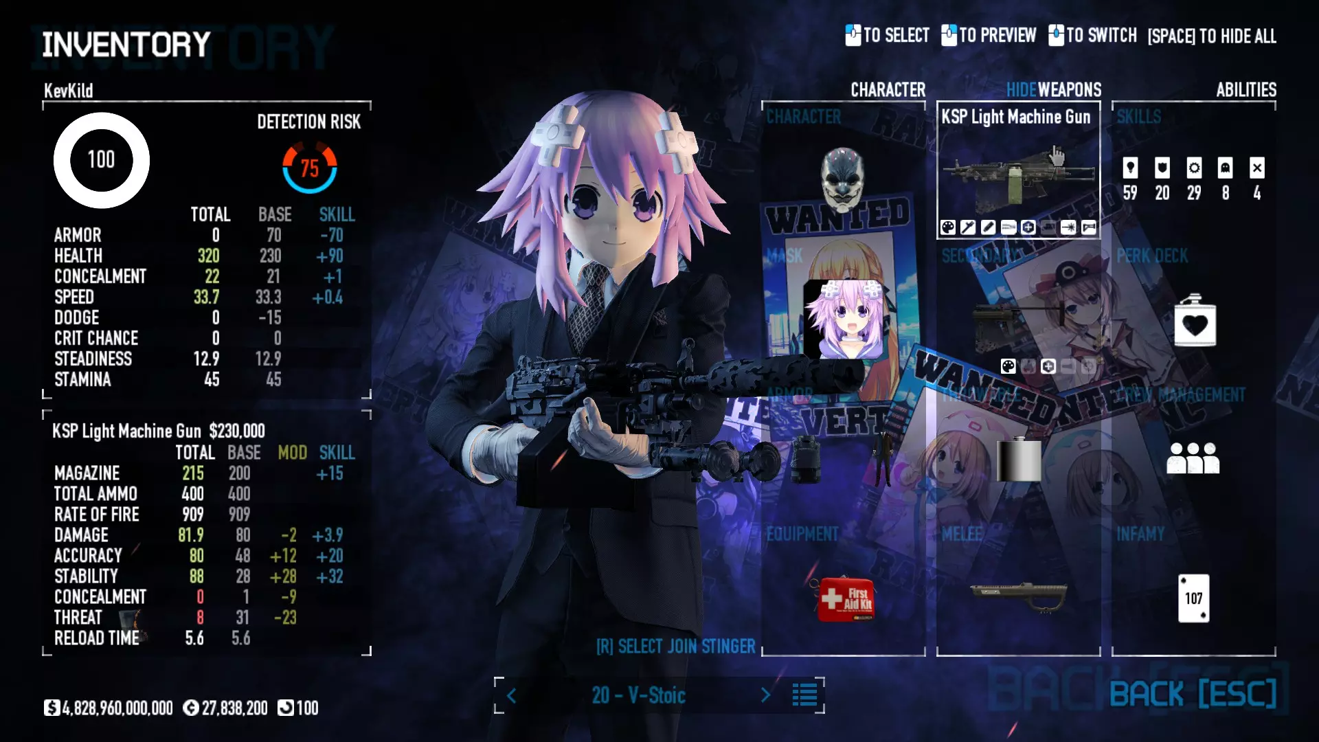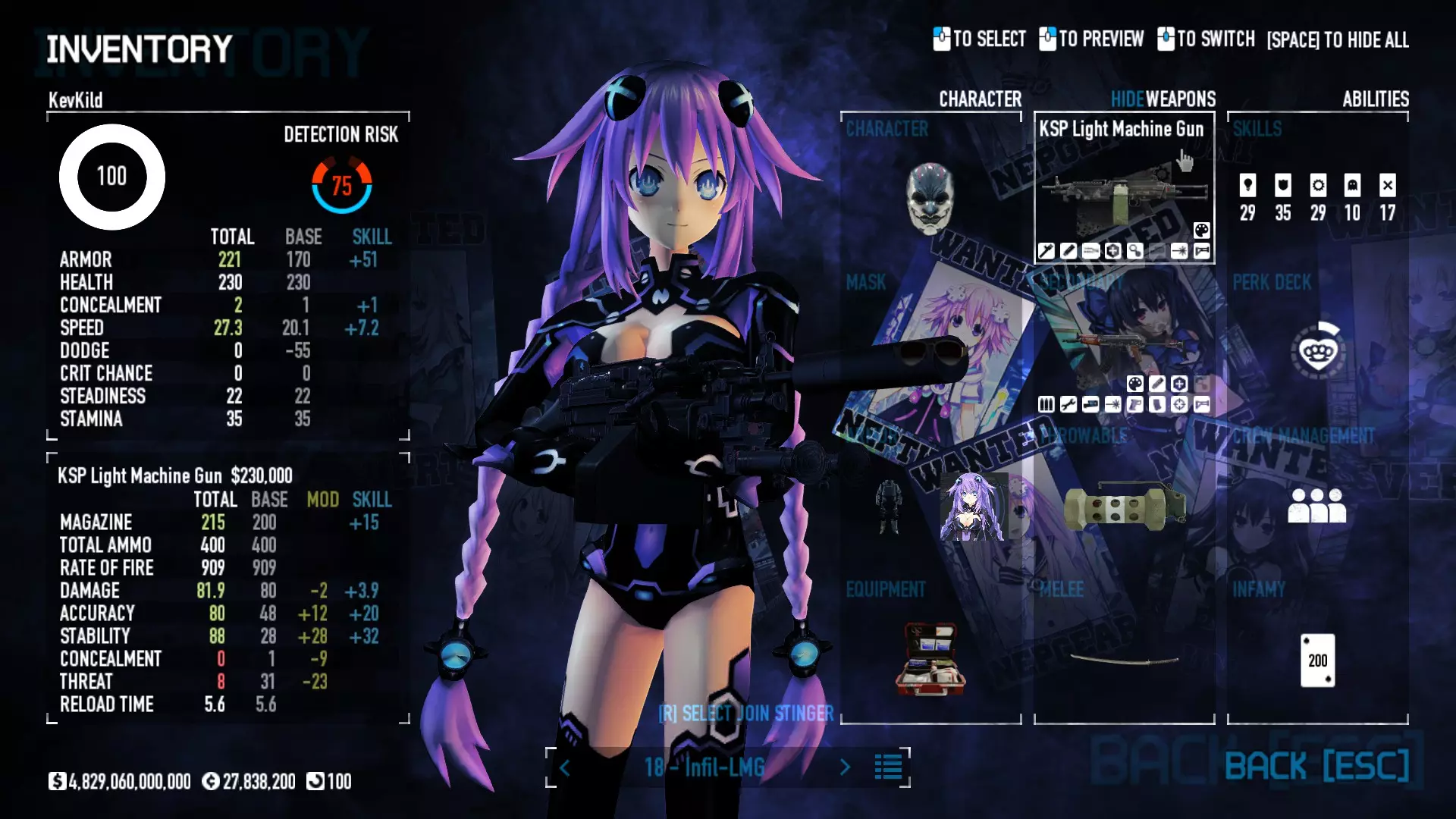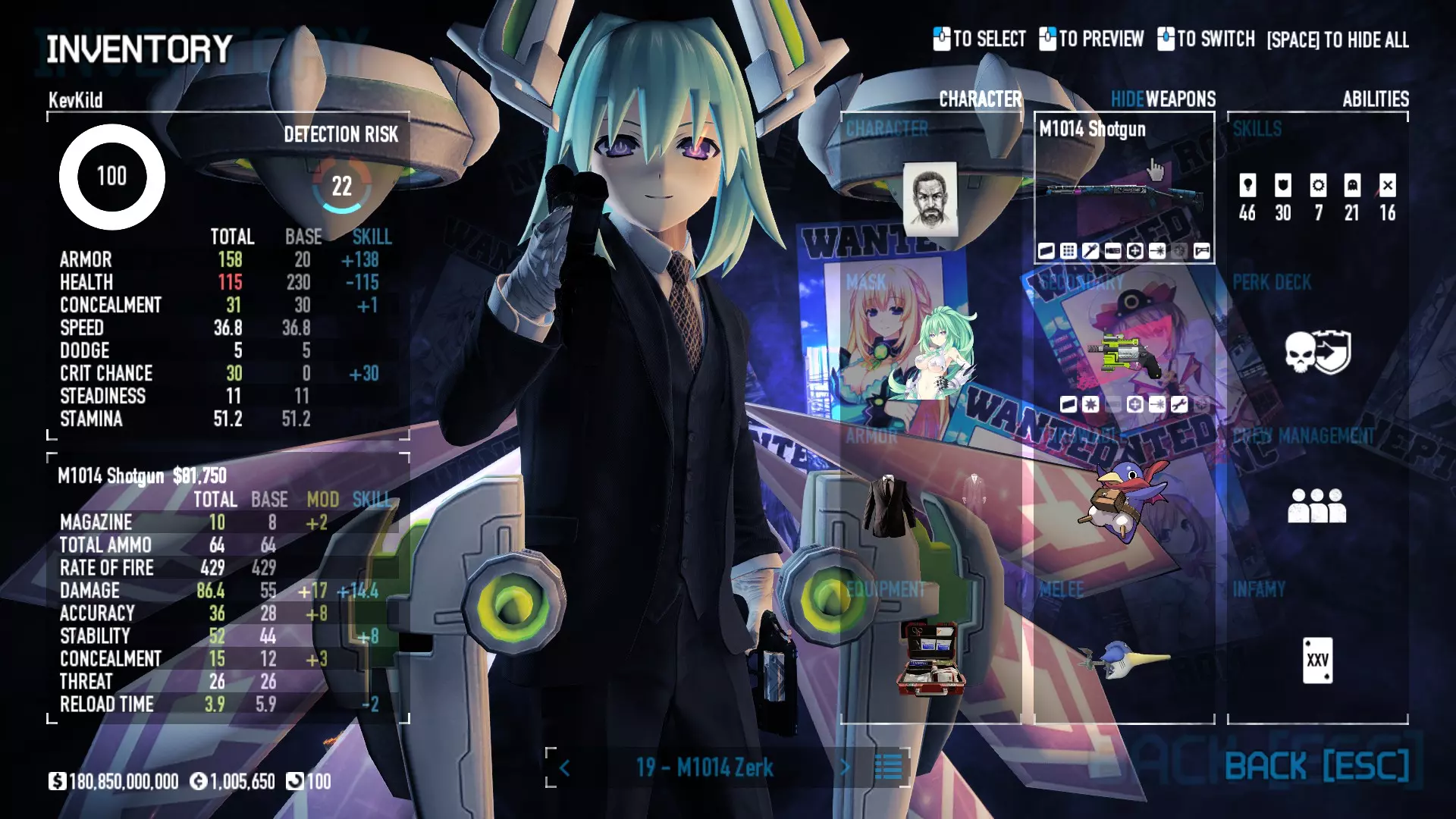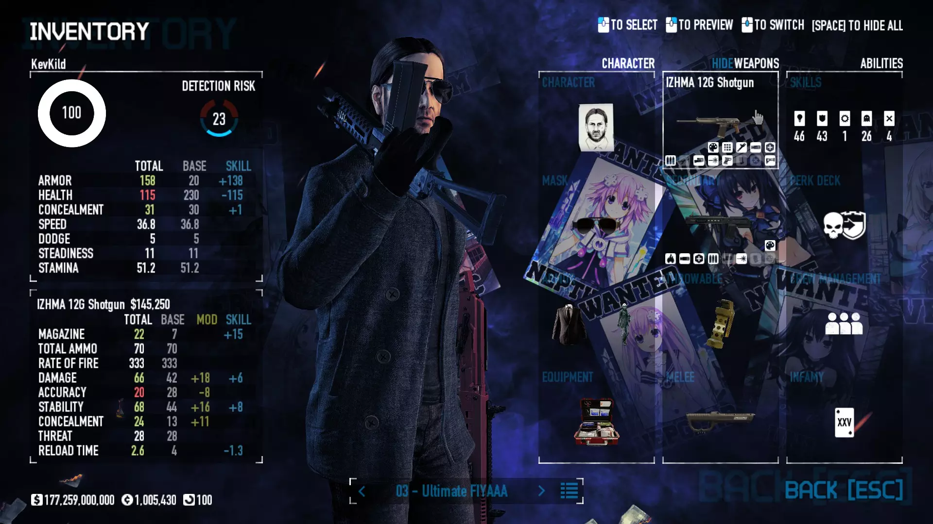 Secondary Weapon Grimm 12G Shotgun Attachments Dragon’s Breath Round Shark Teeth Nozzle Boost – Team Boost Auto Fire LED Combo Big Brother Magazine Compact Holosight – Dot 2Equipment Armor: Suit Deployable: Trip Mine & Doctor Bag Throwable: Concussion Grenades Melee: Buzzer/Electrical Brass KnucklesNotes & Videos Carry Potential: Transports Only https://pd2builder.netlify.app/?s=1G1e10d0e110383g00120150-4h00&p=e&a=0&t=4&d=3 You could run this as support build for saw-able heists, but wasted DPS potential Mod Link Section Moved my PasteBin section here for convenience and if anyone wants to play with above builds. == mods Folder == SuperBLT[superblt.znix.xyz] BeardLib[modworkshop.net] VanillaHUD Plus[modworkshop.net] VoidUI[modworkshop.net] FreeFlightCam[modworkshop.net] Low Violence Mode[modworkshop.net] Music Control[modworkshop.net] AntiCrash[pd2mods.z77.fr] NoScreenShake(Shooting)[modworkshop.net] Cloaker Camera Kick Disable[modworkshop.net] More Skill/Profiles[modworkshop.net] BagTilt Disable[modworkshop.net] CrimeNET Border removal[modworkshop.net] Skill Tree Background[modworkshop.net] Tast's DayNight Changes[modworkshop.net] LabRats Blankets[modworkshop.net] AutoFire SFX Fix[modworkshop.net] Sensitivity Fixer[modworkshop.net] No Down Counter[modworkshop.net] Mute Menu Contractors[modworkshop.net] == Assets Mod_overrides == Neptunia HyperHud[modworkshop.net] Neptunia Diff icons[modworkshop.net] Neptune Jacket Skin[modworkshop.net] Hoxton Evidence Room[modworkshop.net] Neptunia Breakout Screen[modworkshop.net] Neptunia GAGE Pack[modworkshop.net] Neptunia Alesso Heist[modworkshop.net] Neptunia Bank Texture[modworkshop.net] Neptunia Medic Bag[modworkshop.net] Neptunia FirstAid Kit[modworkshop.net] Neptunia Graffiti[modworkshop.net] Neptunia Trashbins[modworkshop.net] Neptunia Infamy Card[modworkshop.net] Neptunia PC screen[modworkshop.net] Neptunia Van[modworkshop.net] Nep Cloaker Spawn SFX[modworkshop.net] Nekopara Artgallery[modworkshop.net] Nekopara Lootbag[modworkshop.net] Nekopara Icons[modworkshop.net] Astolfo Body Bag[modworkshop.net] Astolfo Body Bag Case[modworkshop.net] BL2 Text/Hud[modworkshop.net] Touhou Interaction Circle - Modifed[modworkshop.net] Hikari Takanashi Glass SFX[modworkshop.net] 199.5 Sleeve Fix[modworkshop.net] HD-Texture Project[modworkshop.net] KizunaAI Sydney SFX[modworkshop.net] KizunaAI Mask Standalone[modworkshop.net] Sora AoS2 Mask Standalone[modworkshop.net] Shimakaze Mask Replacement[modworkshop.net] Neptunia Masks Standalone[modworkshop.net] Neptunia Masks - Teamwork[modworkshop.net] COD:MW2 Intervention Sound[modworkshop.net] COD:MW2 .50 Cal Sound[modworkshop.net] COD:MW2 M1014 Sound[modworkshop.net] COD:MW 2019 Gun SFX[modworkshop.net] Astolfo ICU drill[modworkshop.net] OwO Dozer[modworkshop.net] Portal Sentry[modworkshop.net] SONG:Touhou Pack1[modworkshop.net] SONG:Touhou Pack2[modworkshop.net] Ahegao Universal Skin[modworkshop.net] FEDNET Weapon Icons LEFT[modworkshop.net] Nepgear Commando 101[modworkshop.net] DSOD Nisa Mask Charm[modworkshop.net] DSOD Nisa Mask[modworkshop.net] KS12 Spinny Reload[modworkshop.net] LAS[modworkshop.net] Kizuna AI LAS[modworkshop.net] Gawr Gura LAS[modworkshop.net] Neptunia Characters LAS[modworkshop.net] Neptunia Characters LAS2[modworkshop.net] All my other mod_overrides MediaFire links are blocked by Steam. You can get them on my YouTube mod list video showcase. - Briefing Video removal - SecurityCams, First Weeb Bank, Loading Screens 2019 - Nisa Mask - Nisa Mask (WithCape) - Nisa Pissed Mask - Nisa Sword Buzzer - Nisa Sword IcePick - Prinny Concussion ~ Created Mods ~ TripMine Houston[modworkshop.net] TripMine OOF[modworkshop.net] Cirno Theme remix[modworkshop.net] Marisa Theme remix[modworkshop.net] AoS2 Expendables[modworkshop.net] Remilia Theme remix[modworkshop.net] Momiji Theme remix[modworkshop.net] Flandre Theme remix[modworkshop.net] Grand Design[modworkshop.net] Other Great DSOD Guides My recommendation for other DSOD guides on Steam, as well as their content.