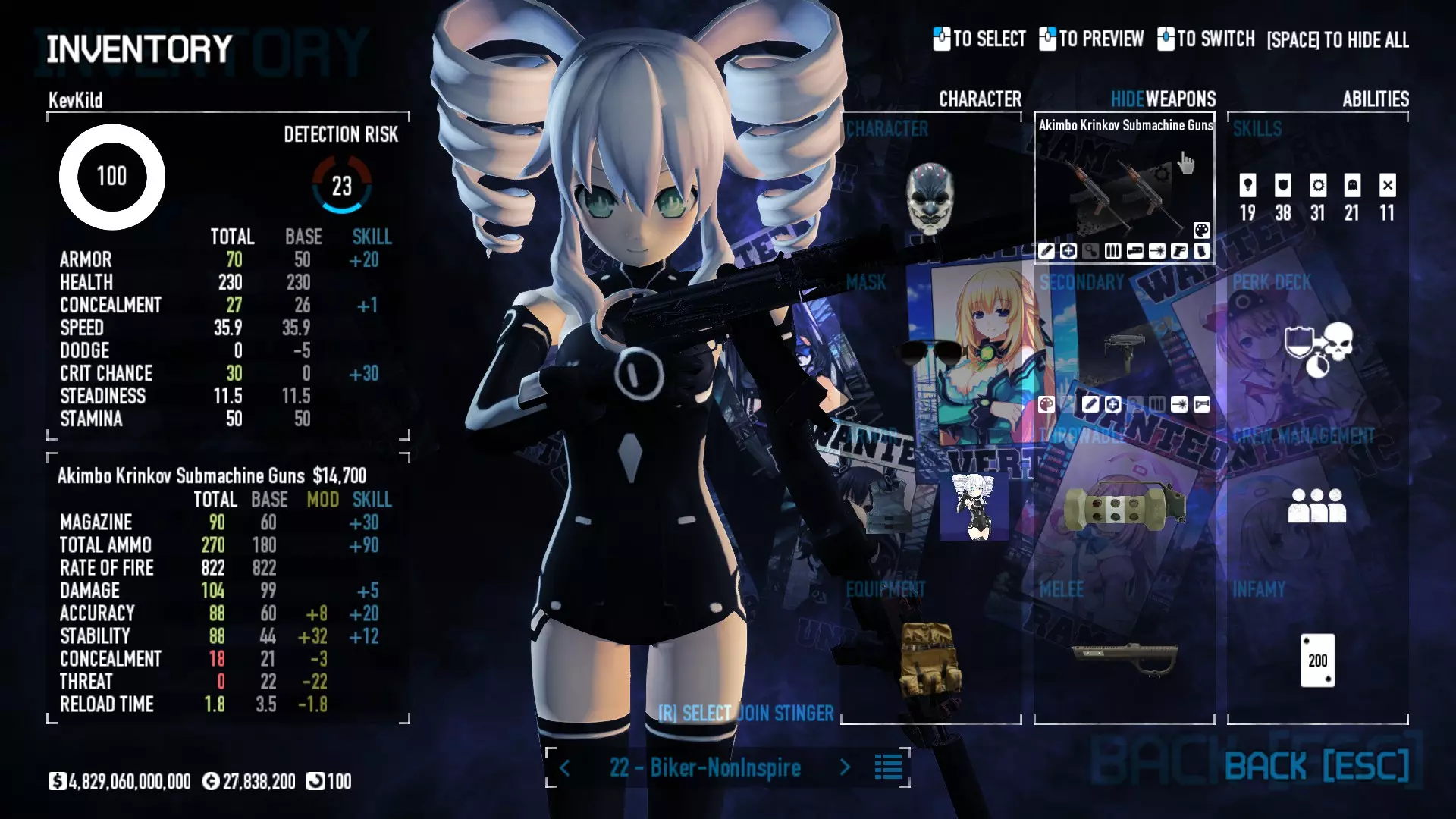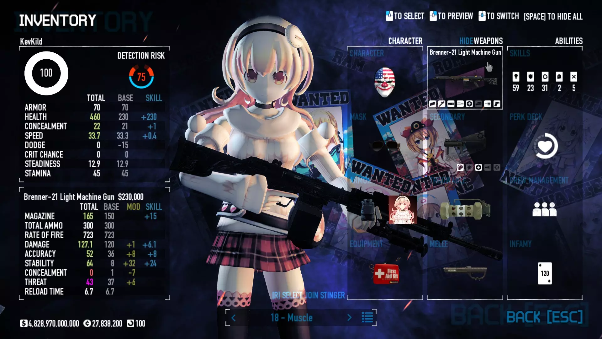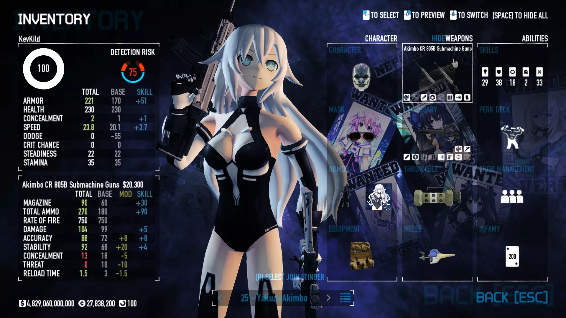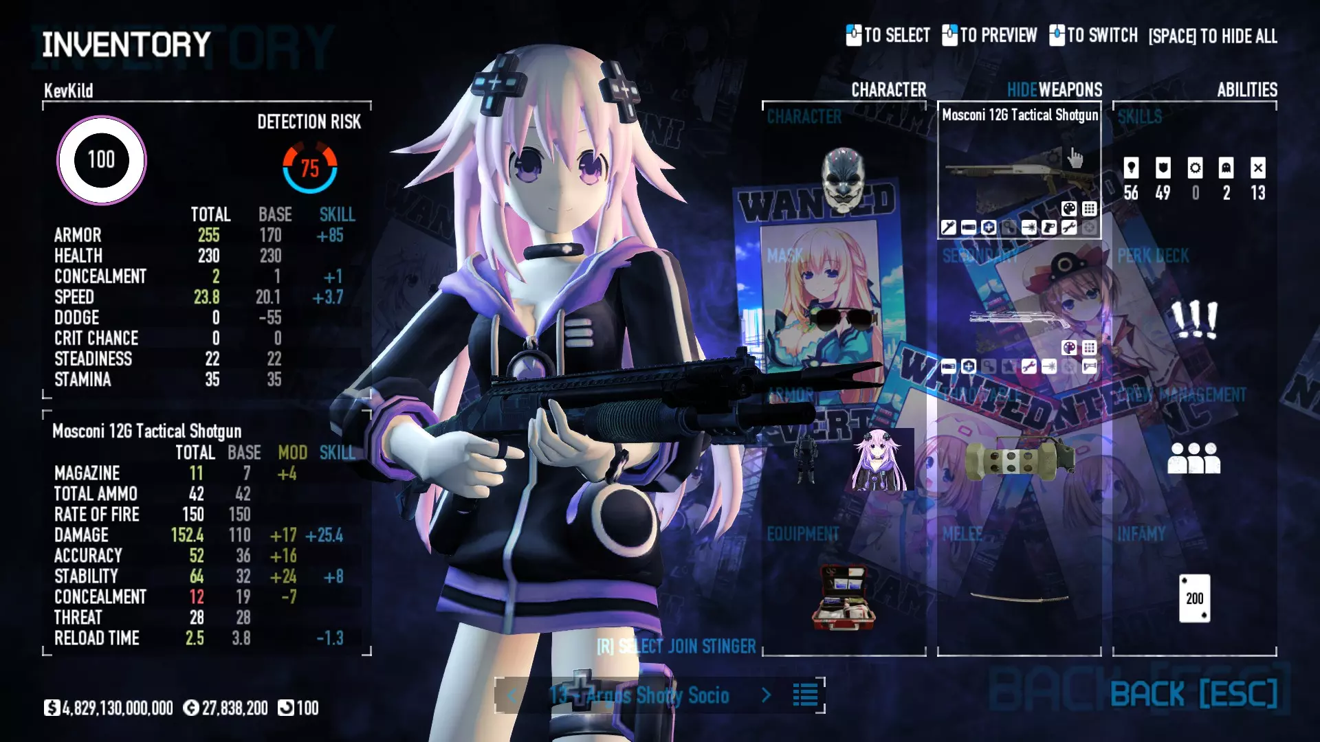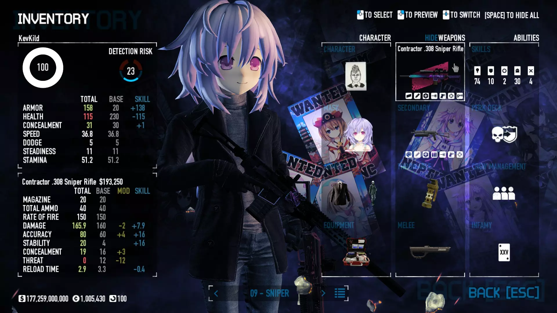 Secondary Weapon Grimm 12G Shotgun Attachments Dragon’s Breath Round Shark Teeth Nozzle Boost – Team Boost Auto Fire LED Combo Big Brother Magazine Compact Holosight – Dot 2Equipment Armor: Suit Deployable: Trip Mine & Doctor Bag Throwable: Concussion Grenades Melee: Buzzer/Electrical Brass KnucklesNotes & Videos Carry Potential: Transports Only https://pd2builder.netlify.app/?s=1G1e10d0e110383g00120150-4h00&p=e&a=0&t=4&d=3 You could run this as support build for saw-able heists, but wasted DPS potential Mod Link Section Moved my PasteBin section here for convenience and if anyone wants to play with above builds. == mods Folder == SuperBLT[superblt.znix.xyz] BeardLib[modworkshop.net] VanillaHUD Plus[modworkshop.net] VoidUI[modworkshop.net] FreeFlightCam[modworkshop.net] Low Violence Mode[modworkshop.net] Music Control[modworkshop.net] AntiCrash[pd2mods.z77.fr] NoScreenShake(Shooting)[modworkshop.net] Cloaker Camera Kick Disable[modworkshop.net] More Skill/Profiles[modworkshop.net] BagTilt Disable[modworkshop.net] CrimeNET Border removal[modworkshop.net] Skill Tree Background[modworkshop.net] Tast's DayNight Changes[modworkshop.net] LabRats Blankets[modworkshop.net] AutoFire SFX Fix[modworkshop.net] Sensitivity Fixer[modworkshop.net] No Down Counter[modworkshop.net] Mute Menu Contractors[modworkshop.net] == Assets Mod_overrides == Neptunia HyperHud[modworkshop.net] Neptunia Diff icons[modworkshop.net] Neptune Jacket Skin[modworkshop.net] Hoxton Evidence Room[modworkshop.net] Neptunia Breakout Screen[modworkshop.net] Neptunia GAGE Pack[modworkshop.net] Neptunia Alesso Heist[modworkshop.net] Neptunia Bank Texture[modworkshop.net] Neptunia Medic Bag[modworkshop.net] Neptunia FirstAid Kit[modworkshop.net] Neptunia Graffiti[modworkshop.net] Neptunia Trashbins[modworkshop.net] Neptunia Infamy Card[modworkshop.net] Neptunia PC screen[modworkshop.net] Neptunia Van[modworkshop.net] Nep Cloaker Spawn SFX[modworkshop.net] Nekopara Artgallery[modworkshop.net] Nekopara Lootbag[modworkshop.net] Nekopara Icons[modworkshop.net] Astolfo Body Bag[modworkshop.net] Astolfo Body Bag Case[modworkshop.net] BL2 Text/Hud[modworkshop.net] Touhou Interaction Circle - Modifed[modworkshop.net] Hikari Takanashi Glass SFX[modworkshop.net] 199.5 Sleeve Fix[modworkshop.net] HD-Texture Project[modworkshop.net] KizunaAI Sydney SFX[modworkshop.net] KizunaAI Mask Standalone[modworkshop.net] Sora AoS2 Mask Standalone[modworkshop.net] Shimakaze Mask Replacement[modworkshop.net] Neptunia Masks Standalone[modworkshop.net] Neptunia Masks - Teamwork[modworkshop.net] COD:MW2 Intervention Sound[modworkshop.net] COD:MW2 .50 Cal Sound[modworkshop.net] COD:MW2 M1014 Sound[modworkshop.net] COD:MW 2019 Gun SFX[modworkshop.net] Astolfo ICU drill[modworkshop.net] OwO Dozer[modworkshop.net] Portal Sentry[modworkshop.net] SONG:Touhou Pack1[modworkshop.net] SONG:Touhou Pack2[modworkshop.net] Ahegao Universal Skin[modworkshop.net] FEDNET Weapon Icons LEFT[modworkshop.net] Nepgear Commando 101[modworkshop.net] DSOD Nisa Mask Charm[modworkshop.net] DSOD Nisa Mask[modworkshop.net] KS12 Spinny Reload[modworkshop.net] LAS[modworkshop.net] Kizuna AI LAS[modworkshop.net] Gawr Gura LAS[modworkshop.net] Neptunia Characters LAS[modworkshop.net] Neptunia Characters LAS2[modworkshop.net] All my other mod_overrides MediaFire links are blocked by Steam. You can get them on my YouTube mod list video showcase. - Briefing Video removal - SecurityCams, First Weeb Bank, Loading Screens 2019 - Nisa Mask - Nisa Mask (WithCape) - Nisa Pissed Mask - Nisa Sword Buzzer - Nisa Sword IcePick - Prinny Concussion ~ Created Mods ~ TripMine Houston[modworkshop.net] TripMine OOF[modworkshop.net] Cirno Theme remix[modworkshop.net] Marisa Theme remix[modworkshop.net] AoS2 Expendables[modworkshop.net] Remilia Theme remix[modworkshop.net] Momiji Theme remix[modworkshop.net] Flandre Theme remix[modworkshop.net] Grand Design[modworkshop.net] Other Great DSOD Guides My recommendation for other DSOD guides on Steam, as well as their content.