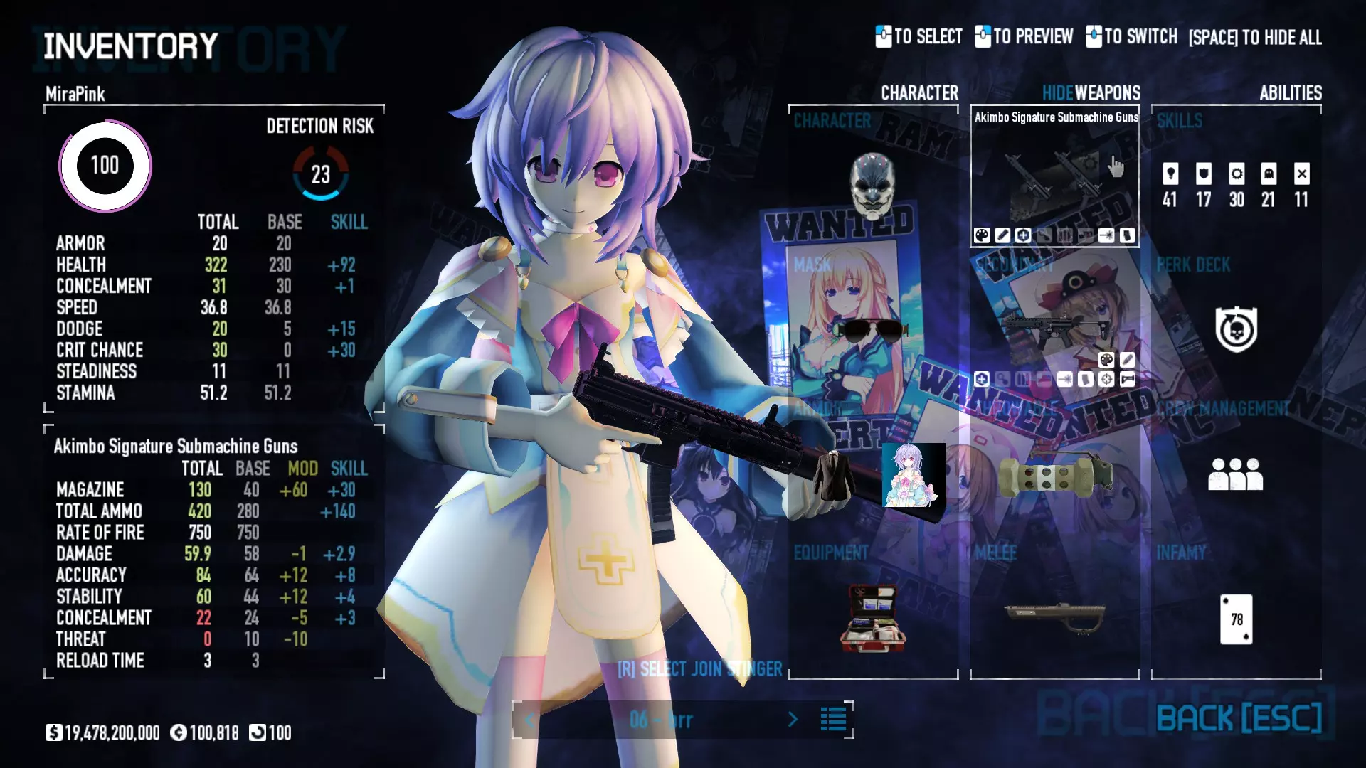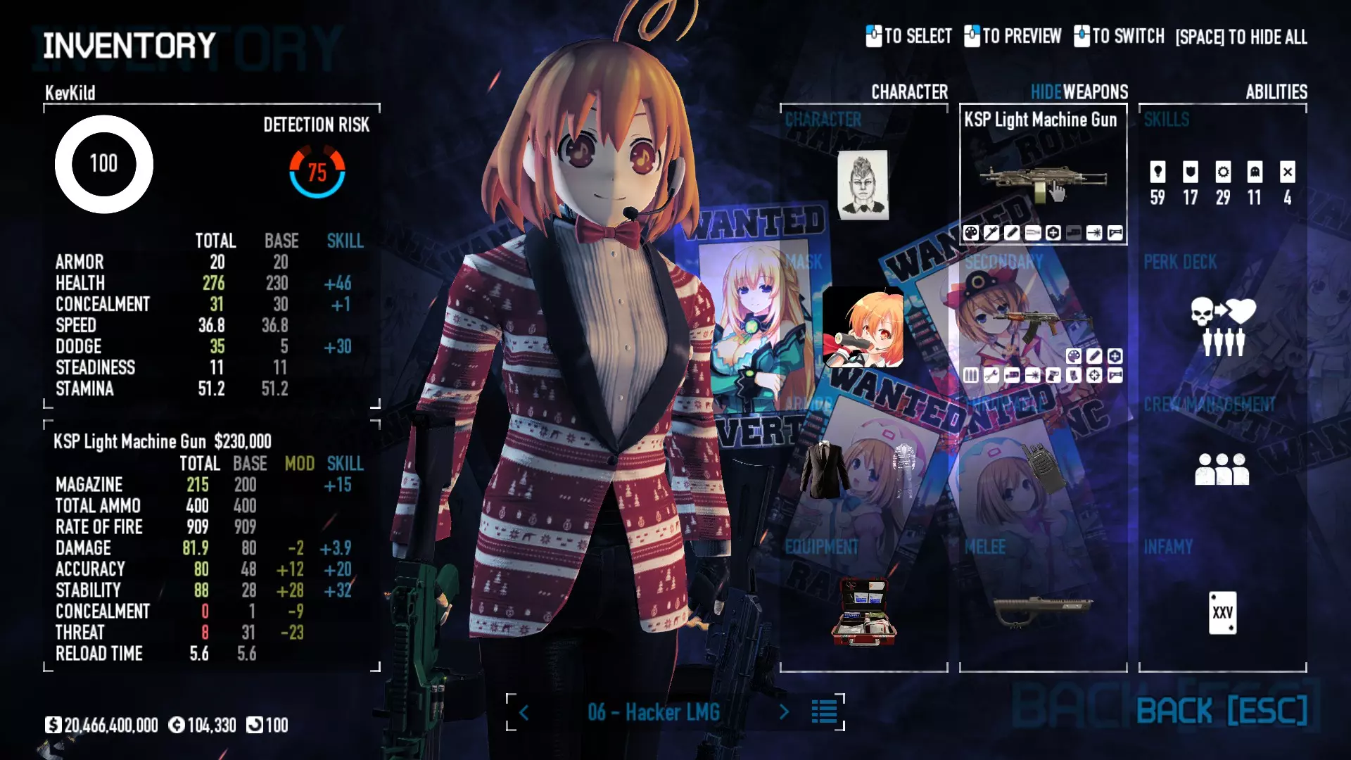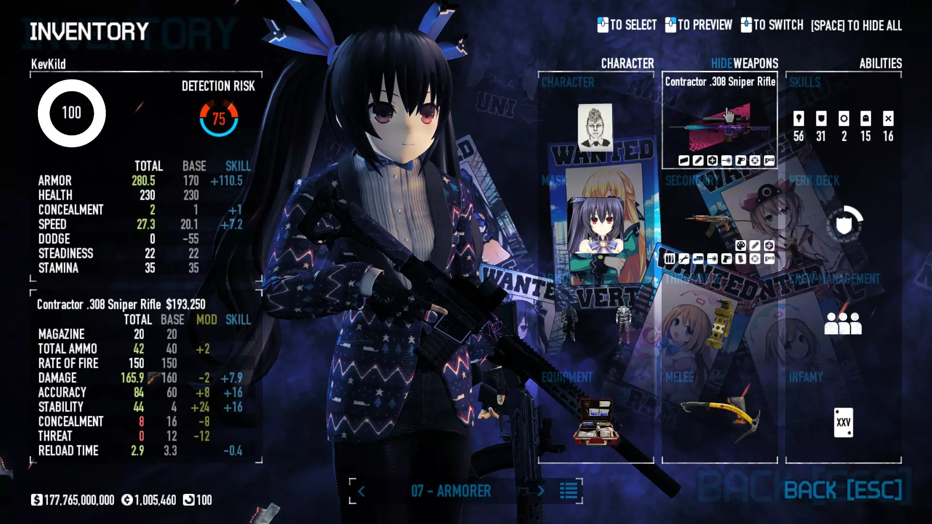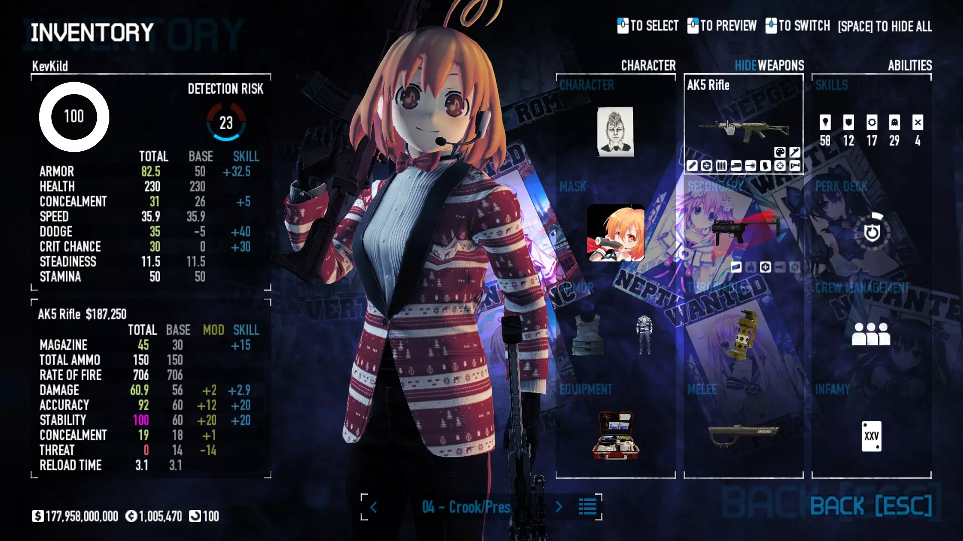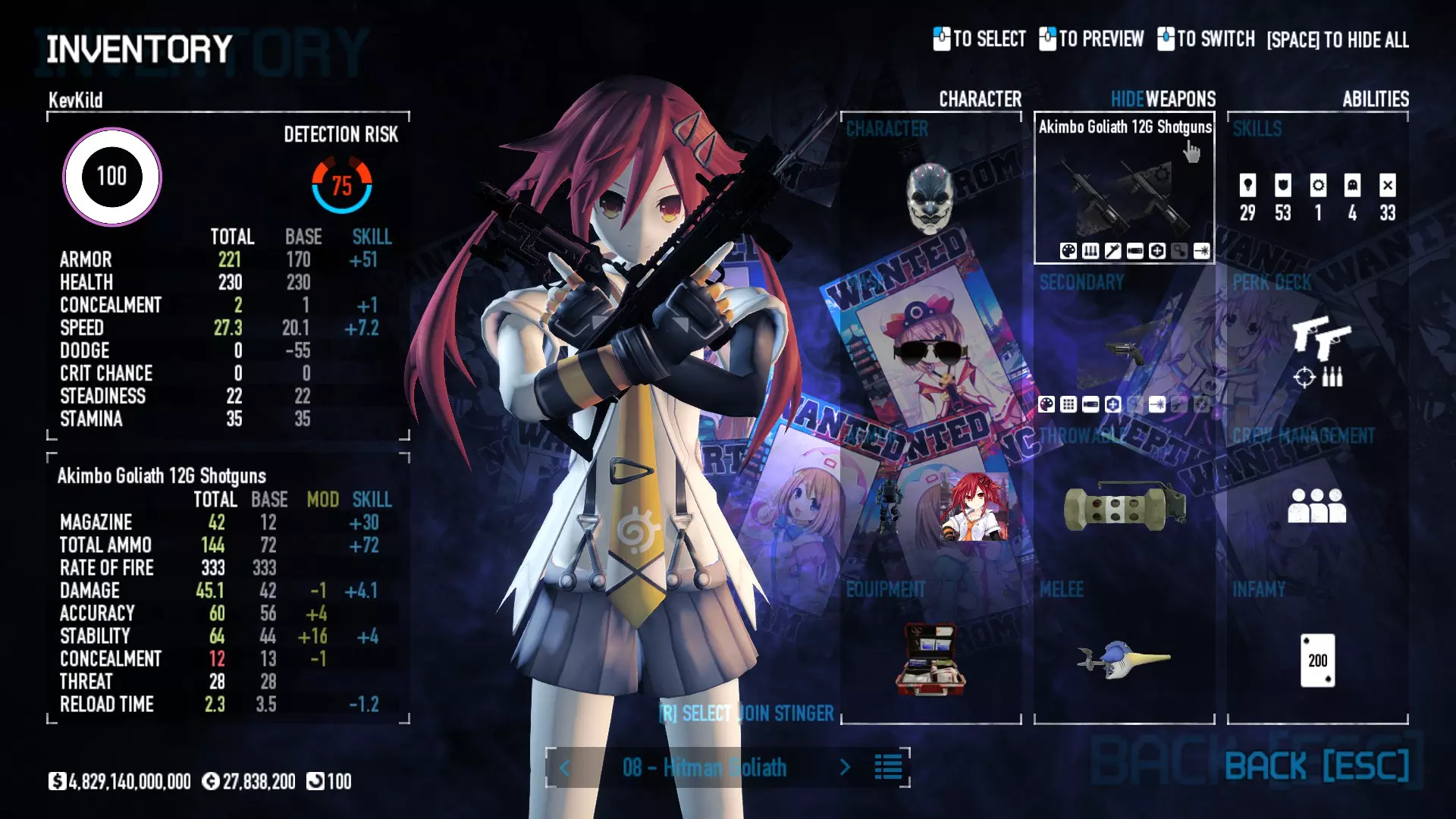Secondary Weapon Grimm 12G Shotgun Attachments Dragon’s Breath Round Shark Teeth Nozzle Boost – Team Boost Auto Fire LED Combo Big Brother Magazine Compact Holosight – Dot 2Equipment Armor: Suit Deployable: Trip Mine & Doctor Bag Throwable: Concussion Grenades Melee: Buzzer/Electrical Brass KnucklesNotes & Videos Carry Potential: Transports Only https://pd2builder.netlify.app/?s=1G1e10d0e110383g00120150-4h00&p=e&a=0&t=4&d=3 You could run this as support build for saw-able heists, but wasted DPS potential Mod Link Section Moved my PasteBin section here for convenience and if anyone wants to play with above builds. == mods Folder == SuperBLT[superblt.znix.xyz] BeardLib[modworkshop.net] VanillaHUD Plus[modworkshop.net] VoidUI[modworkshop.net] FreeFlightCam[modworkshop.net] Low Violence Mode[modworkshop.net] Music Control[modworkshop.net] AntiCrash[pd2mods.z77.fr] NoScreenShake(Shooting)[modworkshop.net] Cloaker Camera Kick Disable[modworkshop.net] More Skill/Profiles[modworkshop.net] BagTilt Disable[modworkshop.net] CrimeNET Border removal[modworkshop.net] Skill Tree Background[modworkshop.net] Tast's DayNight Changes[modworkshop.net] LabRats Blankets[modworkshop.net] AutoFire SFX Fix[modworkshop.net] Sensitivity Fixer[modworkshop.net] No Down Counter[modworkshop.net] Mute Menu Contractors[modworkshop.net] == Assets Mod_overrides == Neptunia HyperHud[modworkshop.net] Neptunia Diff icons[modworkshop.net] Neptune Jacket Skin[modworkshop.net] Hoxton Evidence Room[modworkshop.net] Neptunia Breakout Screen[modworkshop.net] Neptunia GAGE Pack[modworkshop.net] Neptunia Alesso Heist[modworkshop.net] Neptunia Bank Texture[modworkshop.net] Neptunia Medic Bag[modworkshop.net] Neptunia FirstAid Kit[modworkshop.net] Neptunia Graffiti[modworkshop.net] Neptunia Trashbins[modworkshop.net] Neptunia Infamy Card[modworkshop.net] Neptunia PC screen[modworkshop.net] Neptunia Van[modworkshop.net] Nep Cloaker Spawn SFX[modworkshop.net] Nekopara Artgallery[modworkshop.net] Nekopara Lootbag[modworkshop.net] Nekopara Icons[modworkshop.net] Astolfo Body Bag[modworkshop.net] Astolfo Body Bag Case[modworkshop.net] BL2 Text/Hud[modworkshop.net] Touhou Interaction Circle - Modifed[modworkshop.net] Hikari Takanashi Glass SFX[modworkshop.net] 199.5 Sleeve Fix[modworkshop.net] HD-Texture Project[modworkshop.net] KizunaAI Sydney SFX[modworkshop.net] KizunaAI Mask Standalone[modworkshop.net] Sora AoS2 Mask Standalone[modworkshop.net] Shimakaze Mask Replacement[modworkshop.net] Neptunia Masks Standalone[modworkshop.net] Neptunia Masks - Teamwork[modworkshop.net] COD:MW2 Intervention Sound[modworkshop.net] COD:MW2 .50 Cal Sound[modworkshop.net] COD:MW2 M1014 Sound[modworkshop.net] COD:MW 2019 Gun SFX[modworkshop.net] Astolfo ICU drill[modworkshop.net] OwO Dozer[modworkshop.net] Portal Sentry[modworkshop.net] SONG:Touhou Pack1[modworkshop.net] SONG:Touhou Pack2[modworkshop.net] Ahegao Universal Skin[modworkshop.net] FEDNET Weapon Icons LEFT[modworkshop.net] Nepgear Commando 101[modworkshop.net] DSOD Nisa Mask Charm[modworkshop.net] DSOD Nisa Mask[modworkshop.net] KS12 Spinny Reload[modworkshop.net] LAS[modworkshop.net] Kizuna AI LAS[modworkshop.net] Gawr Gura LAS[modworkshop.net] Neptunia Characters LAS[modworkshop.net] Neptunia Characters LAS2[modworkshop.net] All my other mod_overrides MediaFire links are blocked by Steam. You can get them on my YouTube mod list video showcase. - Briefing Video removal - SecurityCams, First Weeb Bank, Loading Screens 2019 - Nisa Mask - Nisa Mask (WithCape) - Nisa Pissed Mask - Nisa Sword Buzzer - Nisa Sword IcePick - Prinny Concussion ~ Created Mods ~ TripMine Houston[modworkshop.net] TripMine OOF[modworkshop.net] Cirno Theme remix[modworkshop.net] Marisa Theme remix[modworkshop.net] AoS2 Expendables[modworkshop.net] Remilia Theme remix[modworkshop.net] Momiji Theme remix[modworkshop.net] Flandre Theme remix[modworkshop.net] Grand Design[modworkshop.net] Other Great DSOD Guides My recommendation for other DSOD guides on Steam, as well as their content.