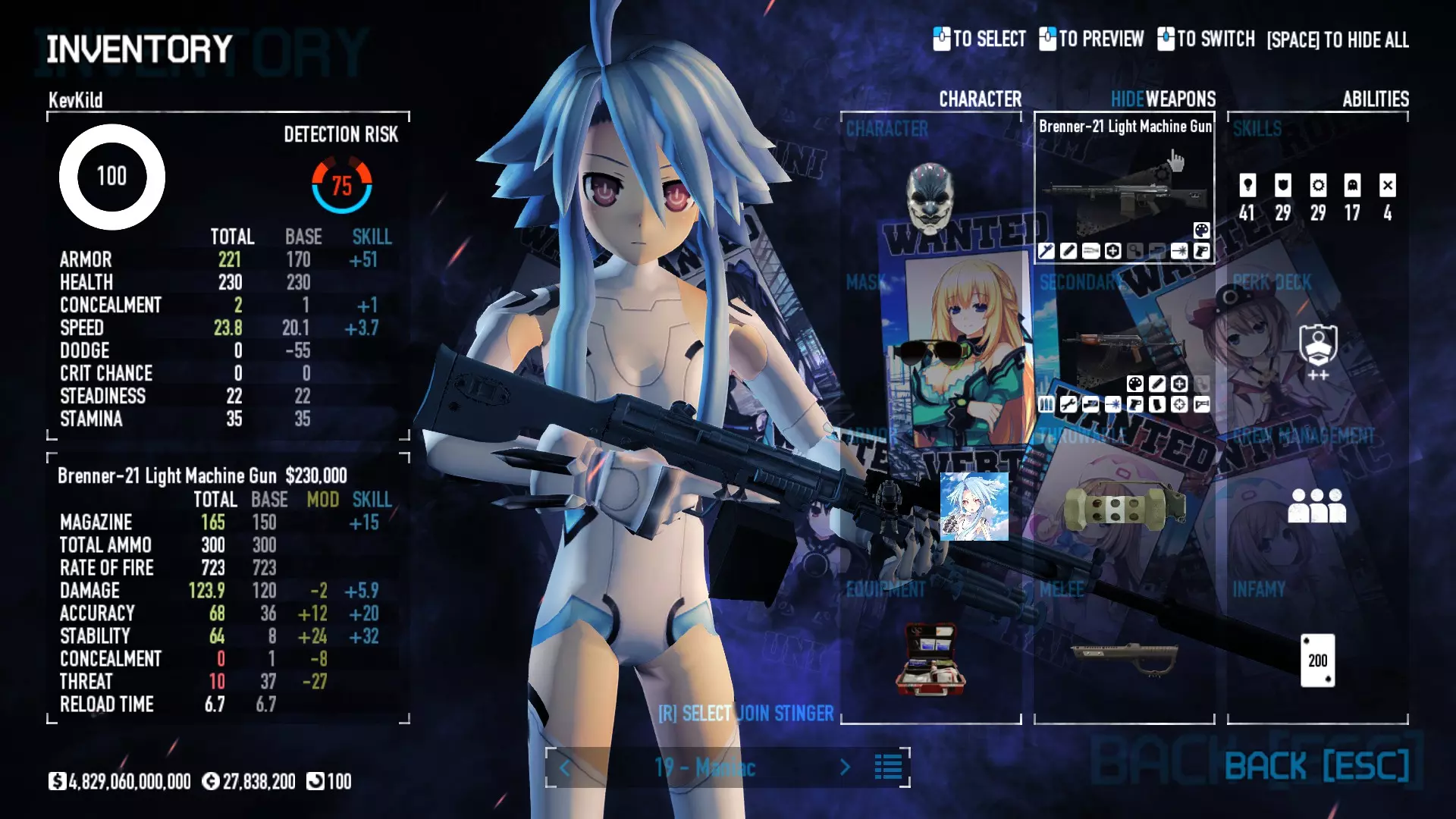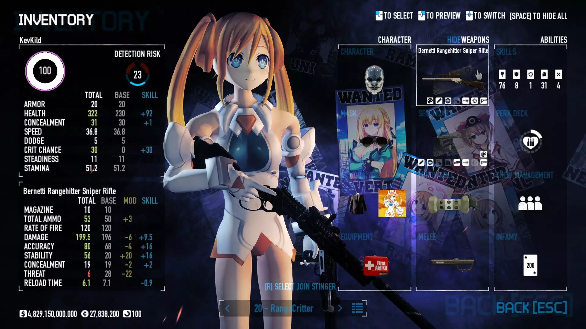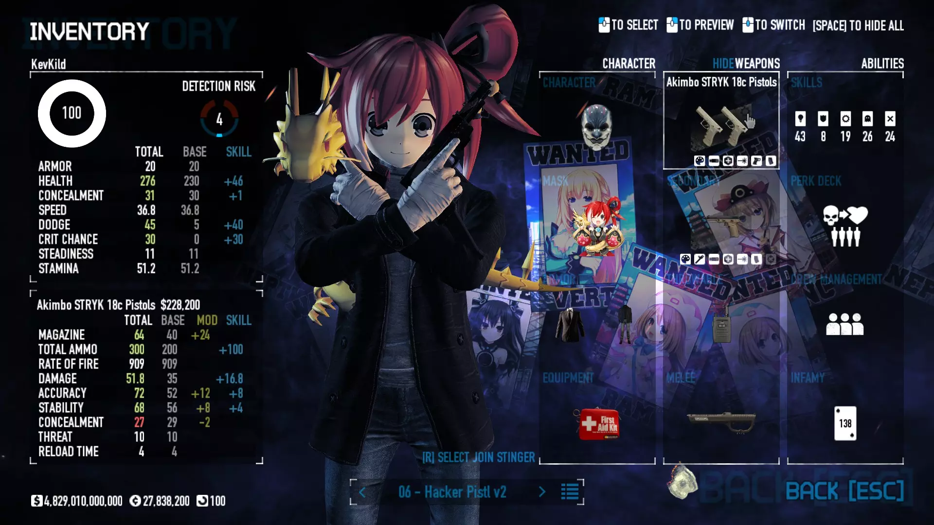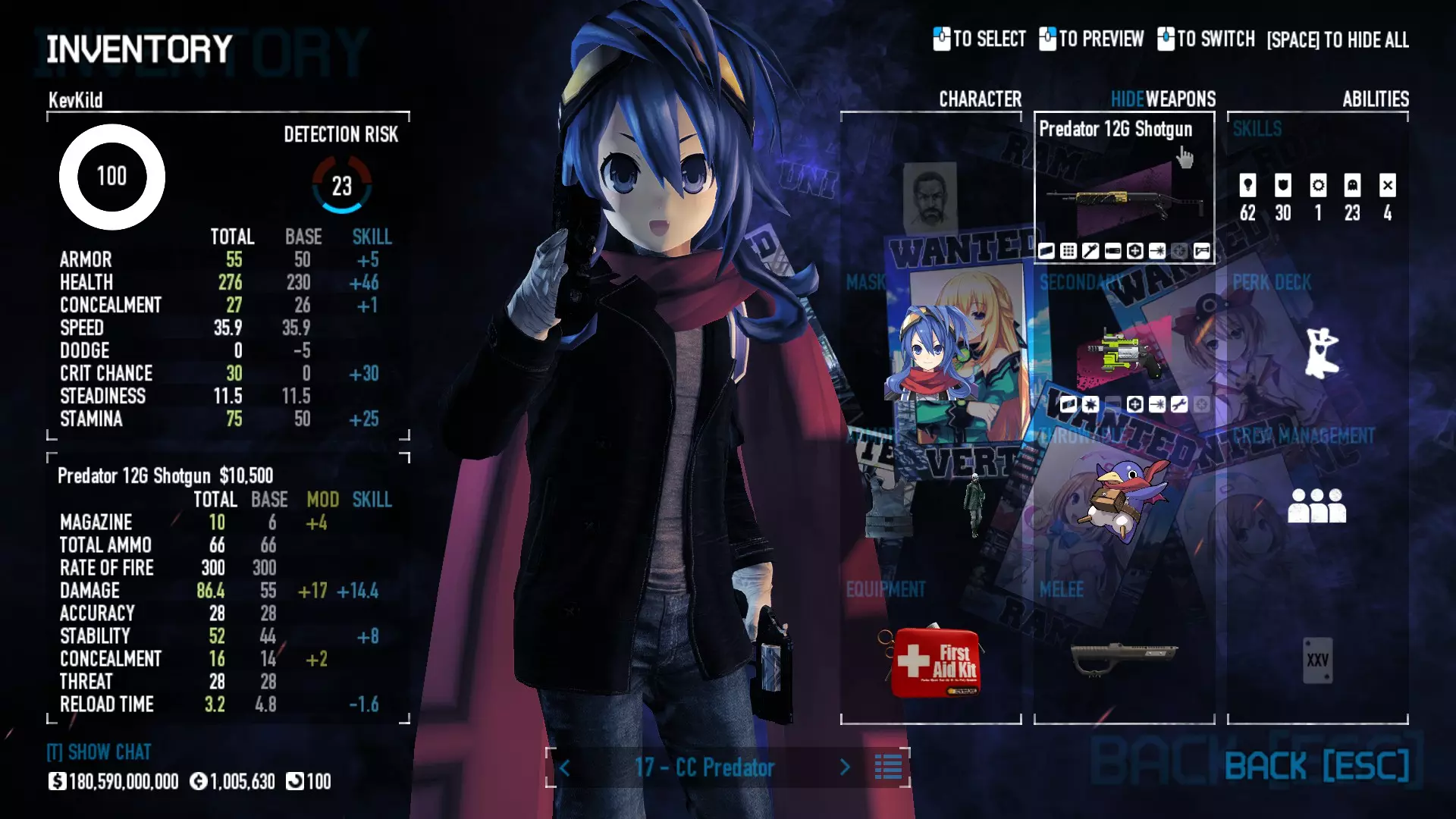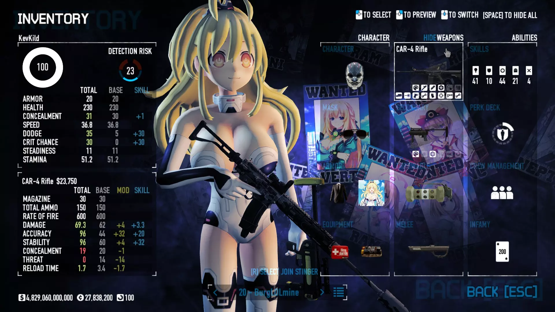 Secondary Weapon Grimm 12G Shotgun Attachments Dragon’s Breath Round Shark Teeth Nozzle Boost – Team Boost Auto Fire LED Combo Big Brother Magazine Compact Holosight – Dot 2Equipment Armor: Suit Deployable: Trip Mine & Doctor Bag Throwable: Concussion Grenades Melee: Buzzer/Electrical Brass KnucklesNotes & Videos Carry Potential: Transports Only https://pd2builder.netlify.app/?s=1G1e10d0e110383g00120150-4h00&p=e&a=0&t=4&d=3 You could run this as support build for saw-able heists, but wasted DPS potential Mod Link Section Moved my PasteBin section here for convenience and if anyone wants to play with above builds. == mods Folder == SuperBLT[superblt.znix.xyz] BeardLib[modworkshop.net] VanillaHUD Plus[modworkshop.net] VoidUI[modworkshop.net] FreeFlightCam[modworkshop.net] Low Violence Mode[modworkshop.net] Music Control[modworkshop.net] AntiCrash[pd2mods.z77.fr] NoScreenShake(Shooting)[modworkshop.net] Cloaker Camera Kick Disable[modworkshop.net] More Skill/Profiles[modworkshop.net] BagTilt Disable[modworkshop.net] CrimeNET Border removal[modworkshop.net] Skill Tree Background[modworkshop.net] Tast's DayNight Changes[modworkshop.net] LabRats Blankets[modworkshop.net] AutoFire SFX Fix[modworkshop.net] Sensitivity Fixer[modworkshop.net] No Down Counter[modworkshop.net] Mute Menu Contractors[modworkshop.net] == Assets Mod_overrides == Neptunia HyperHud[modworkshop.net] Neptunia Diff icons[modworkshop.net] Neptune Jacket Skin[modworkshop.net] Hoxton Evidence Room[modworkshop.net] Neptunia Breakout Screen[modworkshop.net] Neptunia GAGE Pack[modworkshop.net] Neptunia Alesso Heist[modworkshop.net] Neptunia Bank Texture[modworkshop.net] Neptunia Medic Bag[modworkshop.net] Neptunia FirstAid Kit[modworkshop.net] Neptunia Graffiti[modworkshop.net] Neptunia Trashbins[modworkshop.net] Neptunia Infamy Card[modworkshop.net] Neptunia PC screen[modworkshop.net] Neptunia Van[modworkshop.net] Nep Cloaker Spawn SFX[modworkshop.net] Nekopara Artgallery[modworkshop.net] Nekopara Lootbag[modworkshop.net] Nekopara Icons[modworkshop.net] Astolfo Body Bag[modworkshop.net] Astolfo Body Bag Case[modworkshop.net] BL2 Text/Hud[modworkshop.net] Touhou Interaction Circle - Modifed[modworkshop.net] Hikari Takanashi Glass SFX[modworkshop.net] 199.5 Sleeve Fix[modworkshop.net] HD-Texture Project[modworkshop.net] KizunaAI Sydney SFX[modworkshop.net] KizunaAI Mask Standalone[modworkshop.net] Sora AoS2 Mask Standalone[modworkshop.net] Shimakaze Mask Replacement[modworkshop.net] Neptunia Masks Standalone[modworkshop.net] Neptunia Masks - Teamwork[modworkshop.net] COD:MW2 Intervention Sound[modworkshop.net] COD:MW2 .50 Cal Sound[modworkshop.net] COD:MW2 M1014 Sound[modworkshop.net] COD:MW 2019 Gun SFX[modworkshop.net] Astolfo ICU drill[modworkshop.net] OwO Dozer[modworkshop.net] Portal Sentry[modworkshop.net] SONG:Touhou Pack1[modworkshop.net] SONG:Touhou Pack2[modworkshop.net] Ahegao Universal Skin[modworkshop.net] FEDNET Weapon Icons LEFT[modworkshop.net] Nepgear Commando 101[modworkshop.net] DSOD Nisa Mask Charm[modworkshop.net] DSOD Nisa Mask[modworkshop.net] KS12 Spinny Reload[modworkshop.net] LAS[modworkshop.net] Kizuna AI LAS[modworkshop.net] Gawr Gura LAS[modworkshop.net] Neptunia Characters LAS[modworkshop.net] Neptunia Characters LAS2[modworkshop.net] All my other mod_overrides MediaFire links are blocked by Steam. You can get them on my YouTube mod list video showcase. - Briefing Video removal - SecurityCams, First Weeb Bank, Loading Screens 2019 - Nisa Mask - Nisa Mask (WithCape) - Nisa Pissed Mask - Nisa Sword Buzzer - Nisa Sword IcePick - Prinny Concussion ~ Created Mods ~ TripMine Houston[modworkshop.net] TripMine OOF[modworkshop.net] Cirno Theme remix[modworkshop.net] Marisa Theme remix[modworkshop.net] AoS2 Expendables[modworkshop.net] Remilia Theme remix[modworkshop.net] Momiji Theme remix[modworkshop.net] Flandre Theme remix[modworkshop.net] Grand Design[modworkshop.net] Other Great DSOD Guides My recommendation for other DSOD guides on Steam, as well as their content.