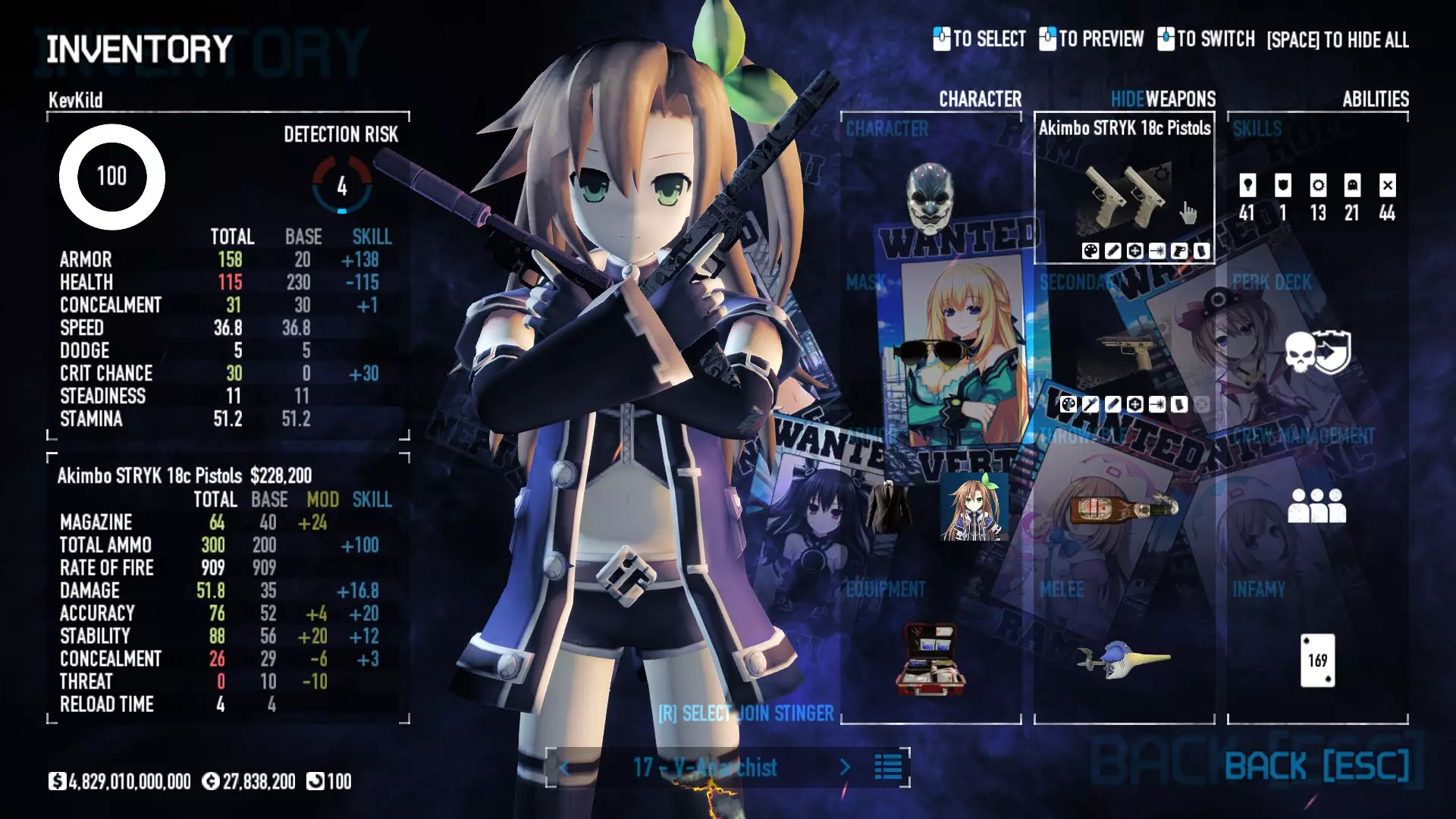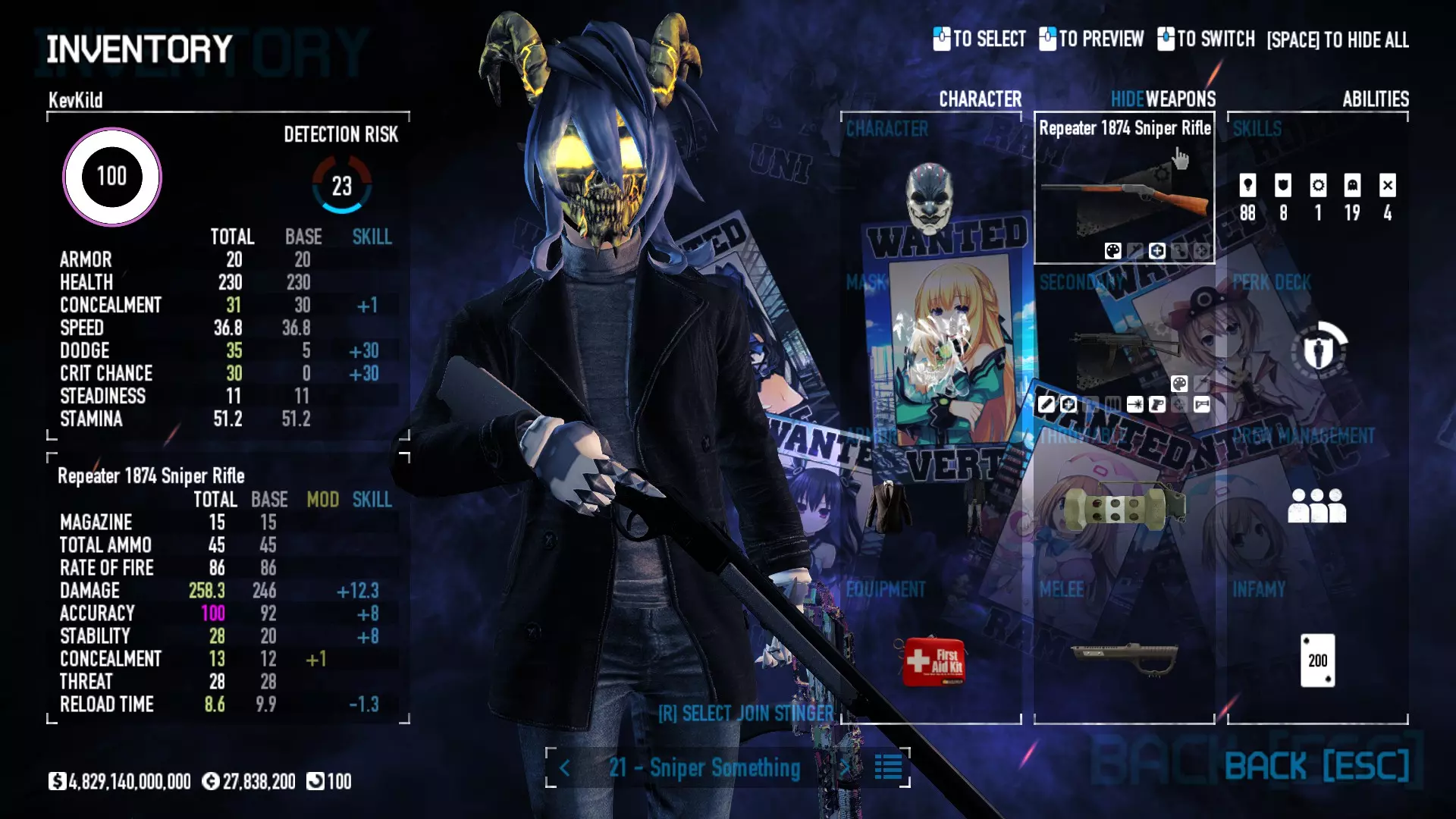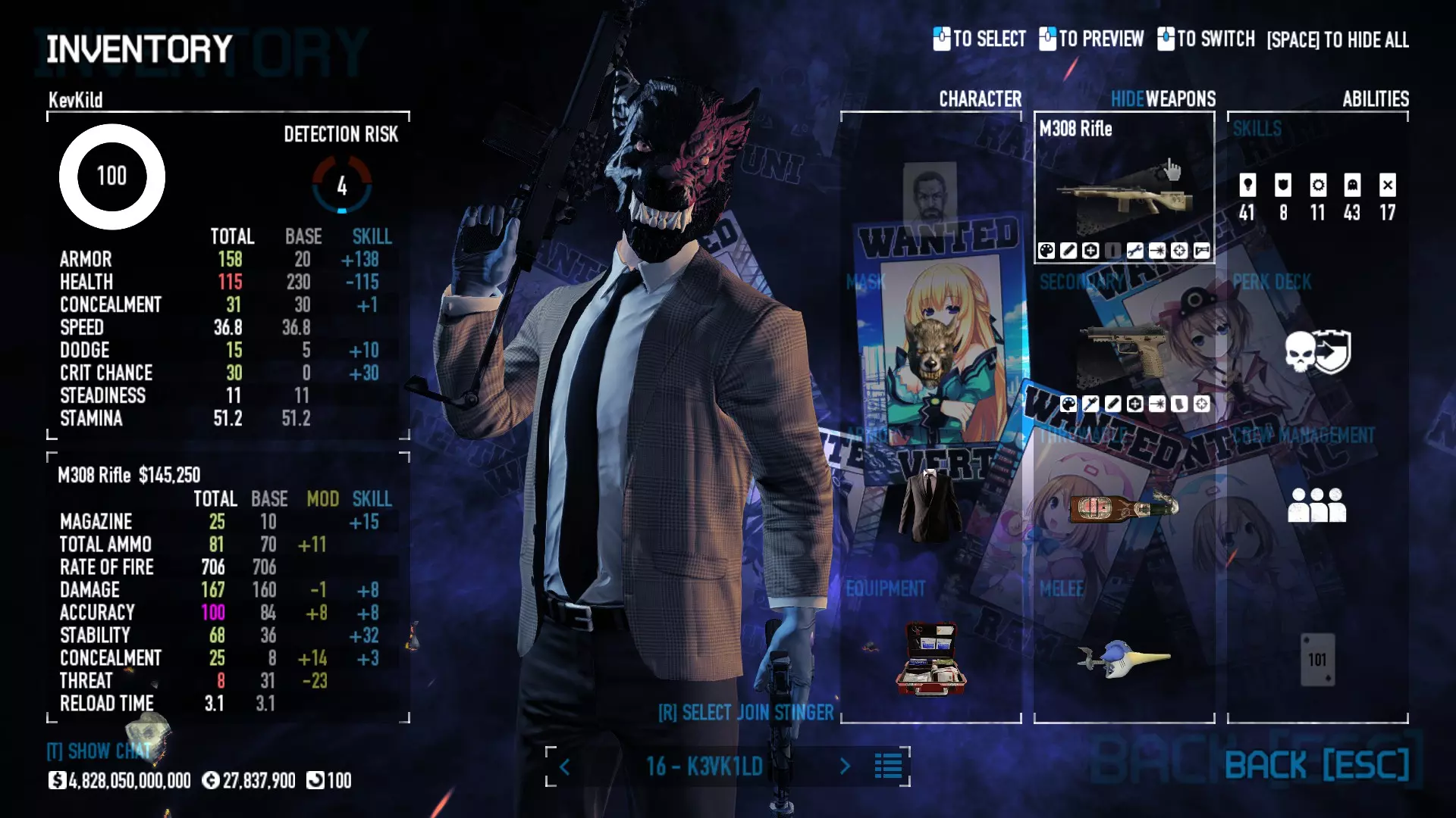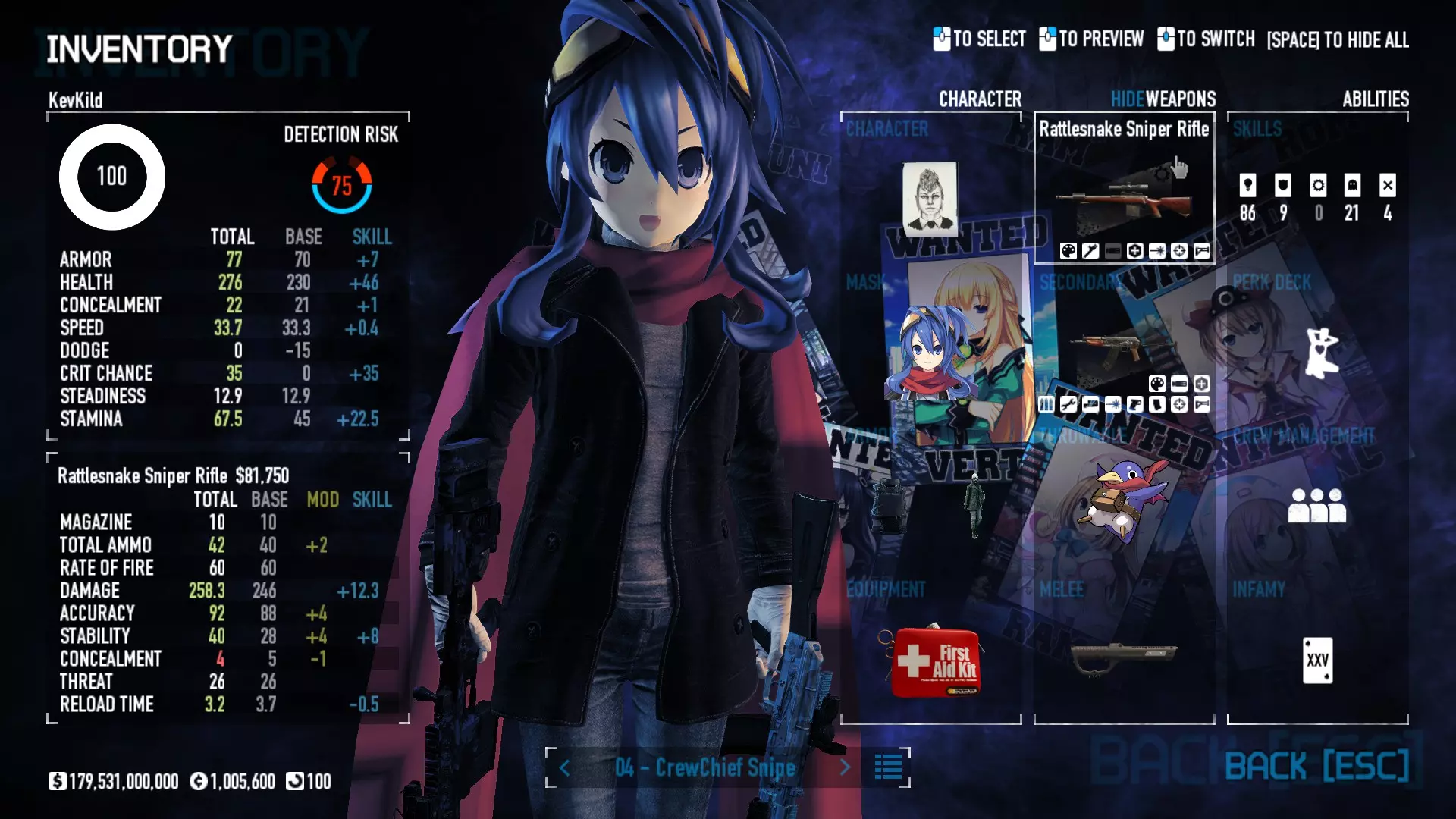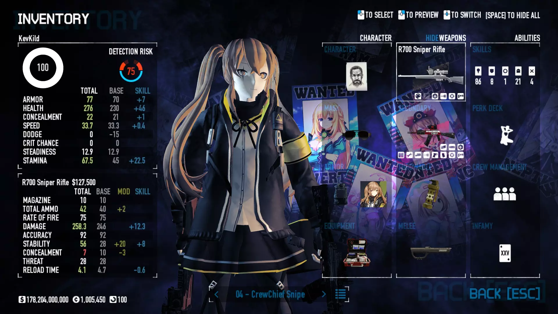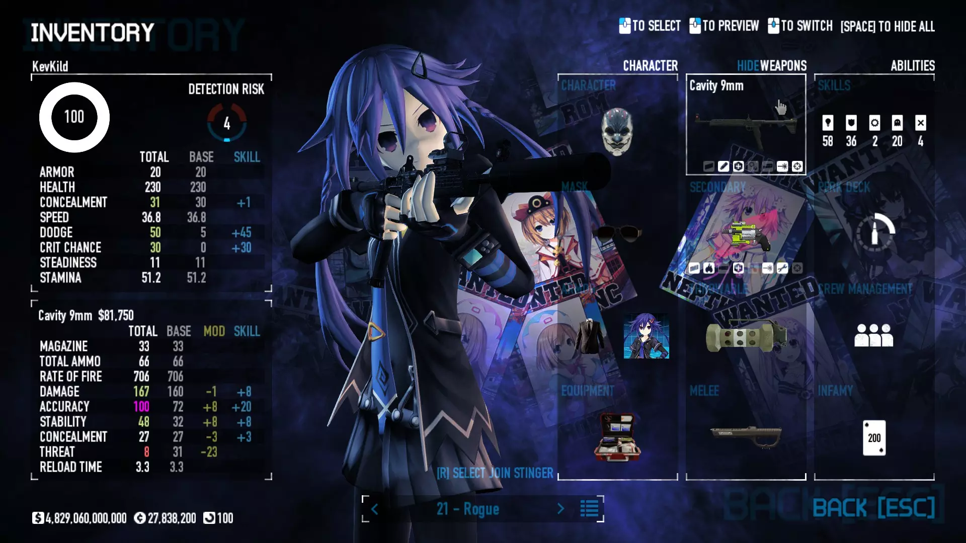 Secondary Weapon Grimm 12G Shotgun Attachments Dragon’s Breath Round Shark Teeth Nozzle Boost – Team Boost Auto Fire LED Combo Big Brother Magazine Compact Holosight – Dot 2Equipment Armor: Suit Deployable: Trip Mine & Doctor Bag Throwable: Concussion Grenades Melee: Buzzer/Electrical Brass KnucklesNotes & Videos Carry Potential: Transports Only https://pd2builder.netlify.app/?s=1G1e10d0e110383g00120150-4h00&p=e&a=0&t=4&d=3 You could run this as support build for saw-able heists, but wasted DPS potential Mod Link Section Moved my PasteBin section here for convenience and if anyone wants to play with above builds. == mods Folder == SuperBLT[superblt.znix.xyz] BeardLib[modworkshop.net] VanillaHUD Plus[modworkshop.net] VoidUI[modworkshop.net] FreeFlightCam[modworkshop.net] Low Violence Mode[modworkshop.net] Music Control[modworkshop.net] AntiCrash[pd2mods.z77.fr] NoScreenShake(Shooting)[modworkshop.net] Cloaker Camera Kick Disable[modworkshop.net] More Skill/Profiles[modworkshop.net] BagTilt Disable[modworkshop.net] CrimeNET Border removal[modworkshop.net] Skill Tree Background[modworkshop.net] Tast's DayNight Changes[modworkshop.net] LabRats Blankets[modworkshop.net] AutoFire SFX Fix[modworkshop.net] Sensitivity Fixer[modworkshop.net] No Down Counter[modworkshop.net] Mute Menu Contractors[modworkshop.net] == Assets Mod_overrides == Neptunia HyperHud[modworkshop.net] Neptunia Diff icons[modworkshop.net] Neptune Jacket Skin[modworkshop.net] Hoxton Evidence Room[modworkshop.net] Neptunia Breakout Screen[modworkshop.net] Neptunia GAGE Pack[modworkshop.net] Neptunia Alesso Heist[modworkshop.net] Neptunia Bank Texture[modworkshop.net] Neptunia Medic Bag[modworkshop.net] Neptunia FirstAid Kit[modworkshop.net] Neptunia Graffiti[modworkshop.net] Neptunia Trashbins[modworkshop.net] Neptunia Infamy Card[modworkshop.net] Neptunia PC screen[modworkshop.net] Neptunia Van[modworkshop.net] Nep Cloaker Spawn SFX[modworkshop.net] Nekopara Artgallery[modworkshop.net] Nekopara Lootbag[modworkshop.net] Nekopara Icons[modworkshop.net] Astolfo Body Bag[modworkshop.net] Astolfo Body Bag Case[modworkshop.net] BL2 Text/Hud[modworkshop.net] Touhou Interaction Circle - Modifed[modworkshop.net] Hikari Takanashi Glass SFX[modworkshop.net] 199.5 Sleeve Fix[modworkshop.net] HD-Texture Project[modworkshop.net] KizunaAI Sydney SFX[modworkshop.net] KizunaAI Mask Standalone[modworkshop.net] Sora AoS2 Mask Standalone[modworkshop.net] Shimakaze Mask Replacement[modworkshop.net] Neptunia Masks Standalone[modworkshop.net] Neptunia Masks - Teamwork[modworkshop.net] COD:MW2 Intervention Sound[modworkshop.net] COD:MW2 .50 Cal Sound[modworkshop.net] COD:MW2 M1014 Sound[modworkshop.net] COD:MW 2019 Gun SFX[modworkshop.net] Astolfo ICU drill[modworkshop.net] OwO Dozer[modworkshop.net] Portal Sentry[modworkshop.net] SONG:Touhou Pack1[modworkshop.net] SONG:Touhou Pack2[modworkshop.net] Ahegao Universal Skin[modworkshop.net] FEDNET Weapon Icons LEFT[modworkshop.net] Nepgear Commando 101[modworkshop.net] DSOD Nisa Mask Charm[modworkshop.net] DSOD Nisa Mask[modworkshop.net] KS12 Spinny Reload[modworkshop.net] LAS[modworkshop.net] Kizuna AI LAS[modworkshop.net] Gawr Gura LAS[modworkshop.net] Neptunia Characters LAS[modworkshop.net] Neptunia Characters LAS2[modworkshop.net] All my other mod_overrides MediaFire links are blocked by Steam. You can get them on my YouTube mod list video showcase. - Briefing Video removal - SecurityCams, First Weeb Bank, Loading Screens 2019 - Nisa Mask - Nisa Mask (WithCape) - Nisa Pissed Mask - Nisa Sword Buzzer - Nisa Sword IcePick - Prinny Concussion ~ Created Mods ~ TripMine Houston[modworkshop.net] TripMine OOF[modworkshop.net] Cirno Theme remix[modworkshop.net] Marisa Theme remix[modworkshop.net] AoS2 Expendables[modworkshop.net] Remilia Theme remix[modworkshop.net] Momiji Theme remix[modworkshop.net] Flandre Theme remix[modworkshop.net] Grand Design[modworkshop.net] Other Great DSOD Guides My recommendation for other DSOD guides on Steam, as well as their content.