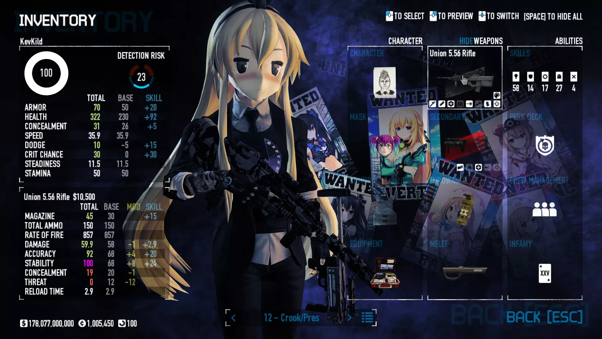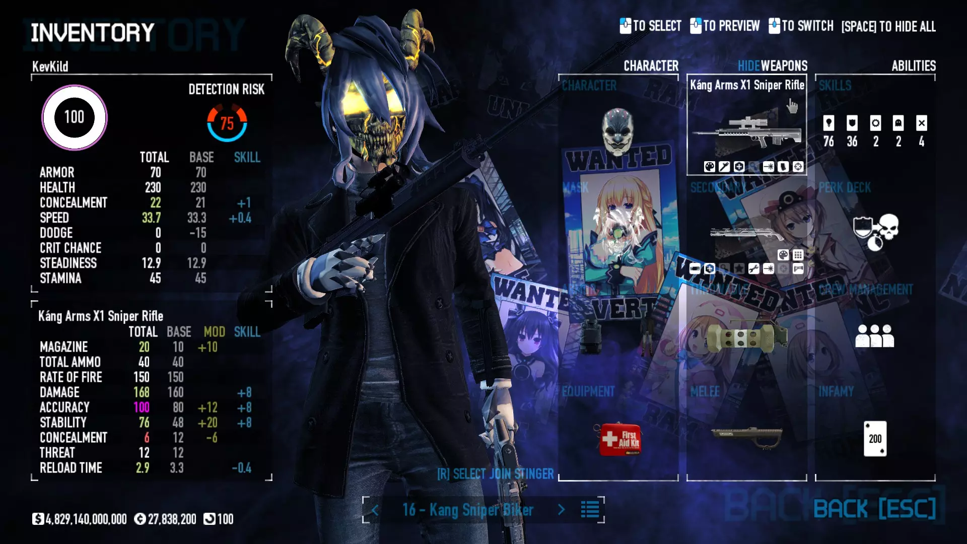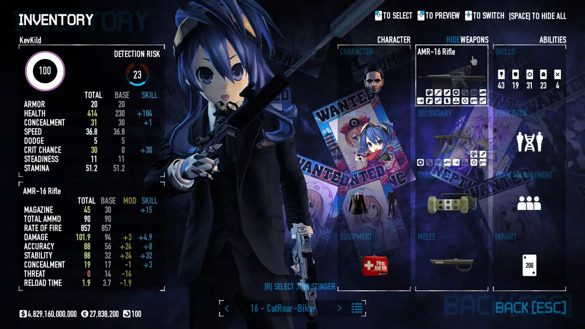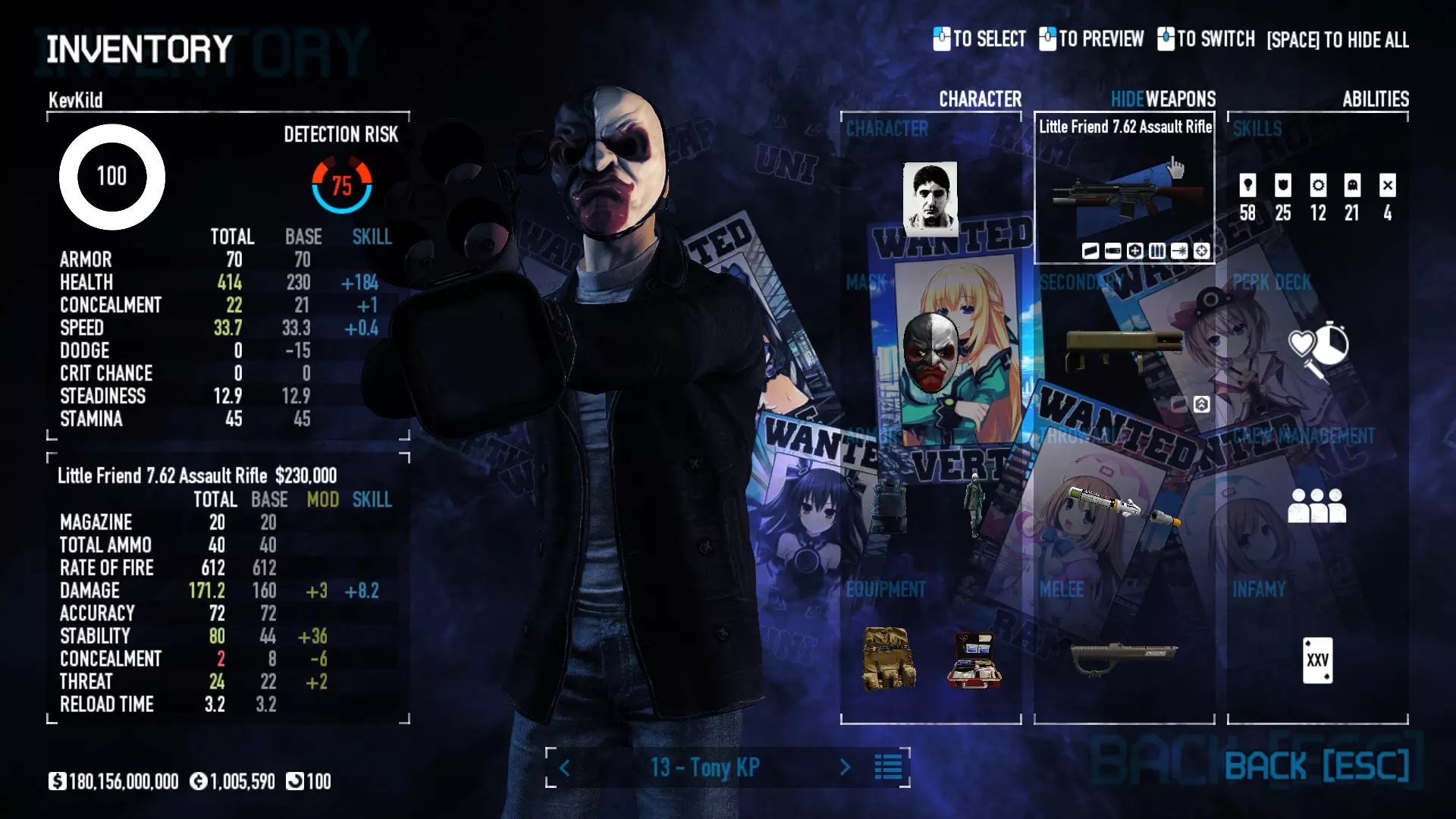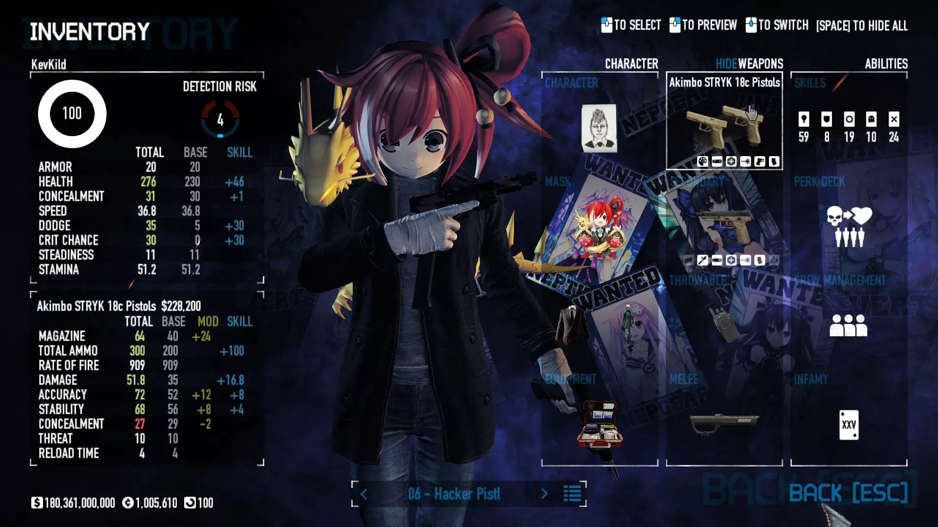Secondary Weapon Grimm 12G Shotgun Attachments Dragon’s Breath Round Shark Teeth Nozzle Boost – Team Boost Auto Fire LED Combo Big Brother Magazine Compact Holosight – Dot 2Equipment Armor: Suit Deployable: Trip Mine & Doctor Bag Throwable: Concussion Grenades Melee: Buzzer/Electrical Brass KnucklesNotes & Videos Carry Potential: Transports Only https://pd2builder.netlify.app/?s=1G1e10d0e110383g00120150-4h00&p=e&a=0&t=4&d=3 You could run this as support build for saw-able heists, but wasted DPS potential Mod Link Section Moved my PasteBin section here for convenience and if anyone wants to play with above builds. == mods Folder == SuperBLT[superblt.znix.xyz] BeardLib[modworkshop.net] VanillaHUD Plus[modworkshop.net] VoidUI[modworkshop.net] FreeFlightCam[modworkshop.net] Low Violence Mode[modworkshop.net] Music Control[modworkshop.net] AntiCrash[pd2mods.z77.fr] NoScreenShake(Shooting)[modworkshop.net] Cloaker Camera Kick Disable[modworkshop.net] More Skill/Profiles[modworkshop.net] BagTilt Disable[modworkshop.net] CrimeNET Border removal[modworkshop.net] Skill Tree Background[modworkshop.net] Tast's DayNight Changes[modworkshop.net] LabRats Blankets[modworkshop.net] AutoFire SFX Fix[modworkshop.net] Sensitivity Fixer[modworkshop.net] No Down Counter[modworkshop.net] Mute Menu Contractors[modworkshop.net] == Assets Mod_overrides == Neptunia HyperHud[modworkshop.net] Neptunia Diff icons[modworkshop.net] Neptune Jacket Skin[modworkshop.net] Hoxton Evidence Room[modworkshop.net] Neptunia Breakout Screen[modworkshop.net] Neptunia GAGE Pack[modworkshop.net] Neptunia Alesso Heist[modworkshop.net] Neptunia Bank Texture[modworkshop.net] Neptunia Medic Bag[modworkshop.net] Neptunia FirstAid Kit[modworkshop.net] Neptunia Graffiti[modworkshop.net] Neptunia Trashbins[modworkshop.net] Neptunia Infamy Card[modworkshop.net] Neptunia PC screen[modworkshop.net] Neptunia Van[modworkshop.net] Nep Cloaker Spawn SFX[modworkshop.net] Nekopara Artgallery[modworkshop.net] Nekopara Lootbag[modworkshop.net] Nekopara Icons[modworkshop.net] Astolfo Body Bag[modworkshop.net] Astolfo Body Bag Case[modworkshop.net] BL2 Text/Hud[modworkshop.net] Touhou Interaction Circle - Modifed[modworkshop.net] Hikari Takanashi Glass SFX[modworkshop.net] 199.5 Sleeve Fix[modworkshop.net] HD-Texture Project[modworkshop.net] KizunaAI Sydney SFX[modworkshop.net] KizunaAI Mask Standalone[modworkshop.net] Sora AoS2 Mask Standalone[modworkshop.net] Shimakaze Mask Replacement[modworkshop.net] Neptunia Masks Standalone[modworkshop.net] Neptunia Masks - Teamwork[modworkshop.net] COD:MW2 Intervention Sound[modworkshop.net] COD:MW2 .50 Cal Sound[modworkshop.net] COD:MW2 M1014 Sound[modworkshop.net] COD:MW 2019 Gun SFX[modworkshop.net] Astolfo ICU drill[modworkshop.net] OwO Dozer[modworkshop.net] Portal Sentry[modworkshop.net] SONG:Touhou Pack1[modworkshop.net] SONG:Touhou Pack2[modworkshop.net] Ahegao Universal Skin[modworkshop.net] FEDNET Weapon Icons LEFT[modworkshop.net] Nepgear Commando 101[modworkshop.net] DSOD Nisa Mask Charm[modworkshop.net] DSOD Nisa Mask[modworkshop.net] KS12 Spinny Reload[modworkshop.net] LAS[modworkshop.net] Kizuna AI LAS[modworkshop.net] Gawr Gura LAS[modworkshop.net] Neptunia Characters LAS[modworkshop.net] Neptunia Characters LAS2[modworkshop.net] All my other mod_overrides MediaFire links are blocked by Steam. You can get them on my YouTube mod list video showcase. - Briefing Video removal - SecurityCams, First Weeb Bank, Loading Screens 2019 - Nisa Mask - Nisa Mask (WithCape) - Nisa Pissed Mask - Nisa Sword Buzzer - Nisa Sword IcePick - Prinny Concussion ~ Created Mods ~ TripMine Houston[modworkshop.net] TripMine OOF[modworkshop.net] Cirno Theme remix[modworkshop.net] Marisa Theme remix[modworkshop.net] AoS2 Expendables[modworkshop.net] Remilia Theme remix[modworkshop.net] Momiji Theme remix[modworkshop.net] Flandre Theme remix[modworkshop.net] Grand Design[modworkshop.net] Other Great DSOD Guides My recommendation for other DSOD guides on Steam, as well as their content.