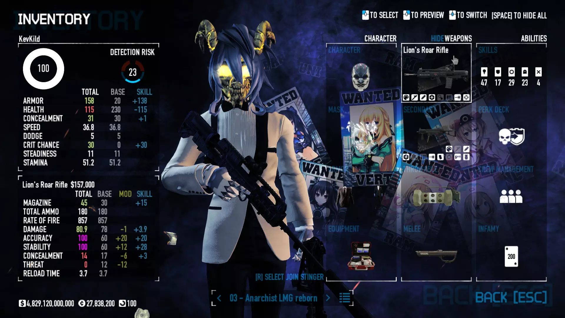 主武器 狮吼步枪 配件 CQB枪管 越大越好消音器 强化 - 隐蔽性 紧凑型激光模块 副武器 5/7 AP手枪 配件 氮化钛处理枪管 消焰器 强化 - 隐蔽性 微型激光 加长弹匣 装备 护甲:轻型防弹背心 [LBV] 部署装备:急救包 [FAKs] 投掷物:震荡手榴弹 近战武器:蜂鸣器/电击指虎 备注与视频 携带潜力:7 https://pd2builder.netlify.app/?s=1Q1G0-48110-5iF0010xi100100&p=d&a=1&t=4&d=5 狮吼步枪的强大之处在于,它本质上是一把更优秀的轻机枪,你可以用这把枪搭配任何build。 无政府主义者轻机枪重生(狮吼步枪)