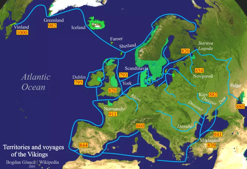 根据《维京帝国》(剑桥大学出版社,2005 年)的作者安吉洛·福特、理查德·D·奥拉姆和弗雷德里克·彼得森的观点,维京时代通常指从公元 800 年(最早有记载的突袭事件后数年)到 1050 年代(1066 年诺曼征服英格兰前数年)这一时期。在此期间,斯堪的纳维亚人的活动范围扩展到北欧各地,许多其他国家都曾遭遇维京人的沿海突袭。据记载,维京人到达的最远距离是巴格达,他们在那里交易毛皮、象牙和海豹脂肪等商品。