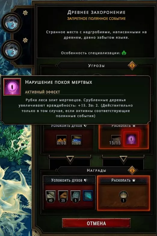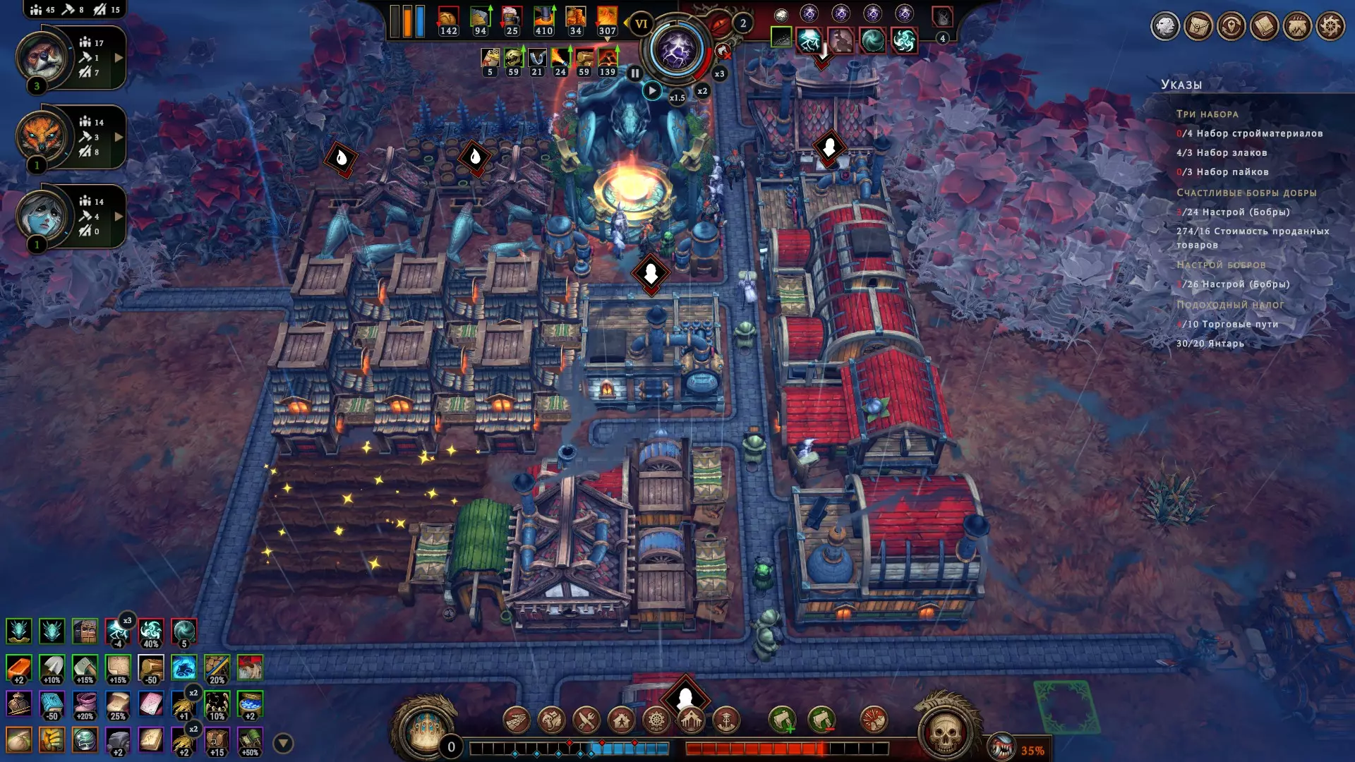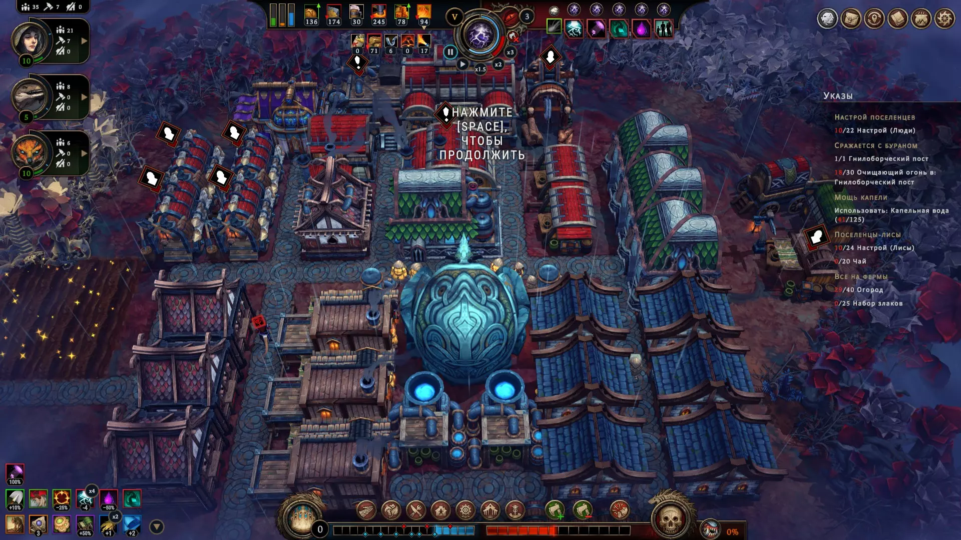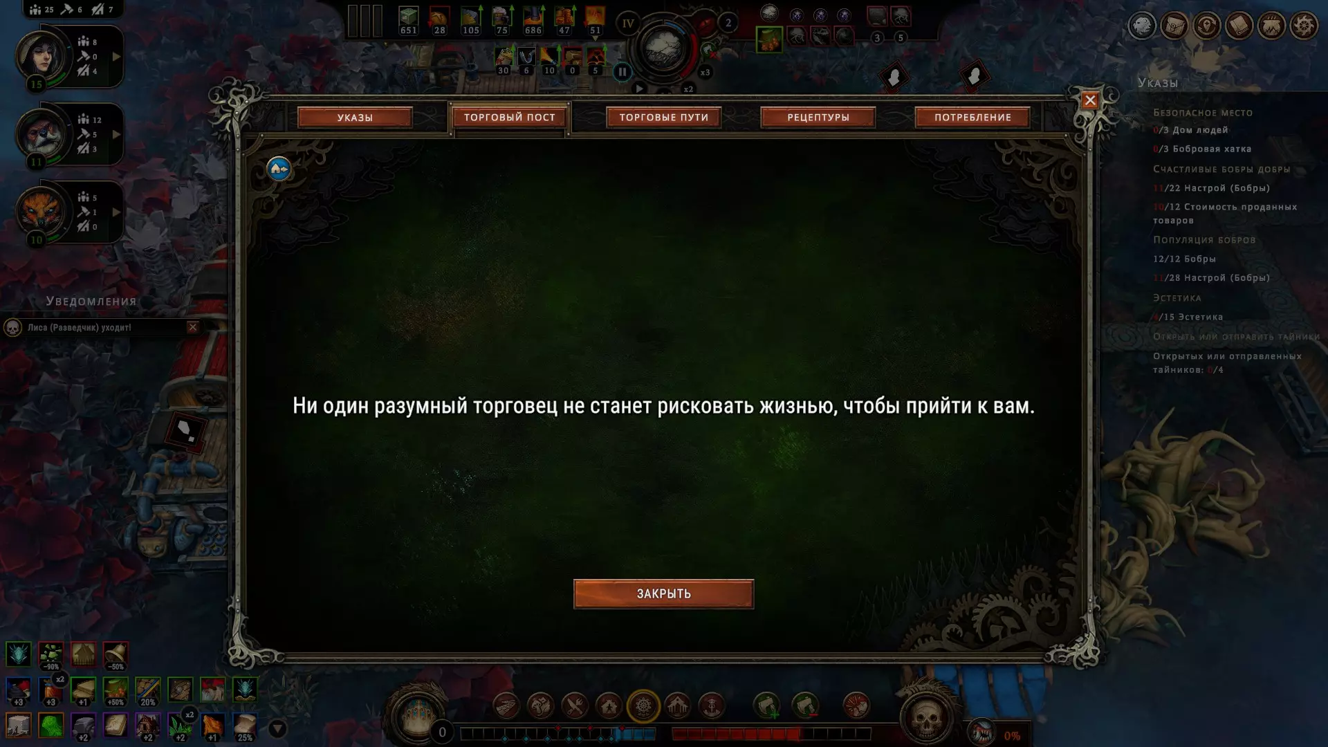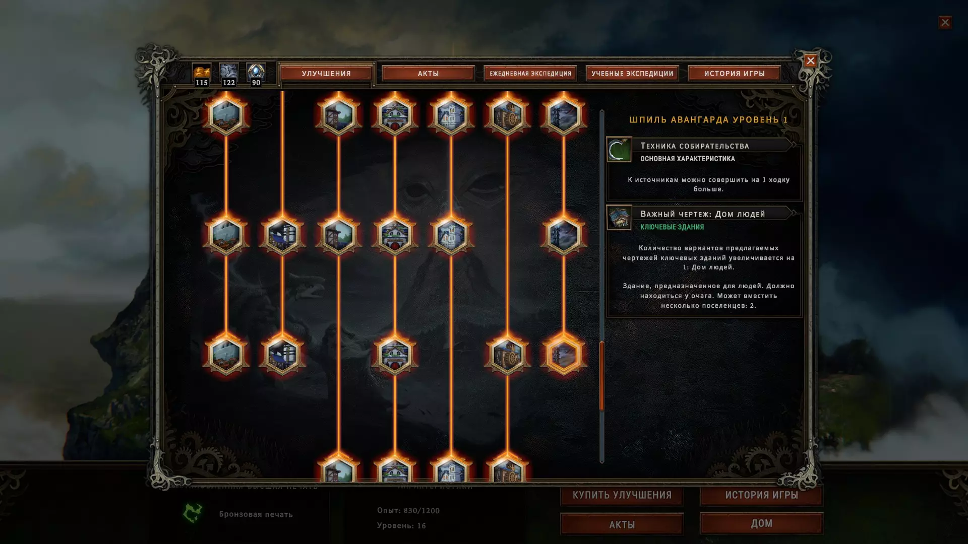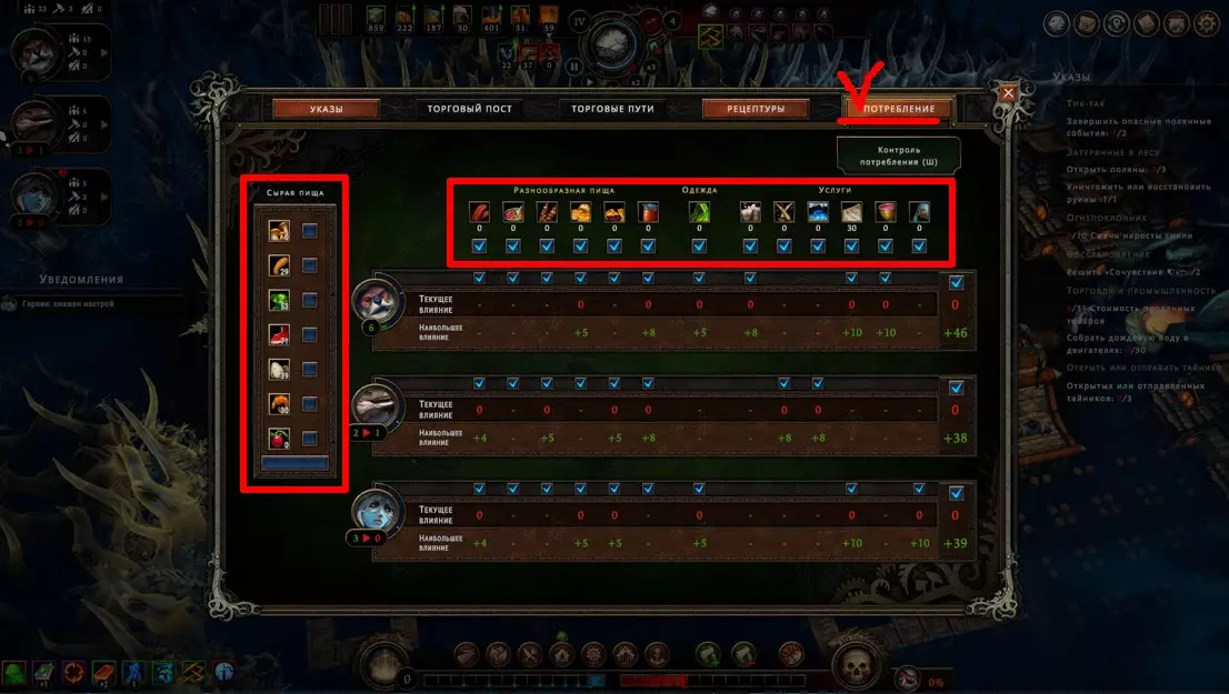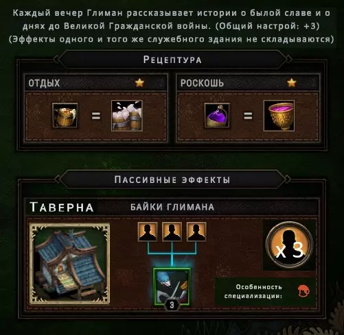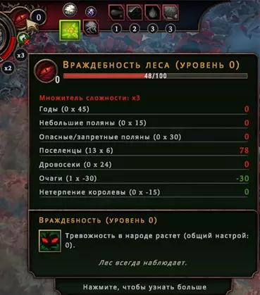 Просто знайте, что они существуют. Перед вами таверна, милорд! Но если вы думаете, что отсутствие алкоголя не позволяет вашим подчинённым собираться в этом прекрасном месте – вы заблуждаетесь. Наличие выпивки, безусловно, подарит вам большие преимущества, но даже если её нет, поселение получит положительный эффект при условии, что три поселенца будут просто находиться там для моральной поддержки всего населения в целом. В данном случае абсолютно не имеет значения, кого вы туда отправили, главное, чтобы их было трое. Кстати, пока у вас не появятся спиртные напитки, таверну можно открывать только во время бурана. Незачем просто так там сидеть, когда работа простаивает! Внимательно изучайте эффекты, которые оказывают на жителей полянные события. Потому что и там возможны факторы, влияющие на их уровень счастья. Всё это следует учитывать, чтобы не напортачить. Развитие поселения и приоритеты, важные пояснения Милорд, вы заскучали? Это вы напрасно. Мы ещё не обсудили, как важно открывать новые территории. Ведь заранее неизвестно, какие рядом с вами находятся ресурсы. А это может быть нечто очень ценное, ну или просто что-нибудь полезное. Кроме того, получение информации о ближайших ресурсах, позволяет рассчитывать дальнейшее направление в развитии, и на основе этой информации имеет смысл подбирать чертежи, подстраиваясь под текущие условия. Например, если вы видите, что вокруг много угля, от этого и нужно отталкиваться, а не надеяться на то, что возможно вы встретите там и другой ресурс для развития в привычном направлении. Также очень важно искать плодородную почву, т.к. любой другой источник пищи имеет ограниченное количество ресурса, и только на плодородных участках земли можно бесконечно выращивать злаки, что в долгосрочной перспективе всегда очень выгодно. Довольствоваться же базовой локацией разумно только при условии, что ваше поселение окружают одни лишь опасные и запретные поляны, а значит, что вы попросту не готовы так рисковать, не имея на руках необходимый для успешного закрытия полянного события ресурс. А именно этим они и отличаются от обычных полян. В обычной ситуации вы рискуете только разгневать лесных духов, т.к. открытие новой поляны повышает уровень враждебности леса, что непременно скажется на настроении ваших поселян, поэтому если общий настрой держится на средне-высоком значении (больше 5) – скорее всего никаких проблем у вас с этим не будет, но если показатели занижены и вы имеете сердитых гарпий с неуверенной единицей настроя – очень безответственно с вашей стороны будет открывать новую поляну как раз перед бураном. Лучше потерпите. Или выясните, почему же они так недовольны. Как правило, чаще всего это означает, что их не удовлетворяют их условия жизни. Помните, что потребности народа растут. Если поначалу ваши крестьяне счастливы просто тому, что у них есть крыша над головой и какие-то корешки, чтобы сбить голод, то затем вы всё чаще и чаще будете слышать от них, что рацион скуден, что дома неудобные, что нет развлечений, что нужна новая одежда, что хотелось бы выпить чего-нибудь крепкого в таверне, и всё это валится вам на голову в виде новых проблем, решить которые можете только вы. Но так было всегда, милорд. Народ легко привыкает ко всему хорошему и со временем хочет большего. В этой связи иногда имеет смыс