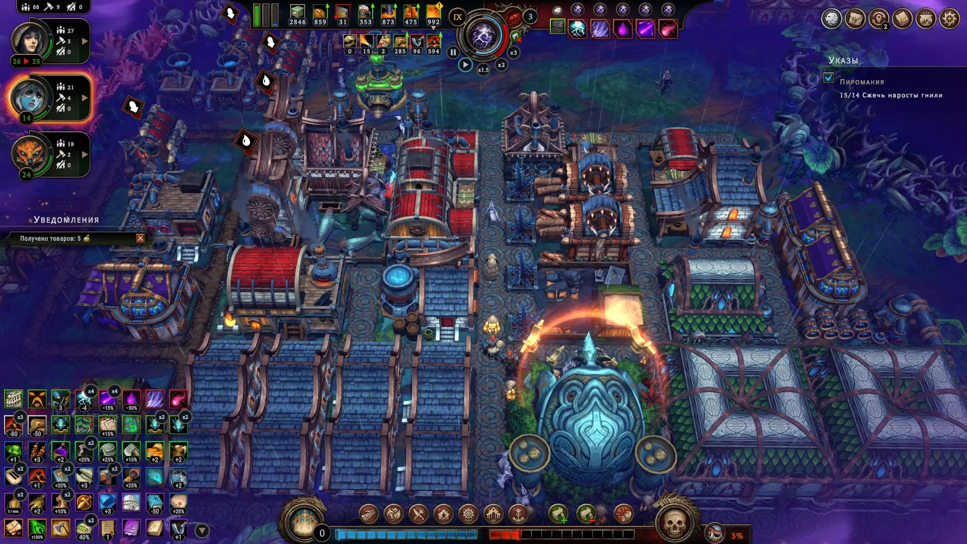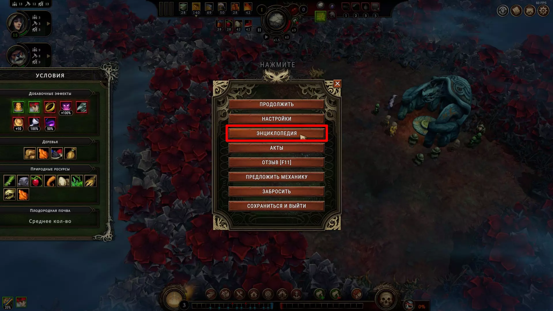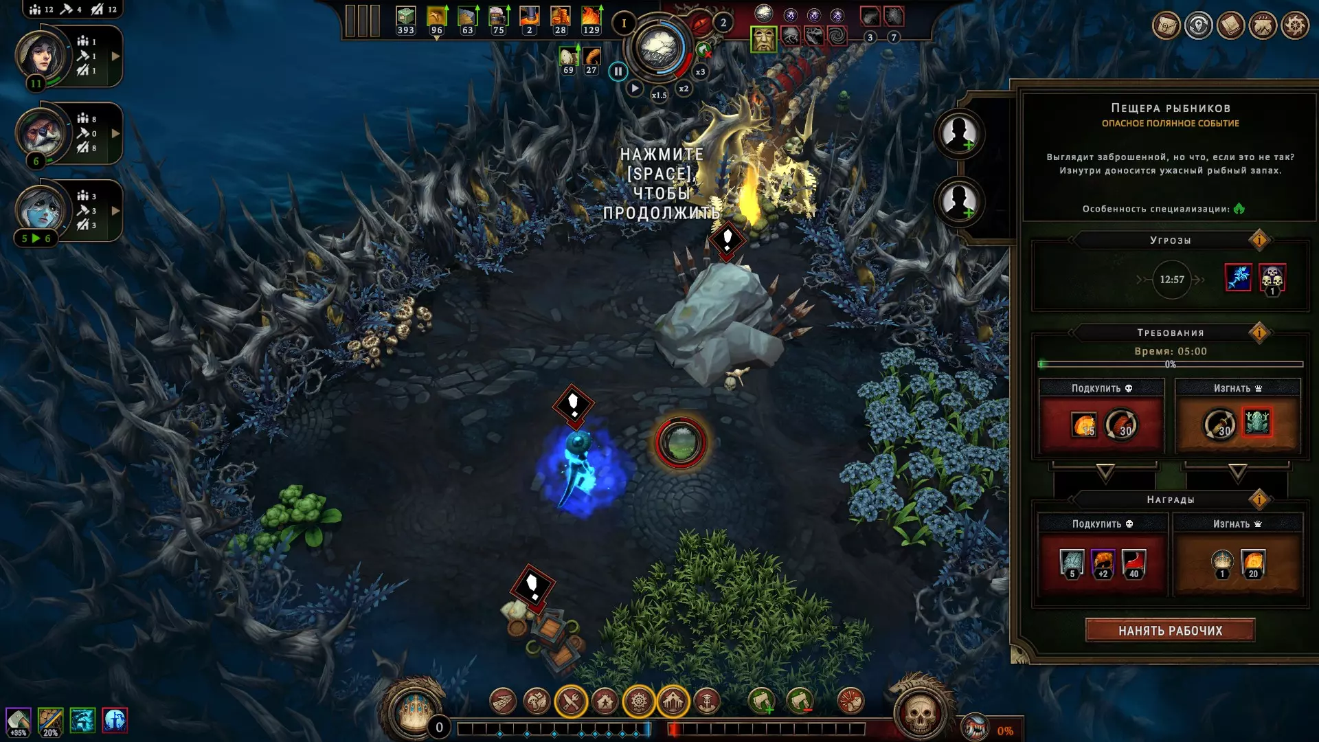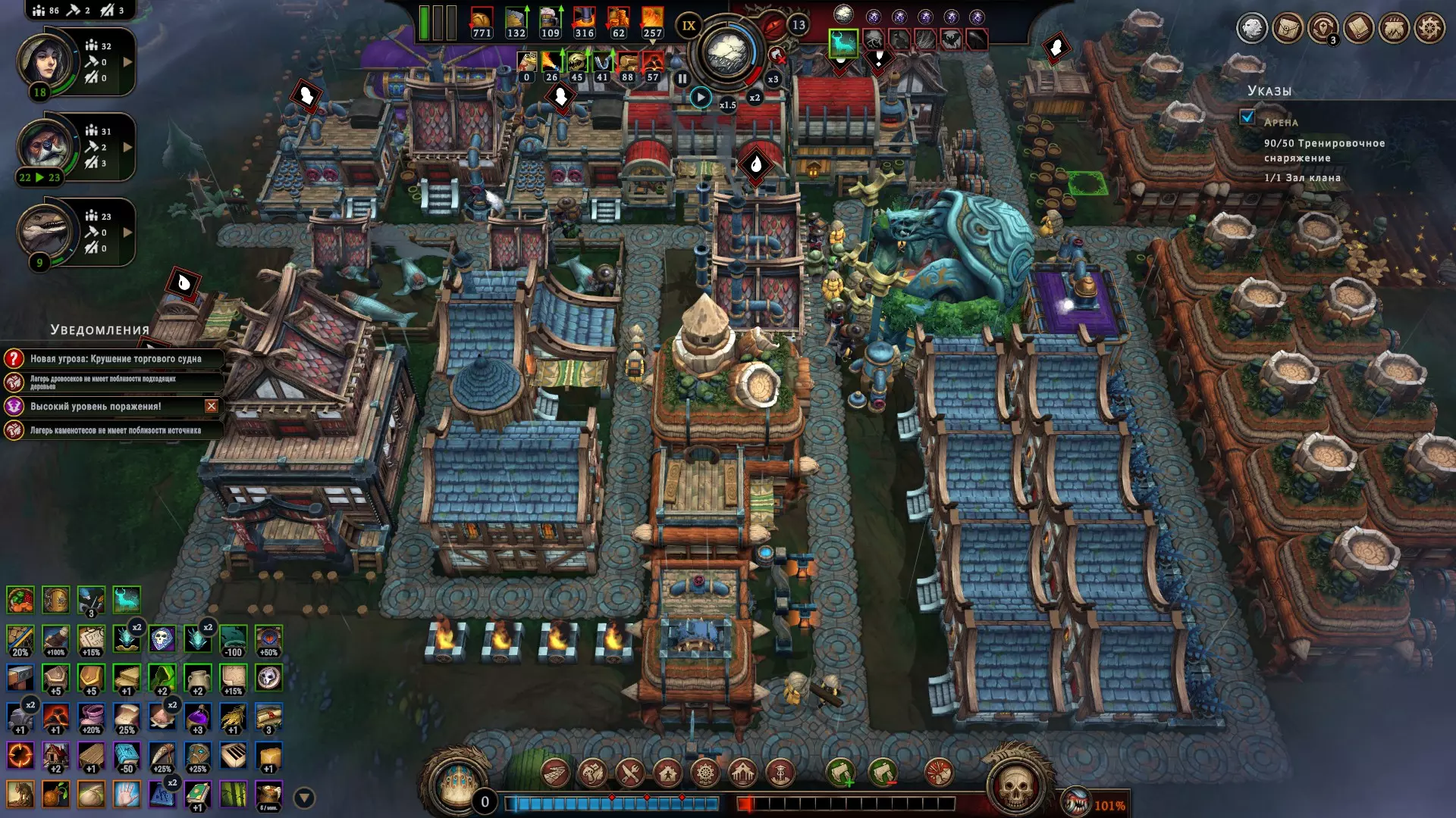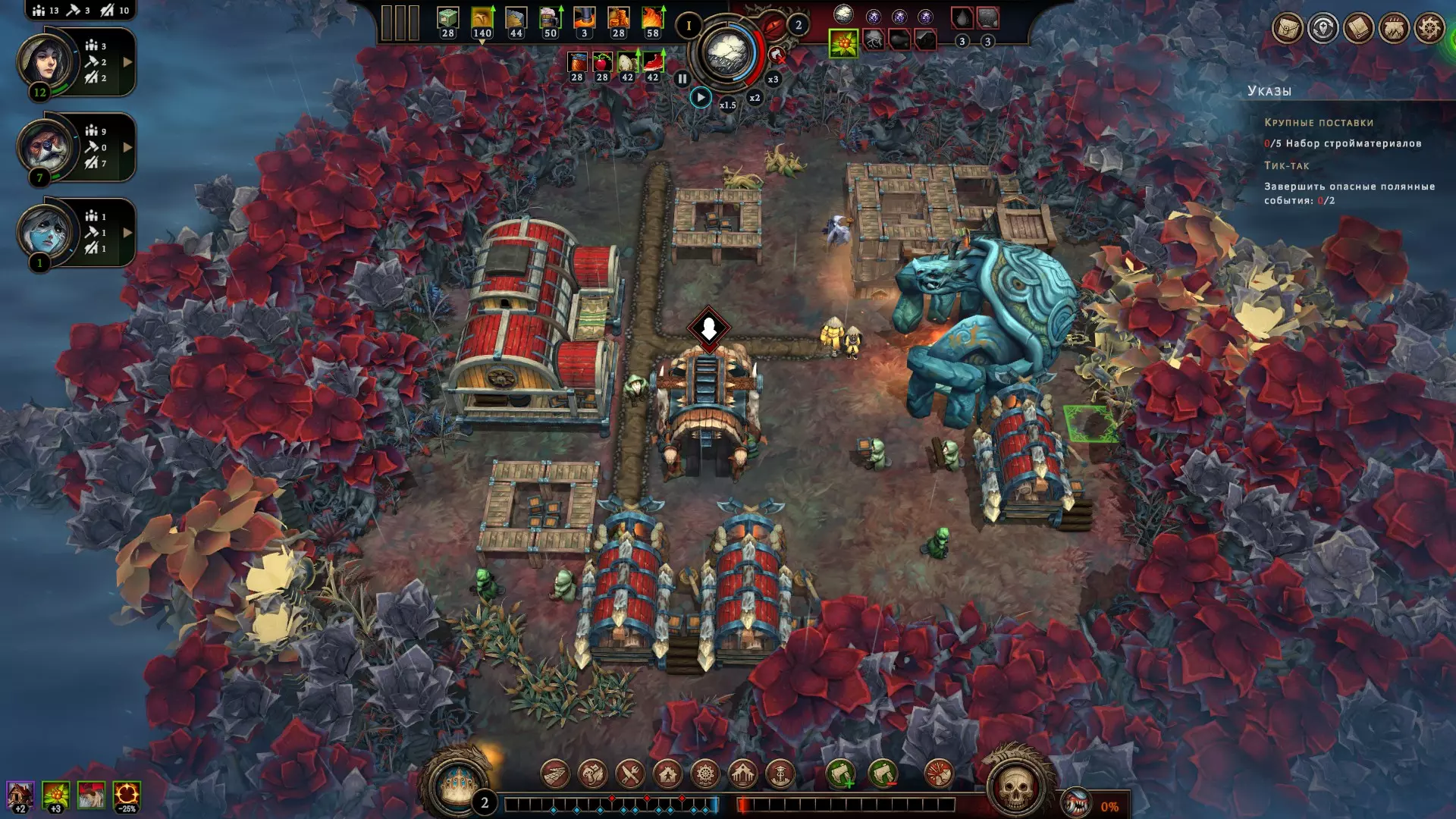 Просто знайте, что они существуют. Перед вами таверна, милорд! Но если вы думаете, что отсутствие алкоголя не позволяет вашим подчинённым собираться в этом прекрасном месте – вы заблуждаетесь. Наличие выпивки, безусловно, подарит вам большие преимущества, но даже если её нет, поселение получит положительный эффект при условии, что три поселенца будут просто находиться там для моральной поддержки всего населения в целом. В данном случае абсолютно не имеет значения, кого вы туда отправили, главное, чтобы их было трое. Кстати, пока у вас не появятся спиртные напитки, таверну можно открывать только во время бурана. Незачем просто так там сидеть, когда работа простаивает! Внимательно изучайте эффекты, которые оказывают на жителей полянные события. Потому что и там возможны факторы, влияющие на их уровень счастья. Всё это следует учитывать, чтобы не напортачить. Развитие поселения и приоритеты, важные пояснения Милорд, вы заскучали? Это вы напрасно. Мы ещё не обсудили, как важно открывать новые территории. Ведь заранее неизвестно, какие рядом с вами находятся ресурсы. А это может быть нечто очень ценное, ну или просто что-нибудь полезное. Кроме того, получение информации о ближайших ресурсах, позволяет рассчитывать дальнейшее направление в развитии, и на основе этой информации имеет смысл подбирать чертежи, подстраиваясь под текущие условия. Например, если вы видите, что вокруг много угля, от этого и нужно отталкиваться, а не надеяться на то, что возможно вы встретите там и другой ресурс для развития в привычном направлении. Также очень важно искать плодородную почву, т.к. любой другой источник пищи имеет ограниченное количество ресурса, и только на плодородных участках земли можно бесконечно выращивать злаки, что в долгосрочной перспективе всегда очень выгодно. Довольствоваться же базовой локацией разумно только при условии, что ваше поселение окружают одни лишь опасные и запретные поляны, а значит, что вы попросту не готовы так рисковать, не имея на руках необходимый для успешного закрытия полянного события ресурс. А именно этим они и отличаются от обычных полян. В обычной ситуации вы рискуете только разгневать лесных духов, т.к. открытие новой поляны повышает уровень враждебности леса, что непременно скажется на настроении ваших поселян, поэтому если общий настрой держится на средне-высоком значении (больше 5) – скорее всего никаких проблем у вас с этим не будет, но если показатели занижены и вы имеете сердитых гарпий с неуверенной единицей настроя – очень безответственно с вашей стороны будет открывать новую поляну как раз перед бураном. Лучше потерпите. Или выясните, почему же они так недовольны. Как правило, чаще всего это означает, что их не удовлетворяют их условия жизни. Помните, что потребности народа растут. Если поначалу ваши крестьяне счастливы просто тому, что у них есть крыша над головой и какие-то корешки, чтобы сбить голод, то затем вы всё чаще и чаще будете слышать от них, что рацион скуден, что дома неудобные, что нет развлечений, что нужна новая одежда, что хотелось бы выпить чего-нибудь крепкого в таверне, и всё это валится вам на голову в виде новых проблем, решить которые можете только вы. Но так было всегда, милорд. Народ легко привыкает ко всему хорошему и со временем хочет большего. В этой связи иногда имеет смыс