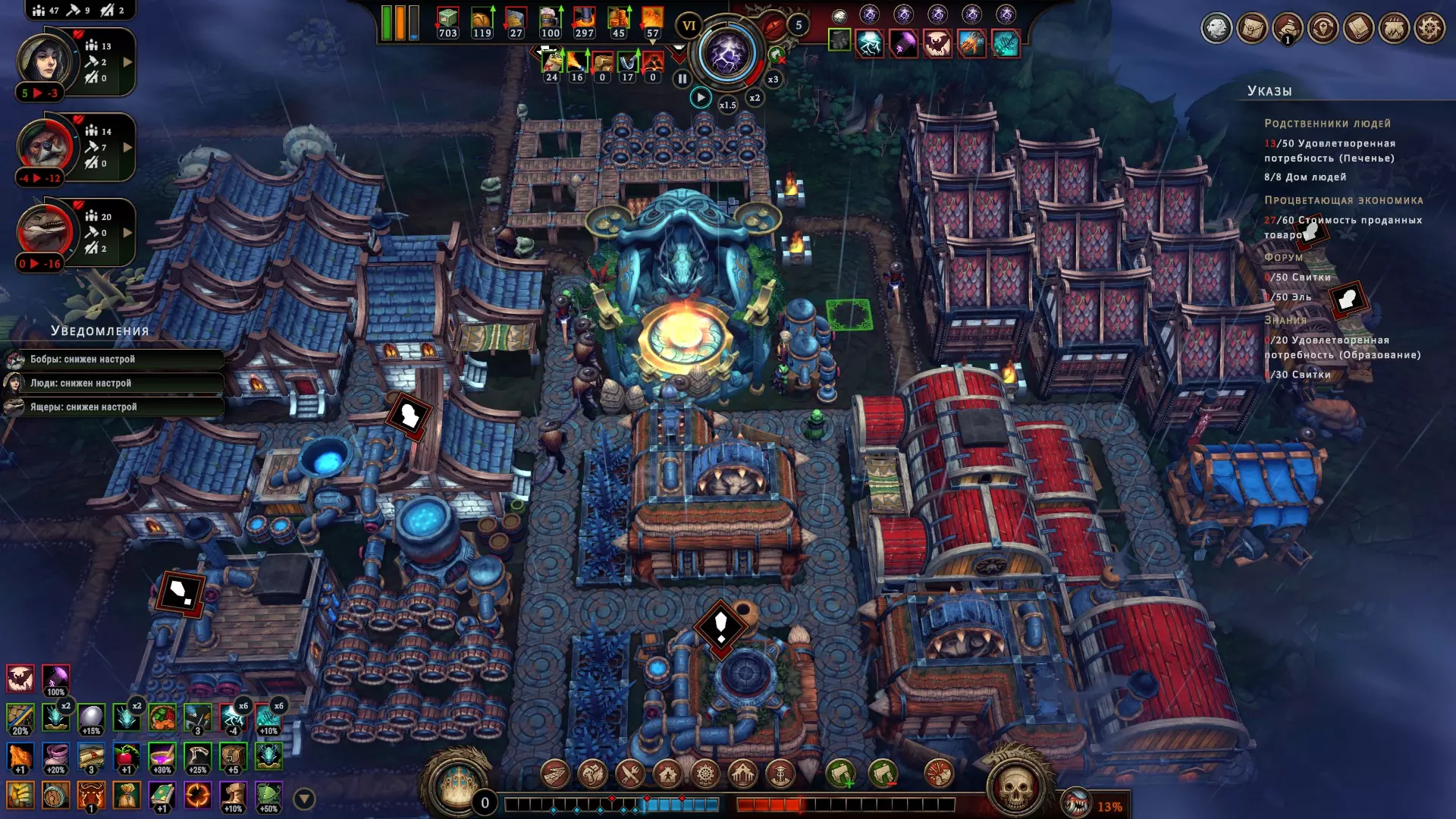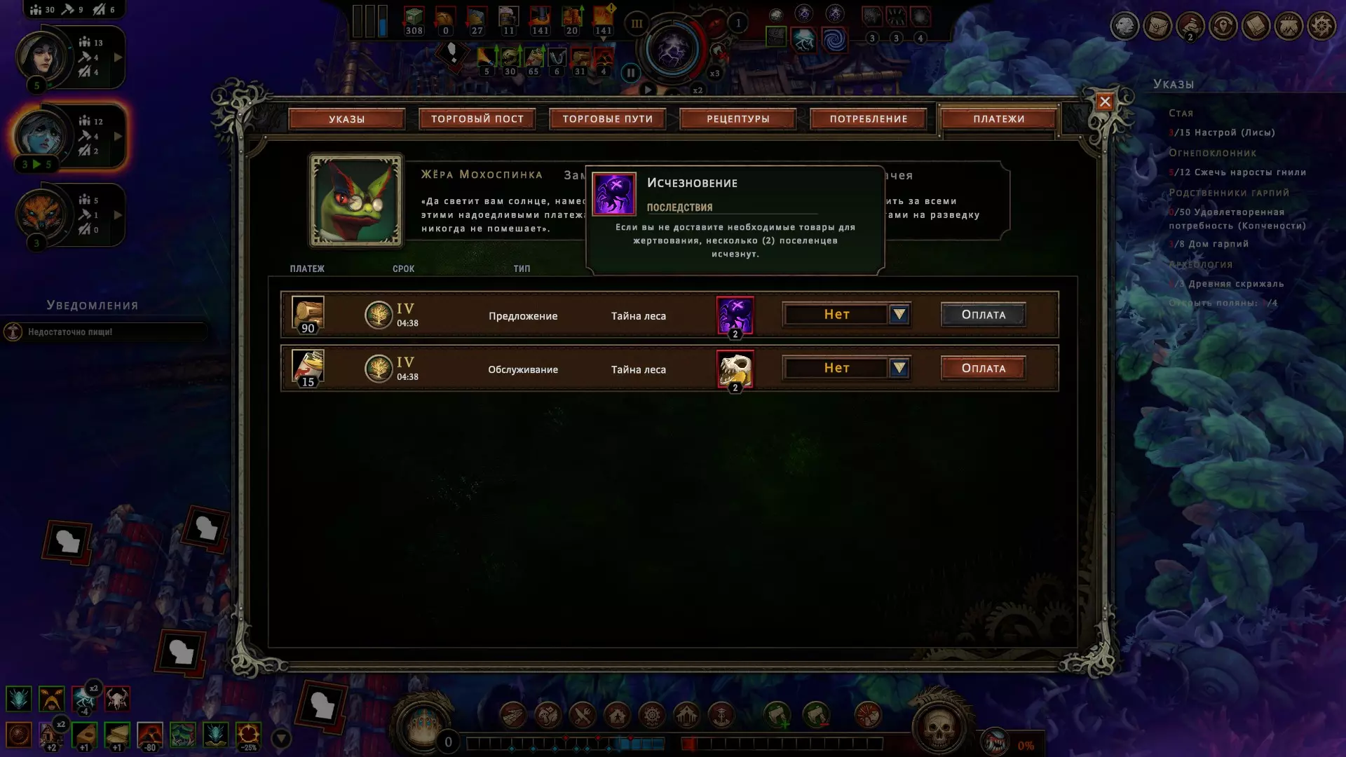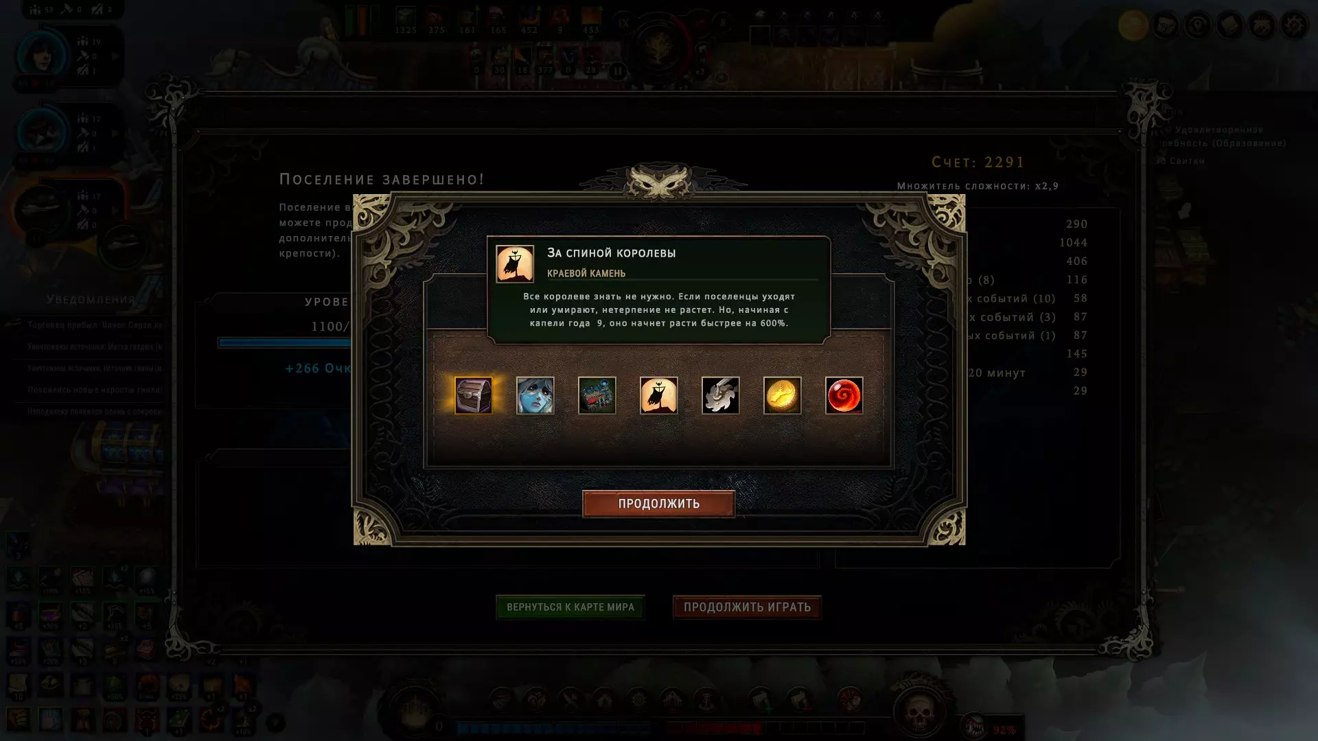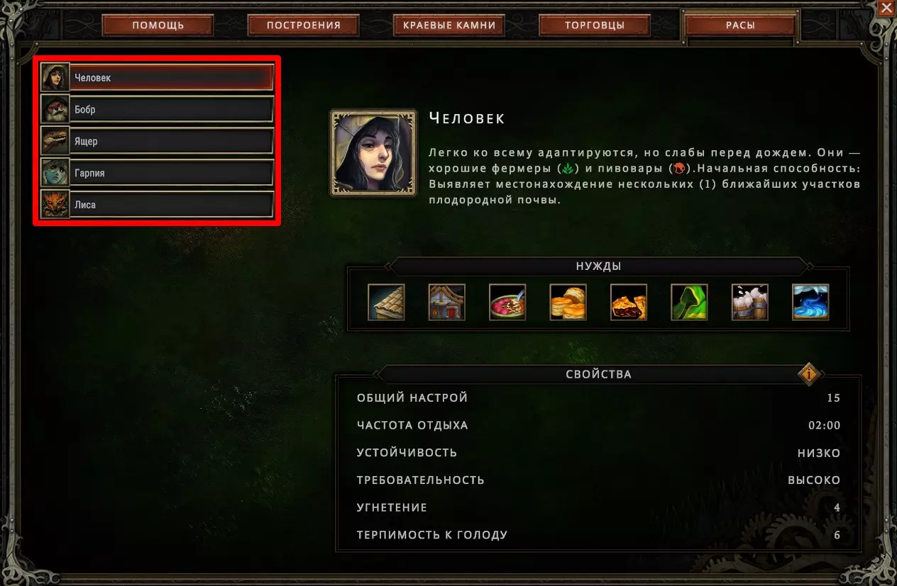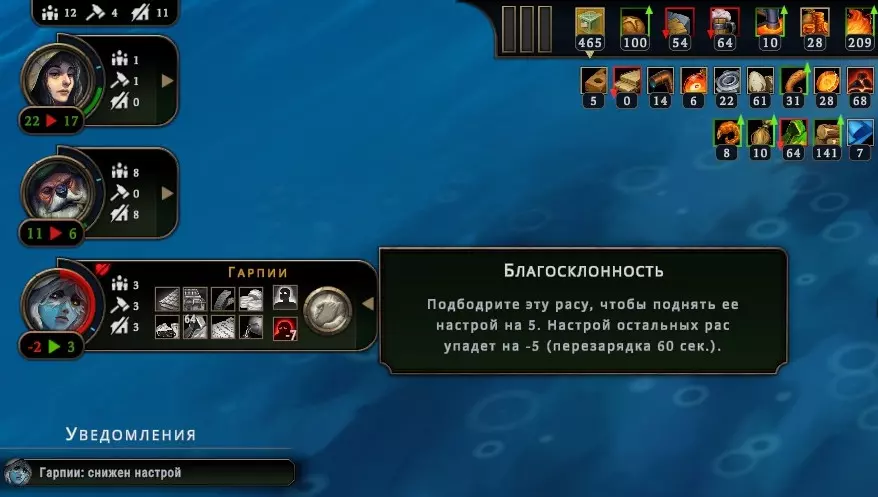激励鹰身女妖并将其设为你的最爱,它们会立即获得额外心情值(+5),但在此功能生效期间,其他所有种族都会对你产生不满(-5)。这能让你在为这些有翼伙伴准备更稳定的方案时争取到时间。如果您在稳定方案方面遇到问题,且有两个种族心怀不满,那么可以暂时哄骗您的子民,交替任命这两个种族为“宠儿”。当其中一方感到不满时,另一方就会感到高兴。这样就能避免他们离开,同时无需过多费心。若您拥有至少一个友好种族(其好感度需≥6),且另外两个种族的不满值均不超过-5(0算作负值),此功能即可生效。当居民好感度为负值时,他们会收拾物品离开:您有30秒时间进行修正,在较低难度下则有1分钟(很快您就会发现,1分钟其实非常漫长)。请注意,情绪的转变并非一蹴而就,至少要预留5秒钟的缓冲时间,否则可能会计算失误。如果情况非常糟糕,这个巧妙的方法已经不起作用了该怎么办呢? 如果你不确定自己能否保持高昂的情绪状态,或许会对这个奖励感兴趣。而且一般来说,额外的点数总归是有用的,此外,