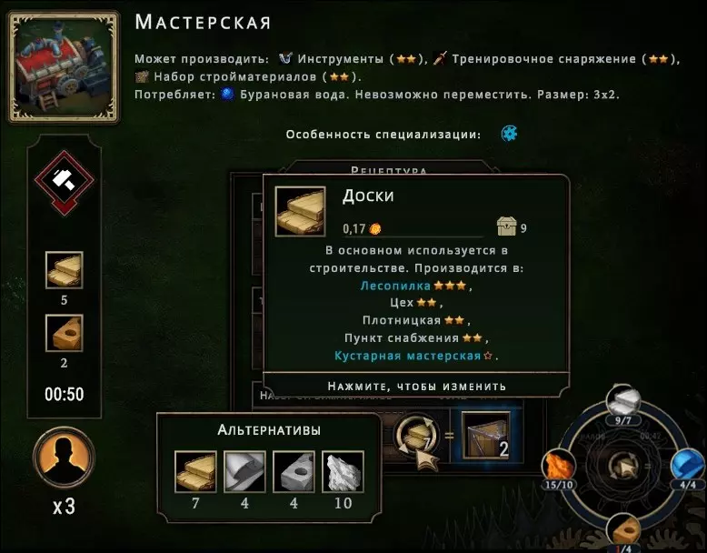 当你声望不高,而女王的耐心又达到危险值时,这种方式尤为方便——此时你无法催促商人,却又必须卖出一些东西。当然,只有在你拥有多余物品时才值得这么做。除非你能加价出售,否则不要交易你自己需要的物品。关于如何获取收益(想必此刻您已两眼放光) 您会问我,怎样才能实现繁荣发展?非常简单,大人,您只需确定自己要生产哪种高价产品,然后着手实现既定目标。最有价值的商品包括:奢侈品套装、商品套装、建材套装。古老的石板和狂野火焰精华价值不菲(但不要急于处理它们,在野外活动时可能会用到,而且借助EDK可以升级间歇泉)。工具能卖个好价钱,但你可能不会拿去交易,把它们存起来日后开启所有宝箱并取悦女王会更划算。既然您已经累了,老爷,那我就以建筑材料储备为例,给您讲讲基本原理。之后您可以直接沿用这个工作方案,或者举一反三。不过首先,我要回答您眼中那个明显的疑问:在初期建设定居点时,究竟应该选择哪些图纸呢?有用的蓝图有很多,但我不会对它们全部进行详细解析,不如聊聊哪些比较适合新手起步。等你完全弄明白之后,说不定就该你来给我建议这里哪些更好、为什么更好了。 首先我们需要关注的是锯木厂、干燥棚、砖厂(别担心,那里的工厂就叫这个名字)、雨水收集器、熔炉,以及农场或种植园。只有当整片区域都布满相应资源时,才需要升级资源收集营地。提示:这种情况很少见。而且通常你事先并不知道森林区域会以大型资源点的形式分布哪种具体资源。当然,由于森林占据了地图的大部分区域,伐木场总是适用的,有了它你绝对不会出错。获得的木板可用于制作建筑材料,之后能将其高价出售以积累财富。虽然清洁雨水磨(请您忘了它吧,大人)是最佳选择,但我们目前还是先专注于工坊。