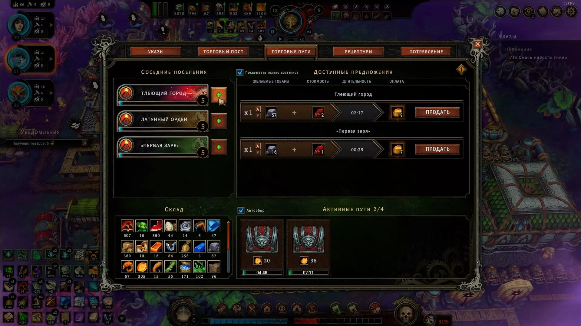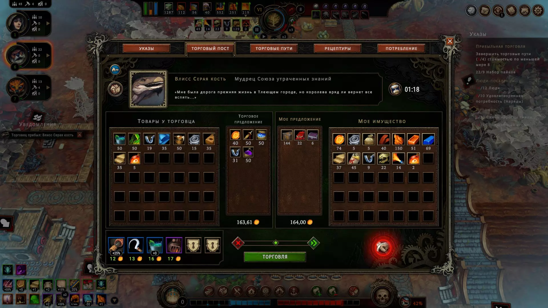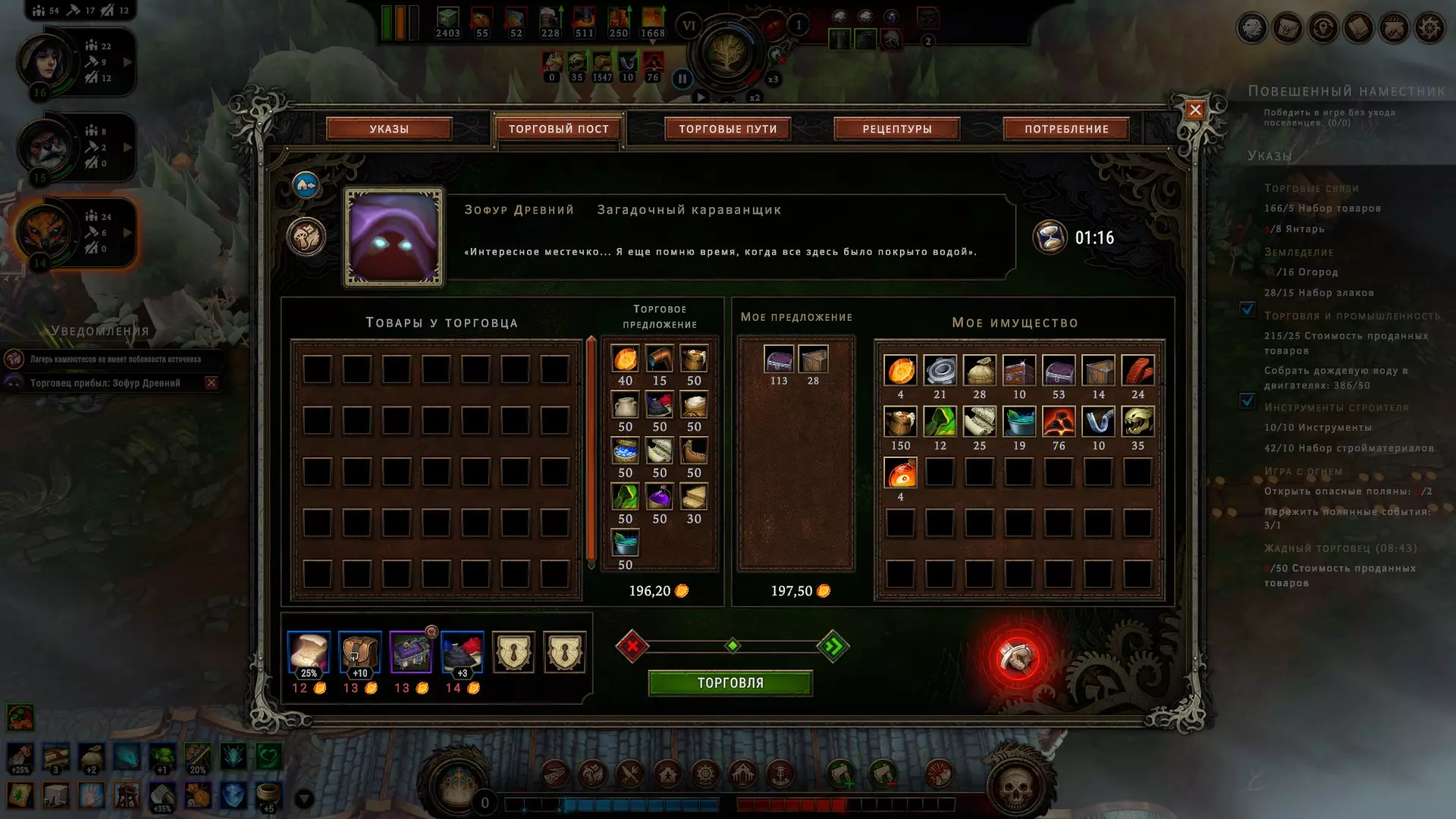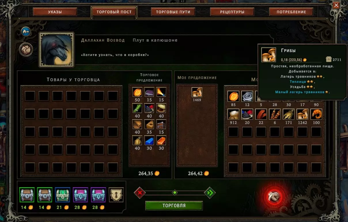 这时,皇家司库的副手前来帮忙,她提出可以让您摆脱这些麻烦,因为她能用某种未知的方式摆平一切。不过,大人,我完全不清楚她具体要怎么做,也不太相信这真的能实现。而且我有种强烈的感觉,这个讨厌的家伙其实是自己给所有人制造麻烦,还利用自己的身份地位进行勒索,却把所有不幸都归咎于森林。当然了,这个森林和那些有害的灵体本来就只会带来麻烦,那为什么不再给它们安上这一条罪名呢?反正也没人会知道。 要是有人不同意——总能制造一场意外,到时候你们就会三思而后行了,大人。遗憾的是,我们无法证实此信息,因此完全没有证据表明她与所发生的事情有任何关联。而且也没有任何途径可以获取证据。因此,我们无能为力。必须为她的服务付费,拒绝的话会带来麻烦。大人,一旦出现这个人,您可能就得立刻告别安稳的生活了,除非其后果不会给您带来太大麻烦。比如说,如果她威胁到您的资源来源或建筑损毁——这其实不算什么大问题,建筑可以修复,资源来源也可能并非必需…… 如果您有能力制作工具组,就可以向其他城市出售资源。这生意非常赚钱(尤其是当你获得特殊的边缘宝石时),但你不能什么都收购:客户会留下需求,如果你有他们想要的商品并且准备出售,你就尽可能多地装载马车,然后派出商队,之后该交易请求就会关闭。你可以同时进行多笔交易,但每笔交易都需要时间来完成。因此,如果出现更有利的交易,而你已经派出了所有商队,就必须等待它们返回,并希望它们能及时回来以达成新的交易。