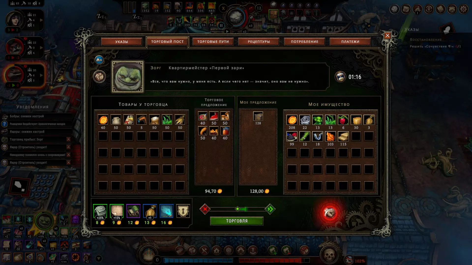 因此我强烈不建议你采取这种卑劣行径,顺便说一句,商贩们会拼命反抗,而且肯定会带走你的几个手下。作为结果,你会获得他们的个人物品(这些物品可能非常贵重),但不要妄想能拿到货架上的所有商品。在打斗过程中,展示样品会被损坏,而明智的商人通常会将主要商品库存存放在离潜在买家有一定距离的地方,正是为了防止抢劫。系统会向您显示商品库存情况,完成支付后,商品将由商队直接运送到仓库。在这片区域,有不少心怀不轨的不法之徒,所以无论您的冒险精神多么强烈,都要尽量避免此类恶行。与商人建立友好关系更为有利,而且当您拥有一定声望后,就能更频繁地召唤他们。女王不会满意,但如果一笔有利可图的交易能让你的人民繁荣昌盛,她会对此睁一只眼闭一只眼。 对了……还有个小窍门!它能让你暂时骗过女王。