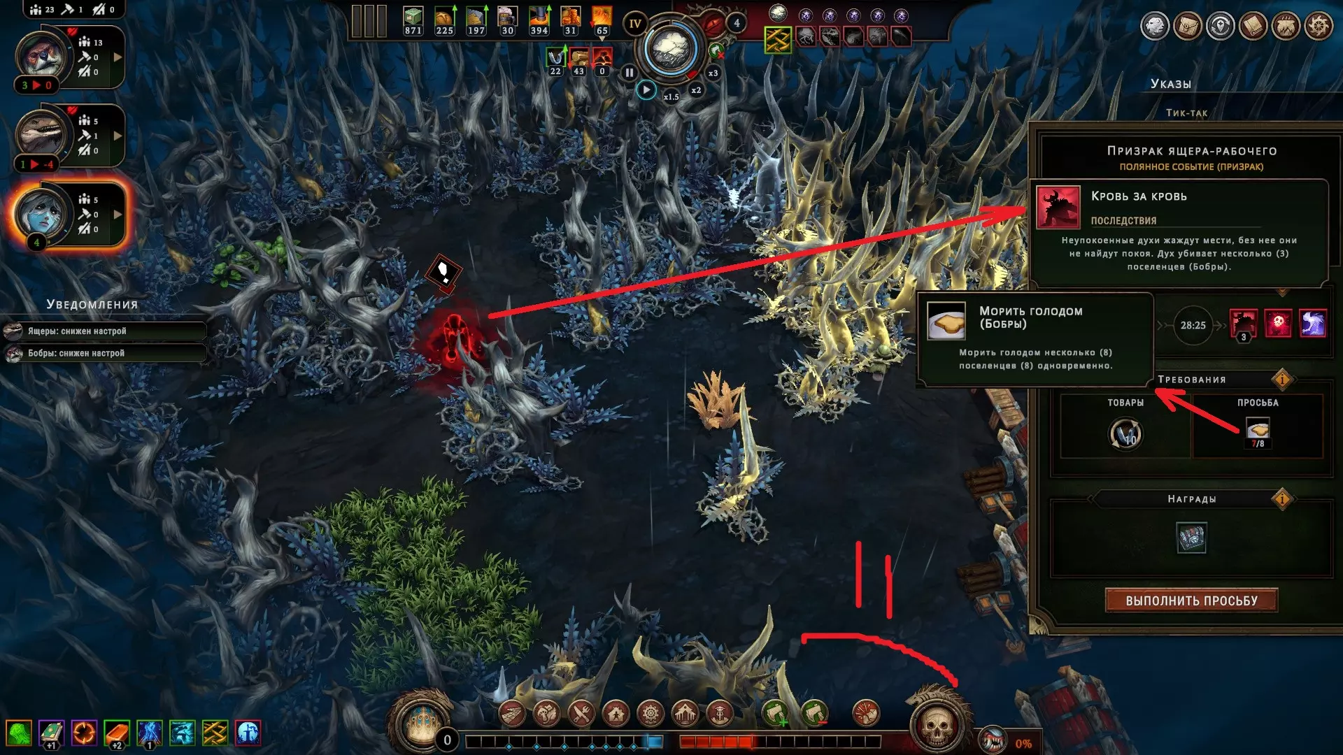 通常来说,开启野外事件就意味着你的麻烦开始了,因为按照设定,当负责激活事件的村民(即侦察兵)在处理问题期间,居民们会遭遇各种暂时的不便。例如,你可能会遇到突然禁止砍伐树木的情况。在这种情况下,这仅仅意味着最好在暴风雪期间开始此类活动,因为那时没人会去森林里。但是,如果在天气好的时候放弃储备木材……我真不知道该怎么说,大人。为此,您的仓库里需要有大量的木材储备。那就这样吧。上述提到的不便之处可能种类繁多,我不打算一一列举,大人,您做决定时只需保持警惕即可。 除了意料之中的麻烦——比如那些森林里的怪物突然给您派任务,这您已经习惯了——您还可能遇到一些真正可怕的东西,大人。鬼魂。但并非只是那些会吓人的虚无灵体……它们确实能吓唬人,但不是靠外表,而是靠它们的要求!没错,它们会要求你做各种事情,有些可能不合您的心意,大人。