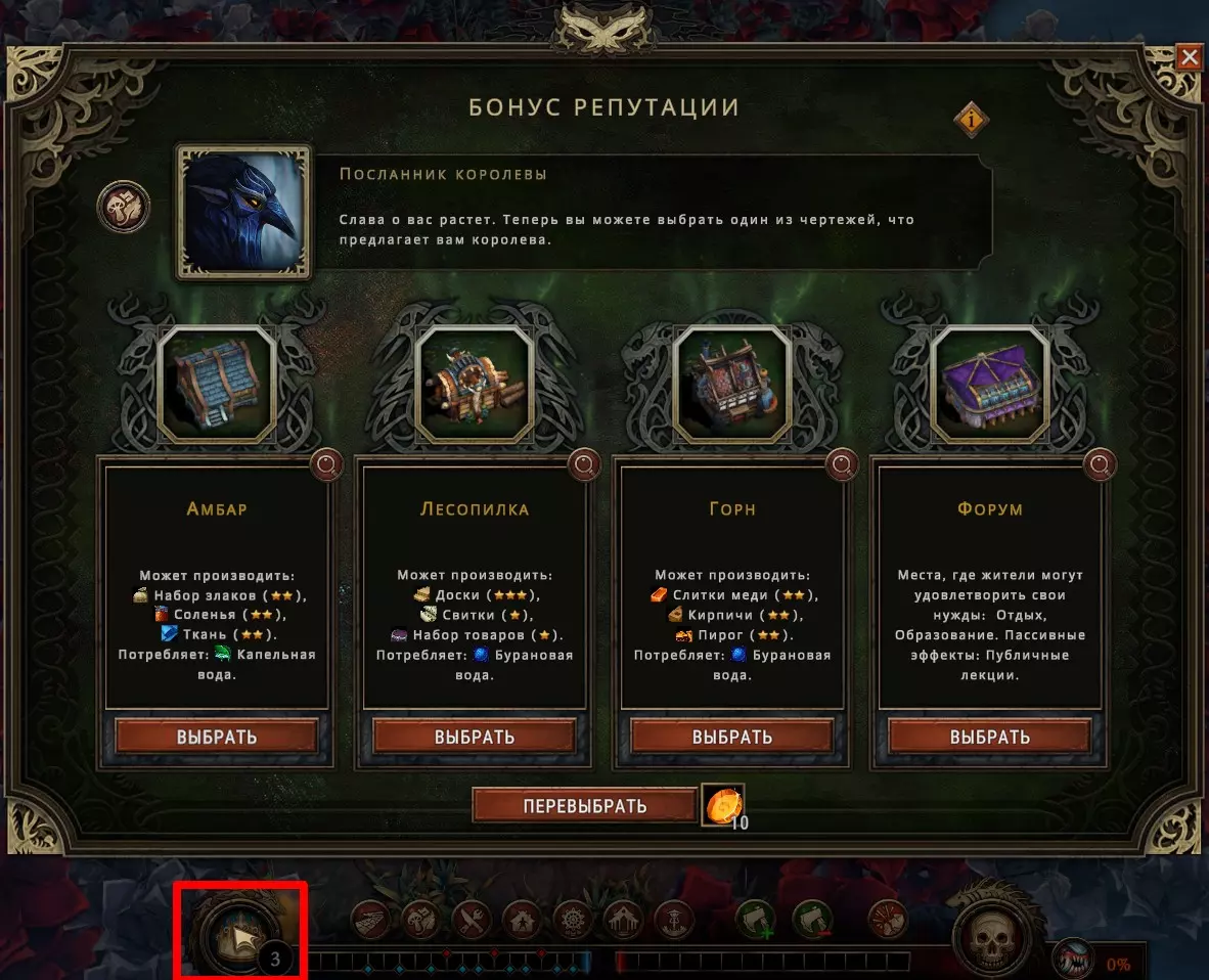 请注意,这些图纸不会轻易给你,它们将严格作为你获得的声望点数的奖励发放,而声望点数还需要你去争取!非常重要的一点是,提供给你的图纸中可能没有你需要的建筑,而且重新选择需要付费,所以请明智地选择。初始阶段可以获得三张图纸,开始时只能从四张中选择一张,之后选择界面会刷新,而那位狡猾的渡鸦——女王的使者,会提供接下来的四张。完成第三次选择后,就需要等待很长时间才能获得新的图纸,记住这一点。建筑分为三类:1)资源采集(可直接按用途使用,用途:收集食物和原材料),2)资源加工(用于将初级原材料加工为次级原材料或成品),3)生活质量提升(顾名思义,无需额外说明)。由此可见,例如,如果你打算种植小麦并拥有了农场,就需要考虑到居民很可能不会直接食用未加工的谷物。因此,为了成功销售产品,你还需要磨坊和面包房。而这就需要整整三份蓝图,并且不知道何时才会提供给你,甚至是否会提供!每个生产建筑都有多种功能,您可以自行设定工作模式。例如,磨坊不仅可以用来生产面粉,还能制造建筑材料包,甚至可以制作卷轴。不过这个话题我们稍后再谈。正如之前所说,大人,部分建筑可在完成地图后用赚取的资源购买,之后它们会显示在建筑选择菜单中,无需再从图纸里寻找。这非常方便,大人,您不妨一试!