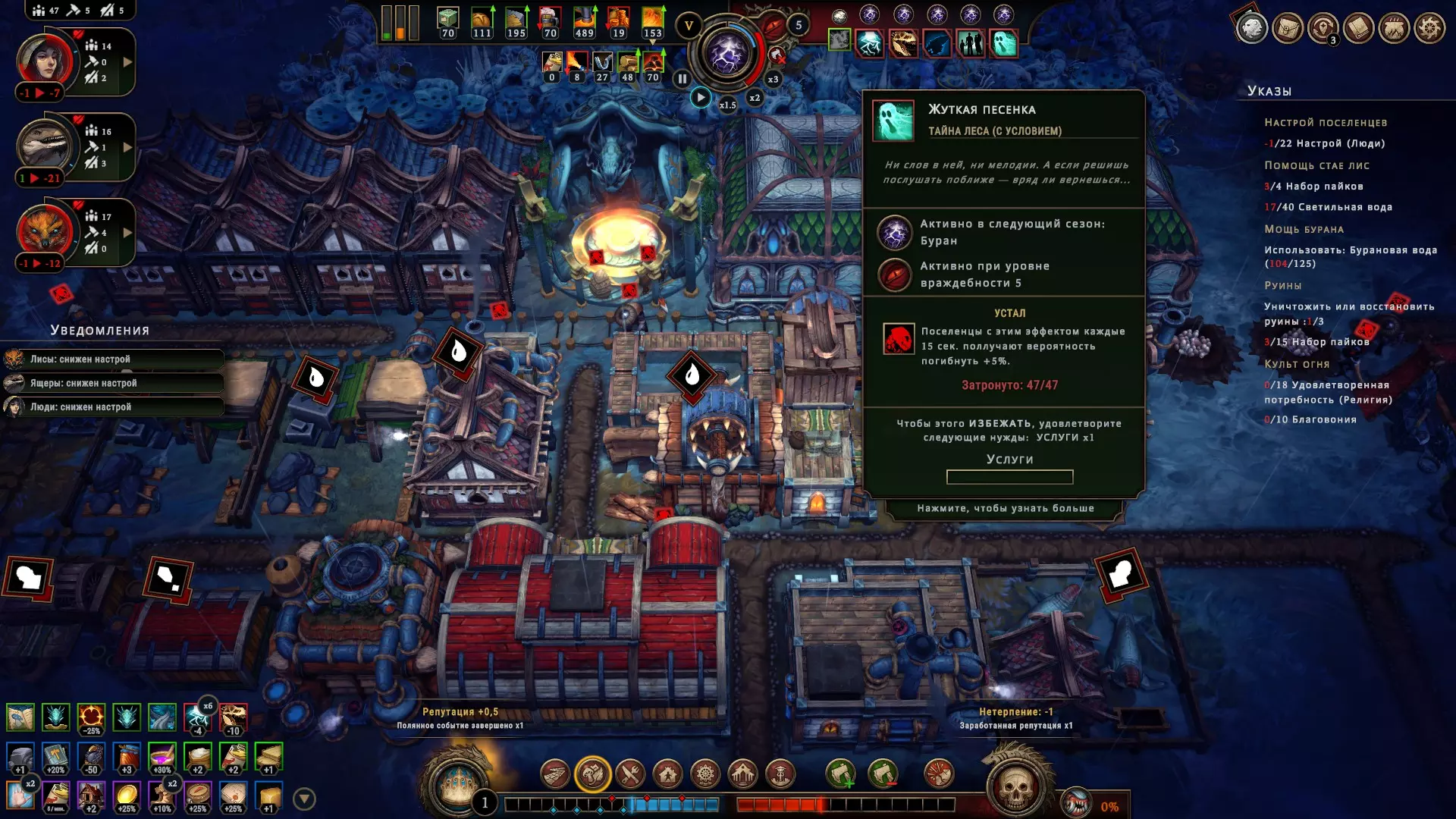 根据获取的信息,按照特点将您的临时下属按职业进行分配,结果会令您满意。至于据点,这里需要根据您追求的目标来决定。例如,如果你燃料不足,可以留意一下海狸,它们对燃料了如指掌,并且能够帮你减少燃料消耗;如果你害怕女王发怒,可以向民众求助,他们口才很好,能说服女王不对你发脾气。狐狸能安抚森林,使其敌意降低;鹰身女妖守护者会激励民众搬运更多物资(她们非常挑剔且贪婪);而蜥蜴们只要其中一员能成为篝火守护者就会感到满足。这真是非常有用的收获……总之,建议您从这三个选项中选择,具体由您决定。听着,大人,篝火守护者将在您的整个旅途中为您提供增益!顺便说一下,这些是可以更换的。现在来说说还有什么可以更换的。 一切都可以更换,大人!这里没有“他成了伐木工,余生都在伐木”这种说法,如果你想成功,就必须管理定居点,并多次将工人从一个地方重新分配到另一个地方……无论如何你都得这么做,因为暴风雪会让你无法伐木。 是的,大人,这里的一切没那么简单。我会尽量简短地说明一下,别这副表情!这片土地上的暴风雪并非是那种会突然降临的天气现象。恰恰相反,它是三个季节之一,你会提前知道它的到来,因为……是的,因为那个几次在你面前疯狂手舞足蹈、抓着脑袋的“疯老头”,其实就是你的气象学家,他一直在试图警告你,暴风雪很快就要来了……暴风雪会跟着“光体”而来,而“光体”之前会先出现“水滴”。你可得记住了!“水滴”是种植谷物的好时机,“光体”是收割的时间,而“暴风雪”则意味着死亡。这次我可没骗你。是的,我是认真的,这是一段极其糟糕的时期。森林会变得更加危险,腐烂现象开始蔓延并侵蚀你的建筑,敌对生物的攻击性达到顶峰,燃料消耗速度比平时更快,居民的士气也会急剧下降。如果你不采取任何措施,许多居民可能会离开,在后期甚至可能死亡,所以必须仔细为每次风暴做好准备。请为居民们着想。如果您不相信我的话,大人,就请看看这里吧……