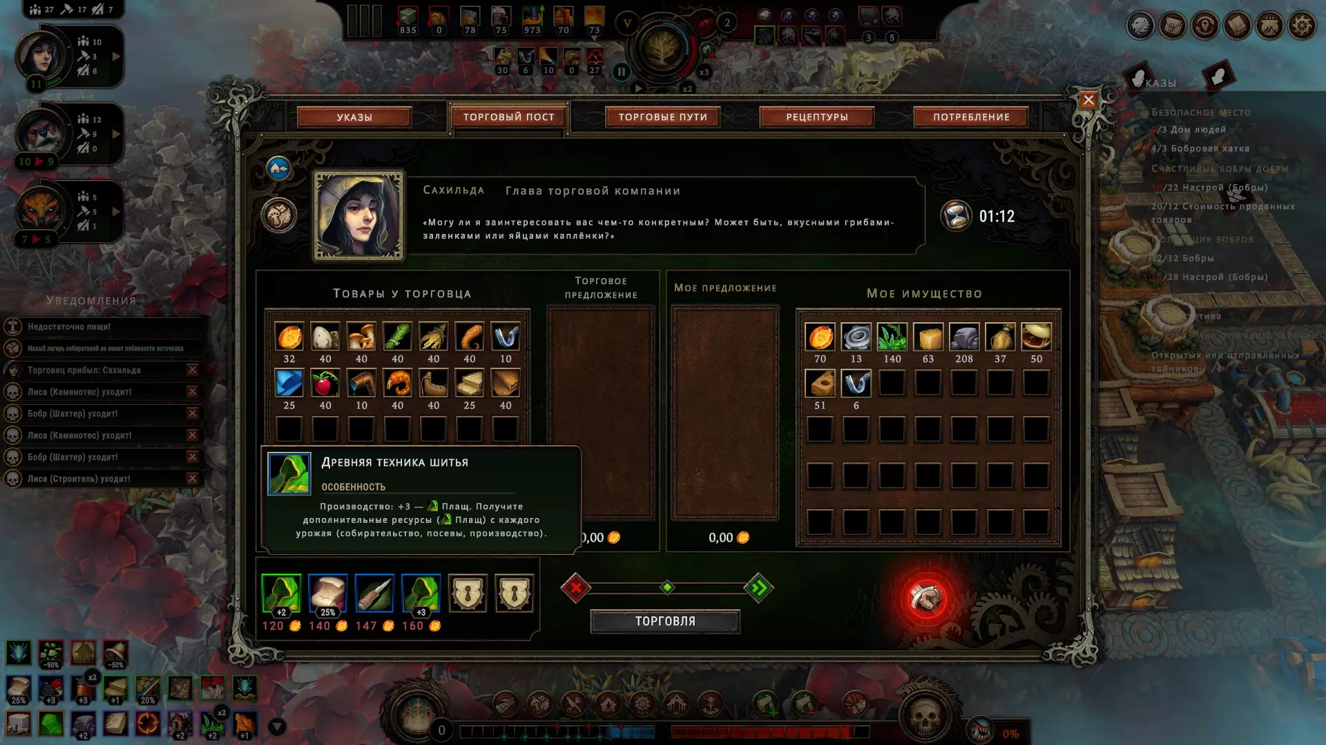 7块木板=2套建筑材料,每套建筑材料正好价值1金币(如果您还记得的话,这里的金币等价物是琥珀,但这样说更便于我解释,大人),而在锯木厂,用3单位木材可以制作2块木板。安装好水力发动机,然后就开工!要是安装两台锯木厂,再派海狸去那里工作呢?之后再建个磨坊(原材料消耗差异不大),然后派人去那里干活。这样分配能让你获得最大收益,因为正如你所知,海狸在处理木材时会有+10%的几率使产品数量翻倍,而人类的相同加成则适用于农产品相关工作。至于你在磨坊生产建筑材料这件事,没人会在意——毕竟是磨坊,所以无论人类在里面做什么,都能享受加成。结果能带来相当不错的收益!如果有人给你带来工坊图纸,也没关系,可以使用临时摊位,虽然少了3块木板,还少了两个位置,但也没什么大不了的,反正这东西利润高得吓人!不过我们说的是锯木厂。如果你注意到的话,卷轴上的图案表明,还存在可用于制造建筑材料的替代资源!总共4块布料或4块砖块(回想一下砖厂,布料也很容易获取),这样效果甚至更好,而木材可以节省下来用于更合理的用途! 如果有机会将原材料加工成更有价值的东西,就不要出售原材料。成品总是更贵,而且大部分资源即使没有先进建筑也能进行加工,临时哨站将在这方面为你提供帮助!所以说,大人,您一直都有这样的机会。即使您自己也能获取原材料,也别犹豫从商人那里购买,这样就能将生产提升到新的规模,这肯定是值得的。 当然,如果您的食物充足,也可以用蘑菇来交易。我认识一位蘑菇大亨,他就建了四个温室,然后……啊,对了,您还没解锁温室呢。