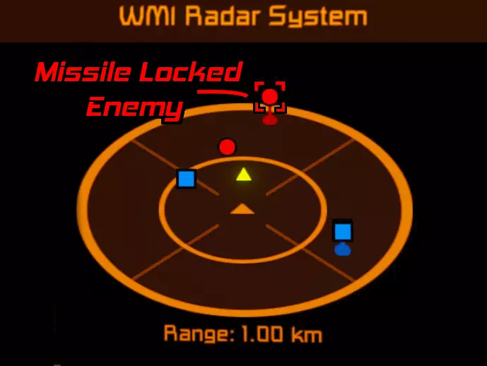 任何配备了炮塔型雷达(33.1.5版本或更高)的舰船,若处于配备LAMP的舰船或正在广播(关闭隐身模式)的WHAM导弹的广播范围内,将显示通过摄像头或炮塔制导模式锁定的目标。被锁定的目标会被一个瞄准框包围(如右侧图片所示)。瞄准框的颜色反映目标的关系;在默认配色方案中:蓝色为友方,黄色为中立,红色为敌方。 注意:如果想要增加雷达的作用范围,可以使用范围参数,或在雷达可编程方块的自定义数据中配置手动范围覆盖。这不会神奇地增加你的炮塔的探测范围,但会增加你通过其他来源(如:WHAM、LAMP、其他雷达)联网绘制目标的范围。 高级功能:远程发射导弹