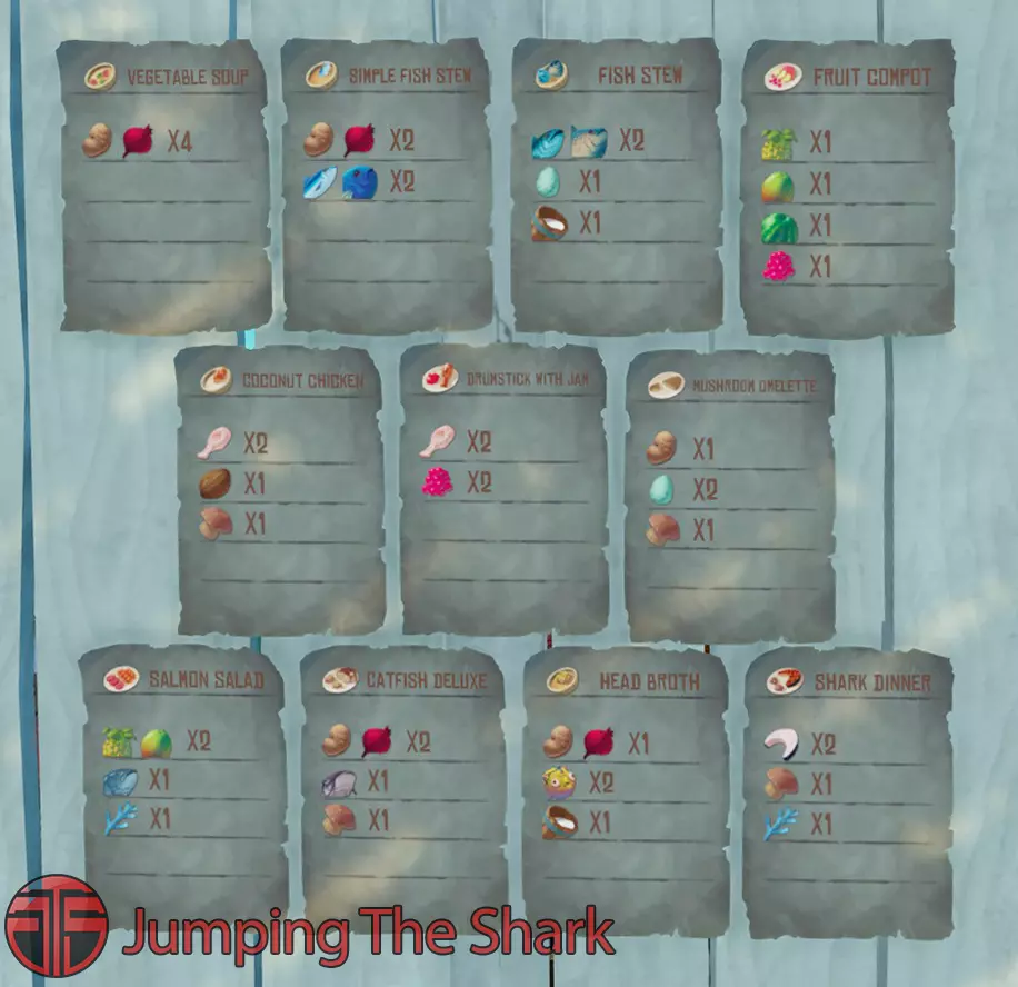 按照食谱烹饪一餐 所有游戏内食谱 共有12种餐食 其中3种可在交易站购买,也可在大型岛屿上找到 还有8种冰沙 其中2种可在交易站购买,也可在大型岛屿上找到