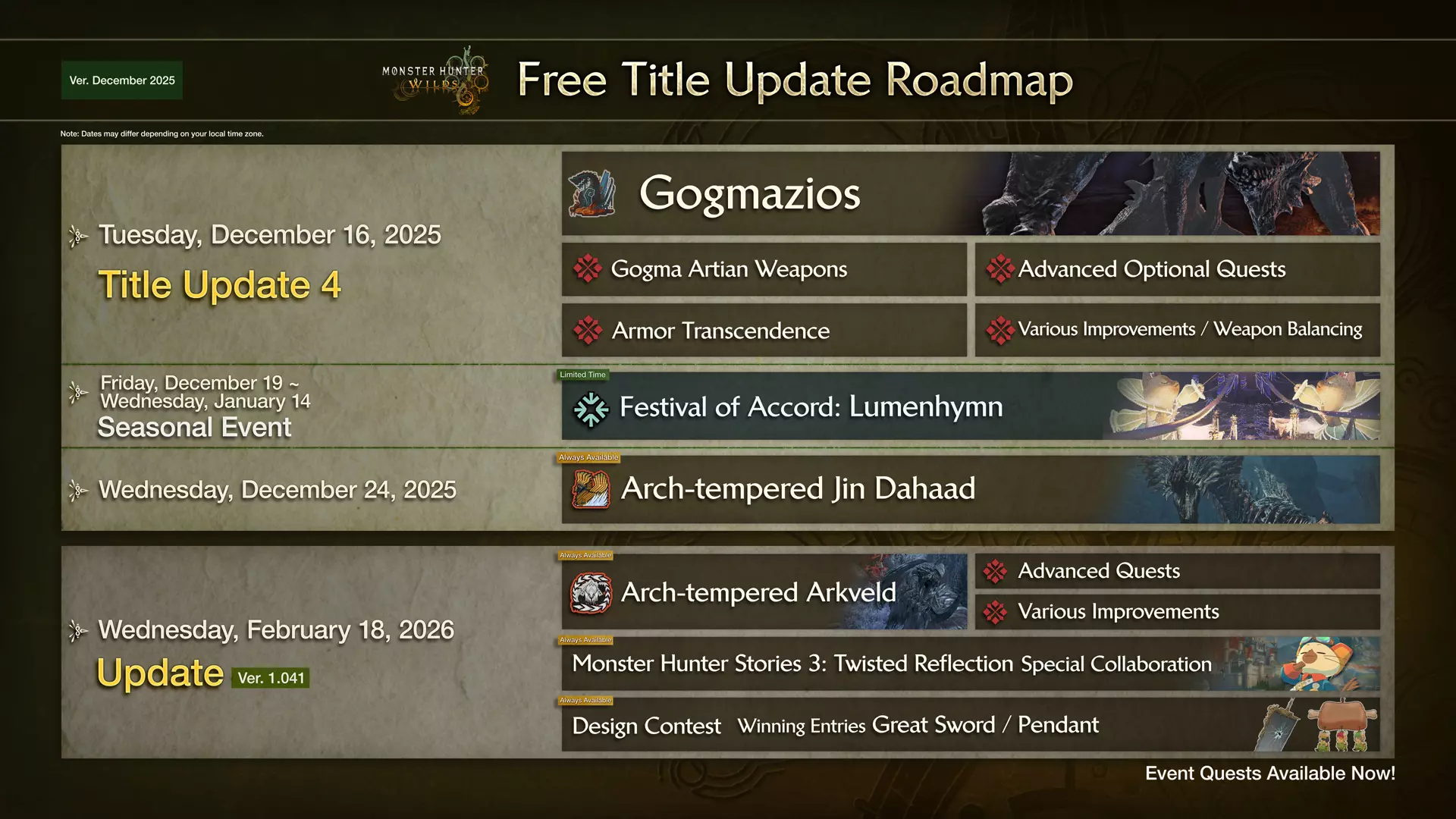 免费标题更新4 – 版本1.040 发布日期:2025年12月16日 注意:维护结束后即可使用。 准备好迎战古龙 Gogmazios 吧!