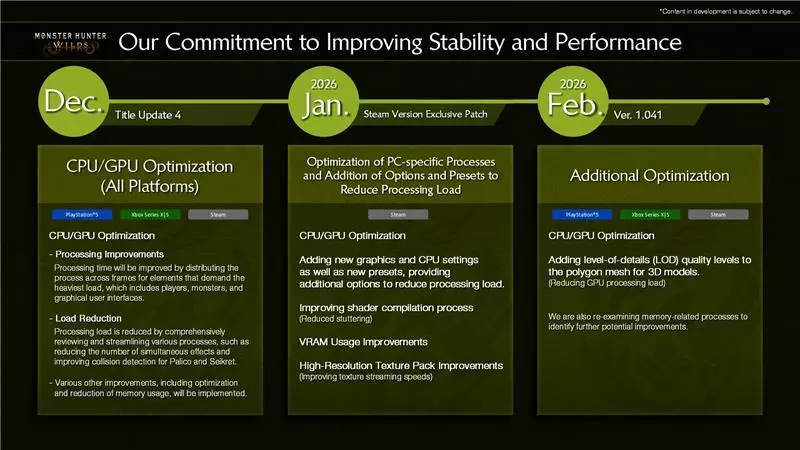 第四次标题更新将是《怪物猎人:荒野》的最后一次大型更新,届时将新增一只怪物。但这并不意味着我们的工作就此结束!在标题更新4之后,我们将发布补丁以提升Steam版的稳定性,并在2月推出最终更新,新增一个历战王变体。