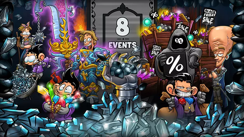 英雄们! 准备好迎接我们的黑色星期五周末吧!从周五(11月28日)到周日,蘑菇商人处将提供高达+33%的额外蘑菇,宝石矿中也只会产出黑色宝石和传奇宝石! 为此,我们将在周五至周日期间举办以下活动: - 黑色星期五 - 黑色宝石冲刺 - 史诗购物狂欢盛宴 - 奇妙堡垒庆典 - 整洁厕所时间 - 计件工作派对 - 辉煌黄金盛宴 - 超凡经验值活动 你可以通过点击城镇中的扩音器了解各活动的更多信息。