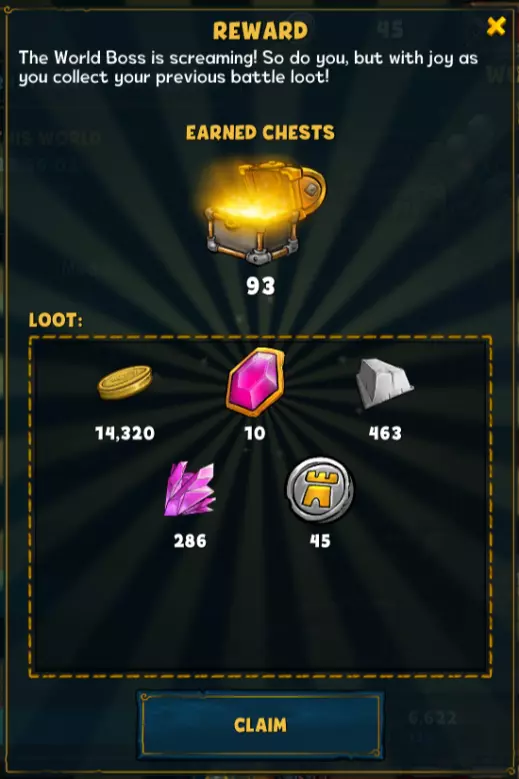 时机已到:让他明白自己攻击错了世界!从10月30日开始,你可以升级你的投石机,向世界首领展示你的实力!收集战斗战利品,赢取首领奖励,奋力登上排行榜顶端。 唯有齐心协力,你们才能击败他。英雄们,战斗时刻到了!你们的时间截止到11月2日午夜! 你能获得哪些战利品? 活动期间,你可以获得战斗战利品和首领奖励。参与奖励箱、最后一击奖励箱、单次最大伤害奖励箱以及伤害大师奖励箱会提供金币或资源等奖励。