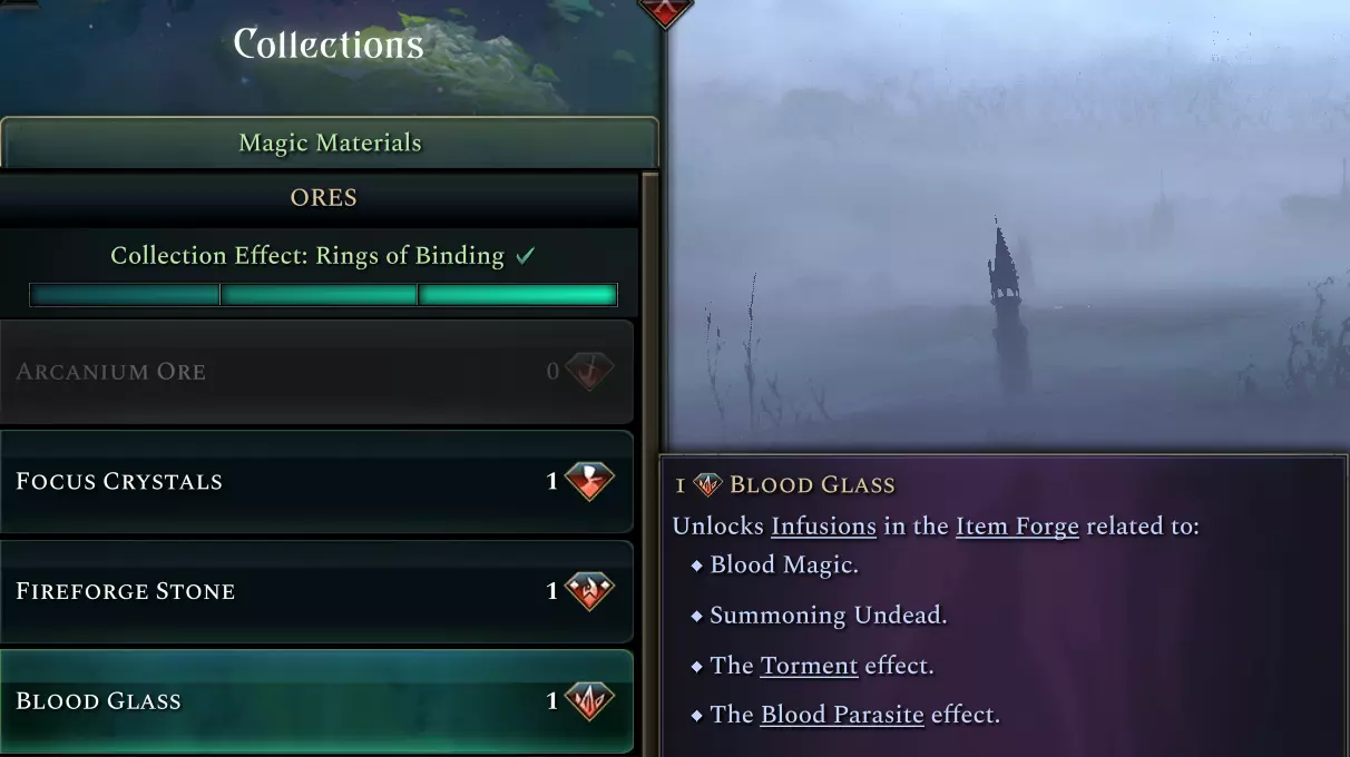 除经济加成外,血晶还能解锁一系列物品灌注效果,这些效果与该DLC的新法典内容相关,例如可施加名为“血寄生虫”的新状态效果。它的具体作用?我们将在后续的开发者日志中揭晓! 通常,新魔法材料会属于新的套装加成,但考虑到普通领域中无光区域数量有限,我们无法保证有足够的血晶来构成套装加成。因此,血晶被添加到矿石魔法材料套装中,同时套装要求也变更为需要3种独特的矿石魔法材料,而非收集全部矿石。