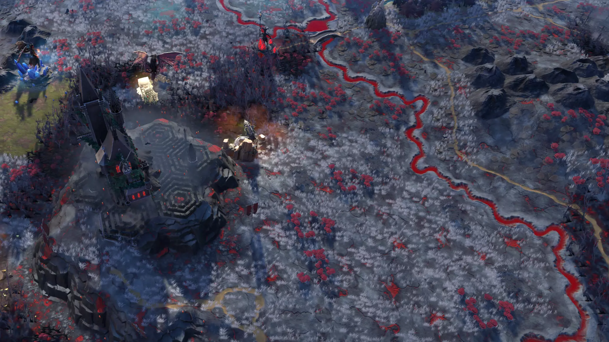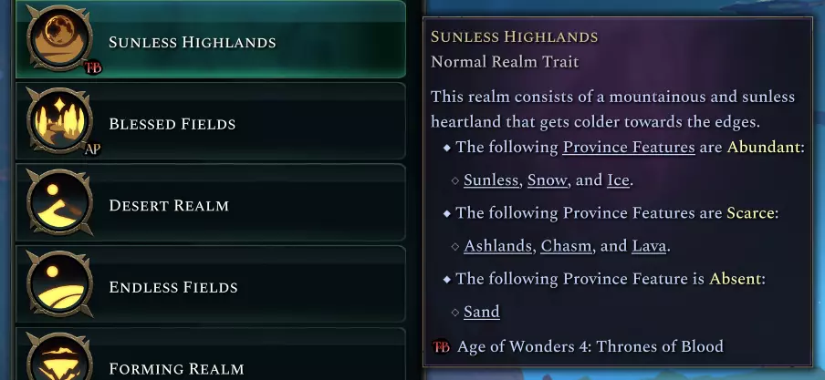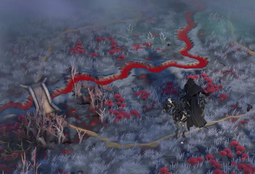 无光地形特写,其特点是生长着玫瑰与河流。 该地形的主要功能是为吸血鬼统治者和英雄提供安全的避难所。此地形及整个地下区域是世界地图上唯一不会让他们受到阳光虚弱影响的地方。 此外,该地形对仍有心跳的生物也略带敌意:非无心者单位的治疗和再生效果会降低,非无心者种族的城市会受到城市稳定性惩罚,为这片地形增添了几分阴森与宿命感。当然,作为年长的吸血鬼,你已学会让子民适应,因此完全免疫这些影响。 由于此地形对除不死族和吸血鬼外的大多数生物都具有敌意,因此在普通领域中仅会少量出现。不过,如果你想让世界笼罩在黑暗之中,可以选择“无光高地”领域特性,它会让你在一个拥有大量无光地形的领域开始游戏。吸血鬼统治者也可以通过法术和城市建筑自行传播这种地形。