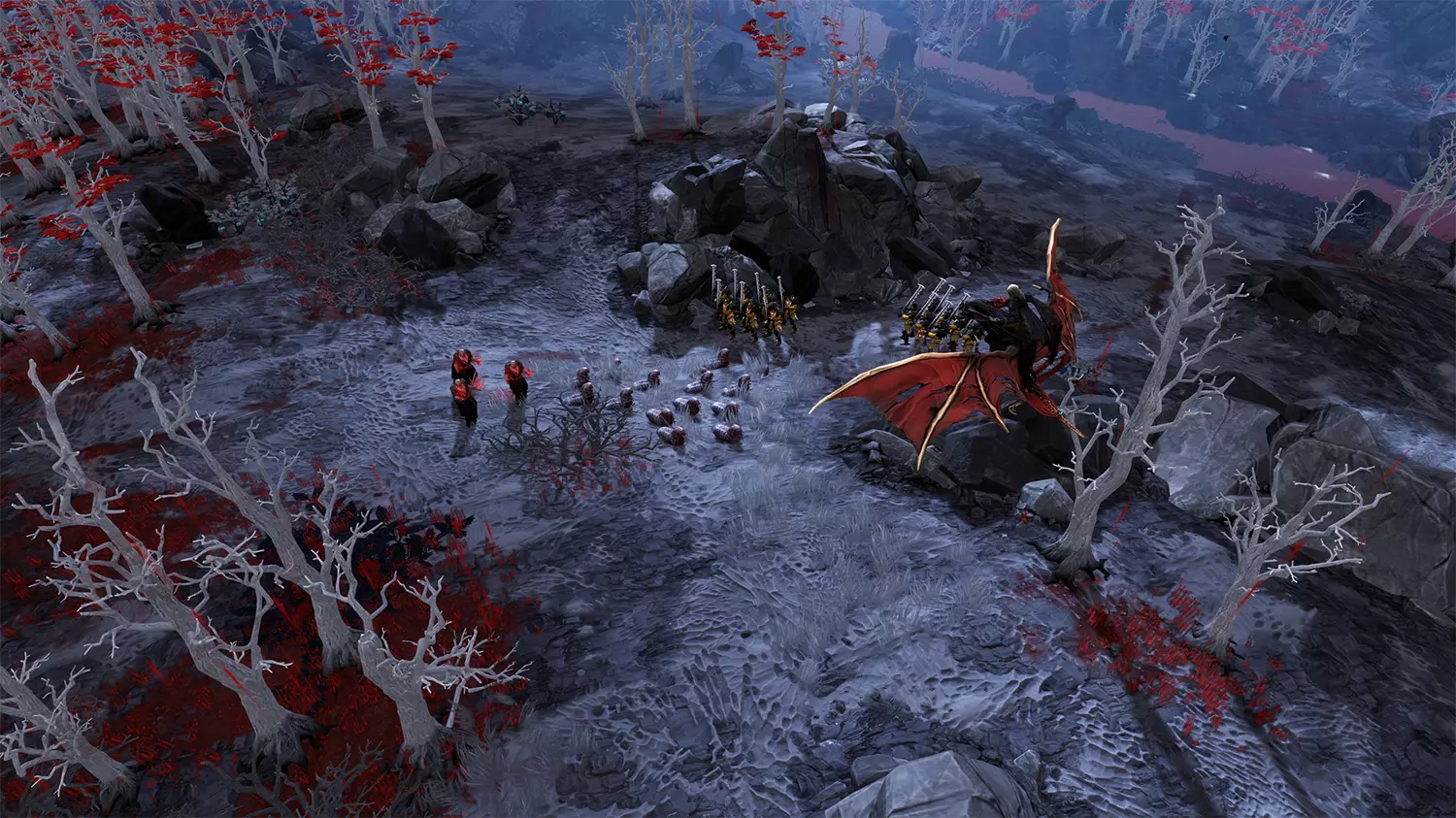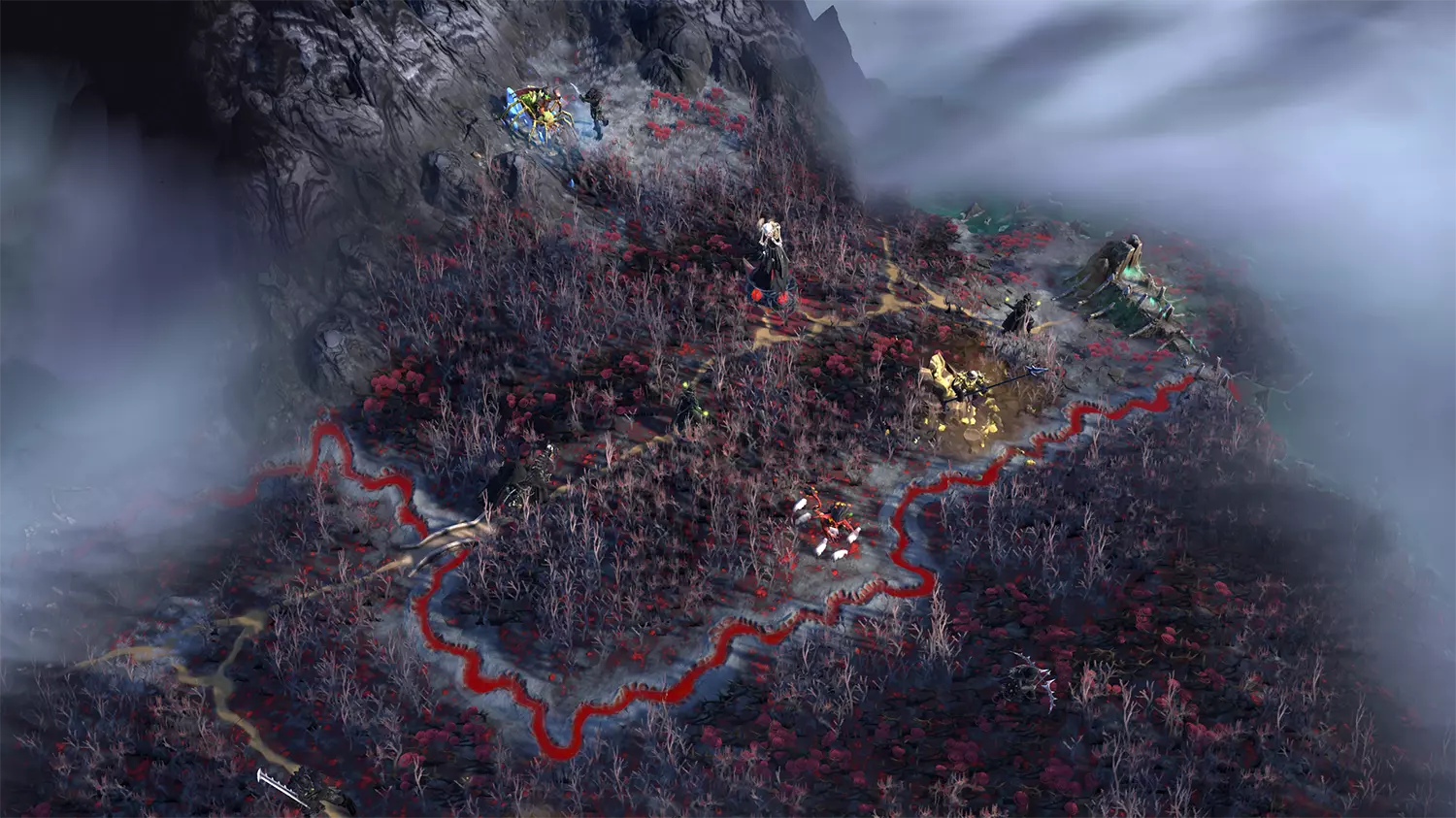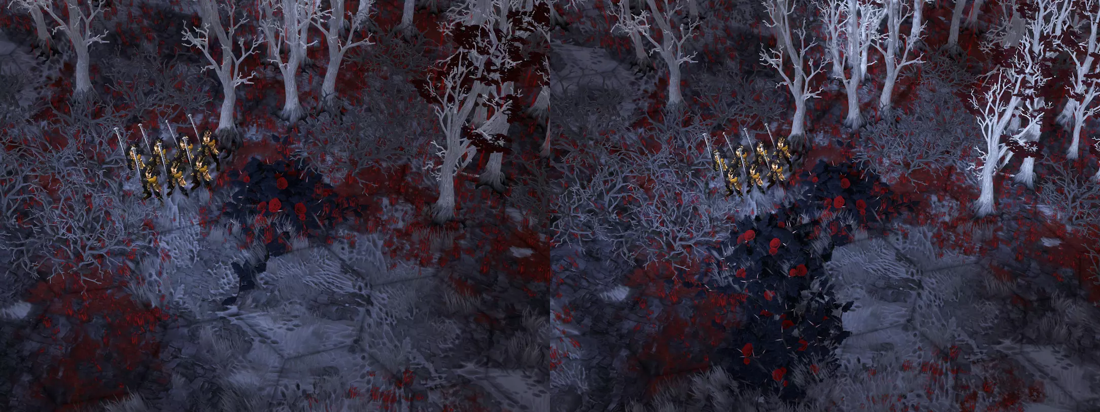 我们知道这款DLC中会加入吸血鬼,所以想围绕吸血鬼必须躲避有害阳光这一经典设定进行设计。我们还希望融入吸血鬼在各类媒体中常见的环境元素:阴森、神秘、令人难忘且带有浪漫色彩的森林与平原,背景则是黑暗的城堡。简而言之,我们需要一个合适的哥特式背景来衬托这些既美丽又恐怖的吸血鬼! 为了在整个区域范围内实现这一点,我们设计了“无光之地”地形,这是一种类似“幽影”的新型地形特征。它的特点是外观黑暗,带有大量深红色细节,比如玫瑰和血河。