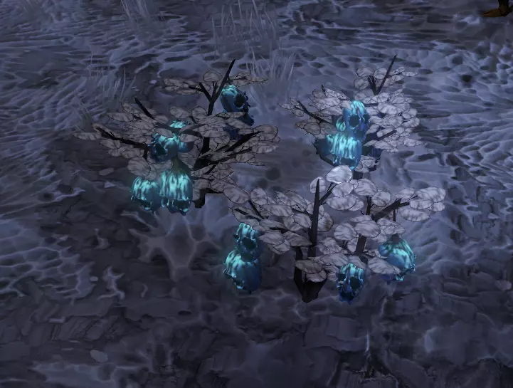 蔓延的玫瑰藤蔓四处生长 旁边是女妖荚果。其设计灵感源自干枯的金鱼草花瓣,形似微型头骨。女妖荚果被摧毁时会发出可怕的女妖之嚎,对2格范围内造成冰霜伤害,并附加虚弱和悔恨效果。