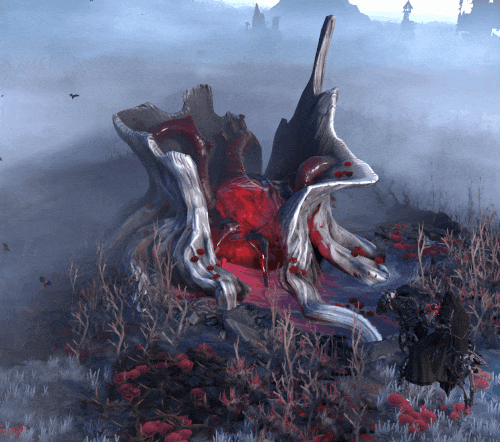 地标 最后,在全新的无光之地中能找到的最宏伟之物便是荆棘之心地标,这是一颗怪诞的巨大心脏,在大地之上搏动并蔓延着其 crimson(深红色)血管。该地标可能出现在任何有无光环境的领域,但在具有无光高地领域特性的领域中出现的可能性更高。