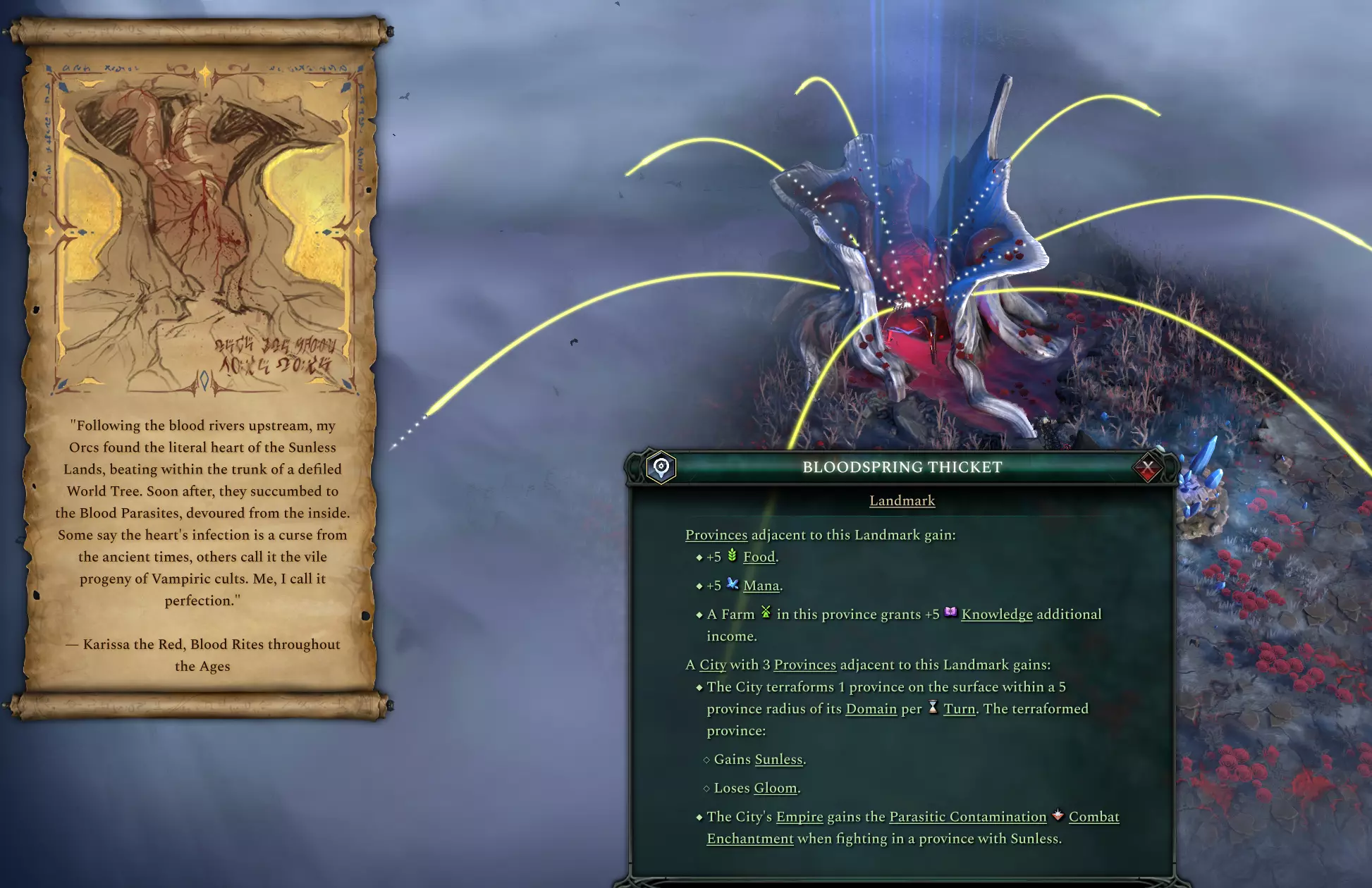荆棘之心在跳动 它会为相邻省份提供大量资源。但过度吞并,它就会开始在你的城市领域内外蔓延无光地形。如果你是吸血鬼统治者,或者恰好拥有了玫瑰窒息宫殿,这种危险的效果就能转为对你有利。