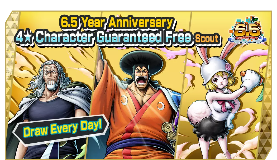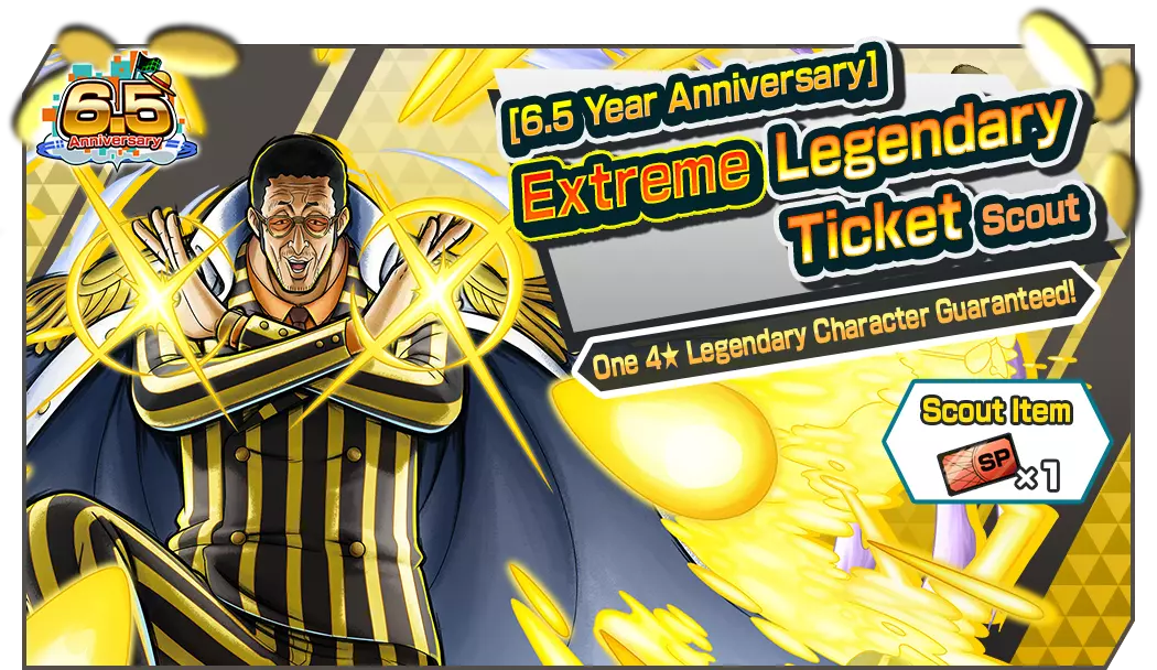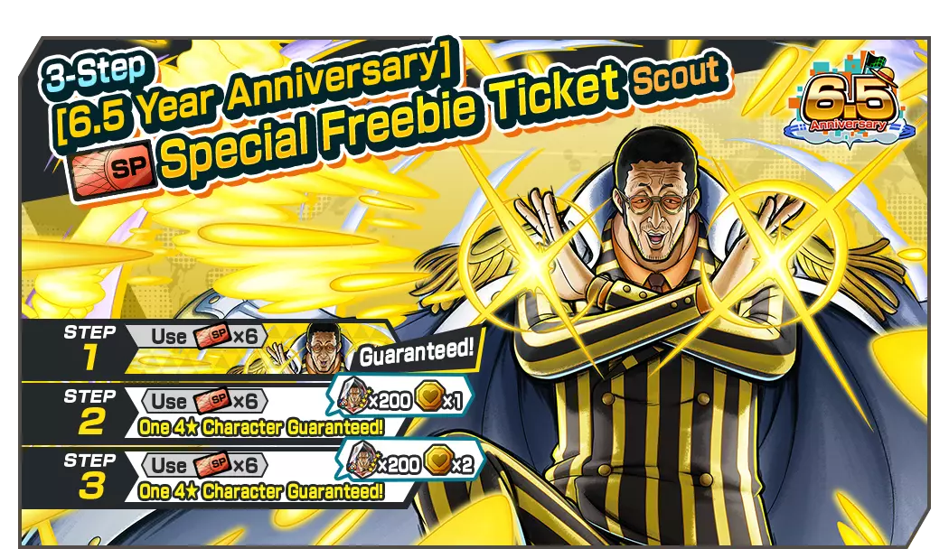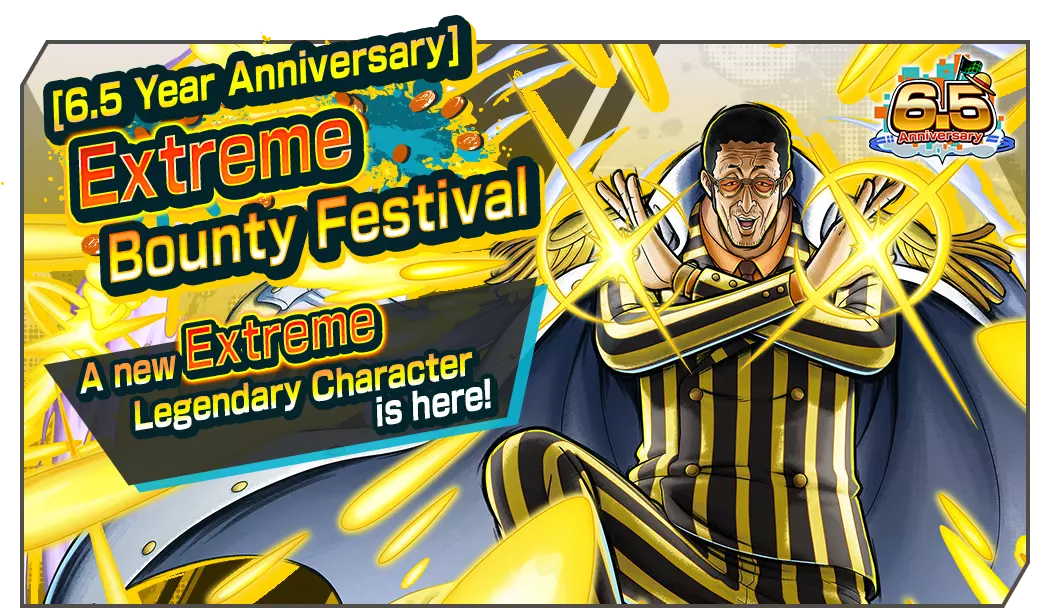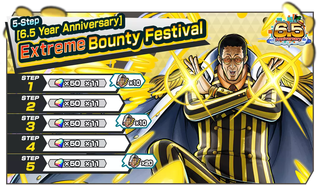 全新的天丛云剑·黄猿【波尔萨利诺】现已加入正在进行的【6.5周年庆典】极限悬赏庆典! 每日免费招募!6.5周年庆典每日免费1次4★角色保底招募现已开启!在勋章活动期间,你可以制作玩偶勋章和蓝草勋章。通过活动任务获取勋章材料! ■ 后续活动 6.5周年庆典登录奖励 6.5周年庆典勋章活动 6.5周年庆典勋章活动任务 【6.5周年庆典】极限悬赏庆典 5阶段【6.5周年庆典】极限悬赏庆典 【6.5周年庆典】极限传奇票招募 3阶段【6.5周年庆典】特别福利票招募 6.5周年庆典每日免费1次4★角色保底招募 超值特惠!彩虹钻石现已推出! 超级特惠!彩虹钻石现已推出! 精彩特惠!彩虹钻石现已推出! 含转移勋章的彩虹钻石现已推出! ■ 极限悬赏节