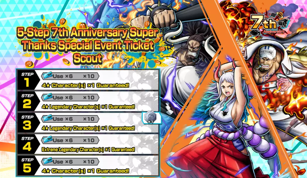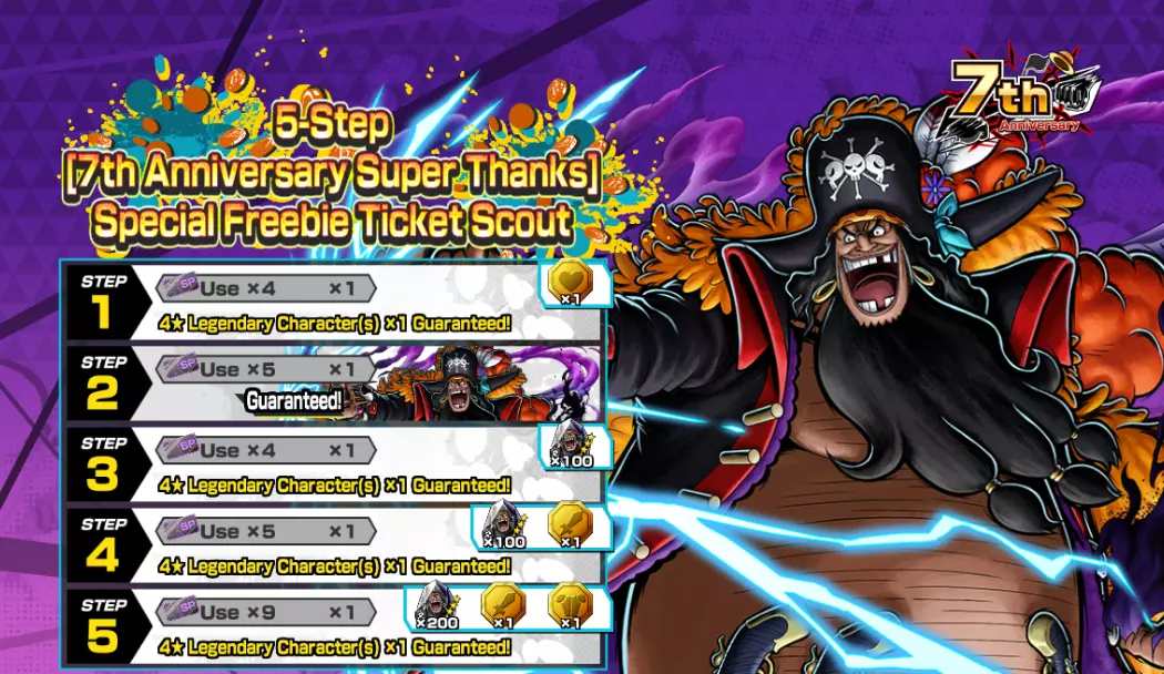 可使用5阶段【7周年特别感谢】特别免费券的招募!第2阶段必定获得1名4★四皇马歇尔·D·蒂奇!第1阶段以及第3至5阶段必定获得1名传奇角色!在第3至5阶段,你将获得四皇马歇尔·D·蒂奇碎片;在第1、4、5阶段,你将获得以下传承勋章!- 第1阶段道具:黄金传承勋章238,当装备角色出场时的属性为暗属性时,可传承24%的生命值提升。- 第4阶段和第5阶段道具:黄金传承勋章239,当装备角色出场时的属性为暗属性时,可传承24%的攻击力提升。- 步骤5 道具 黄金转移勋章240 一种转移勋章,当装备角色出场时的元素为暗元素时,可转移24%的防御力加成。 *此票券的使用期限截至2026年3月3日04:59(UTC)。 ■ 票券招募