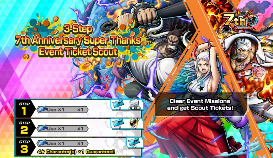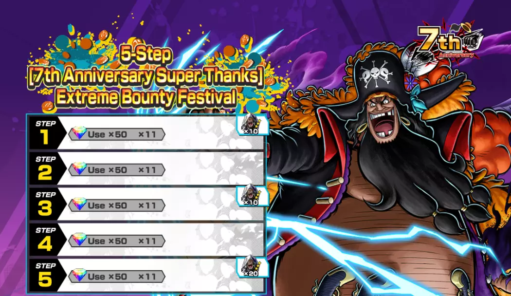 全新4★马歇尔·D·蒂奇已加入限时开启的极限悬赏庆典!每周可免费进行一次的7周年特别感谢免费10连招募现已开启! 总计可获得300颗彩虹钻石!7周年特别感谢直播登录奖励现已开启! 每日活动任务中每天都能获得活动招募券! 在勋章活动期间,可制作四皇黑胡子勋章与四皇红发勋章。勋章材料可从活动任务中获取!■ 未来活动 7周年特别感谢直播登录奖励 7周年特别感谢活动 每日活动任务 7周年特别感谢勋章活动 7周年特别感谢勋章活动任务 勋章升级支援活动 7周年特别感谢道具兑换 强化宝珠兑换 [7周年特别感谢]极限悬赏庆典5阶段 [7周年特别感谢]极限悬赏庆典 [7周年特别感谢]极限传奇票招募 [7周年特别感谢]极限传奇票DX招募5阶段 [7周年特别感谢]特别免费票招募3阶段 7周年特别感谢活动票招募5阶段 7周年特别感谢特别活动票招募 7周年特别感谢免费10连招募促销!彩虹钻石现已上架! 含增益宝珠的彩虹钻石现已上架! 含转移勋章的彩虹钻石现已上架! ■ 极限悬赏节