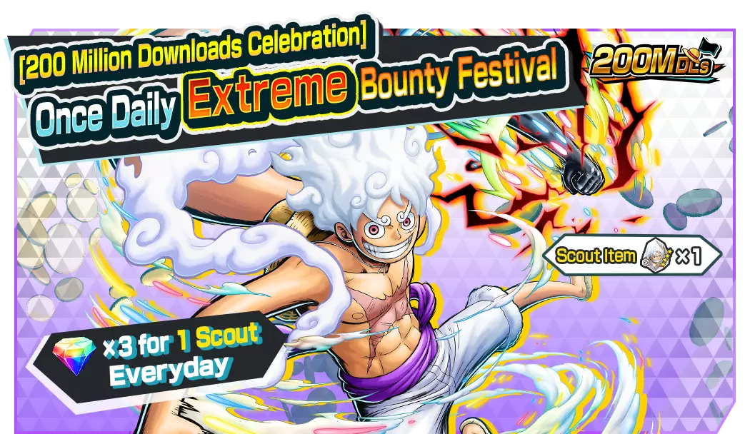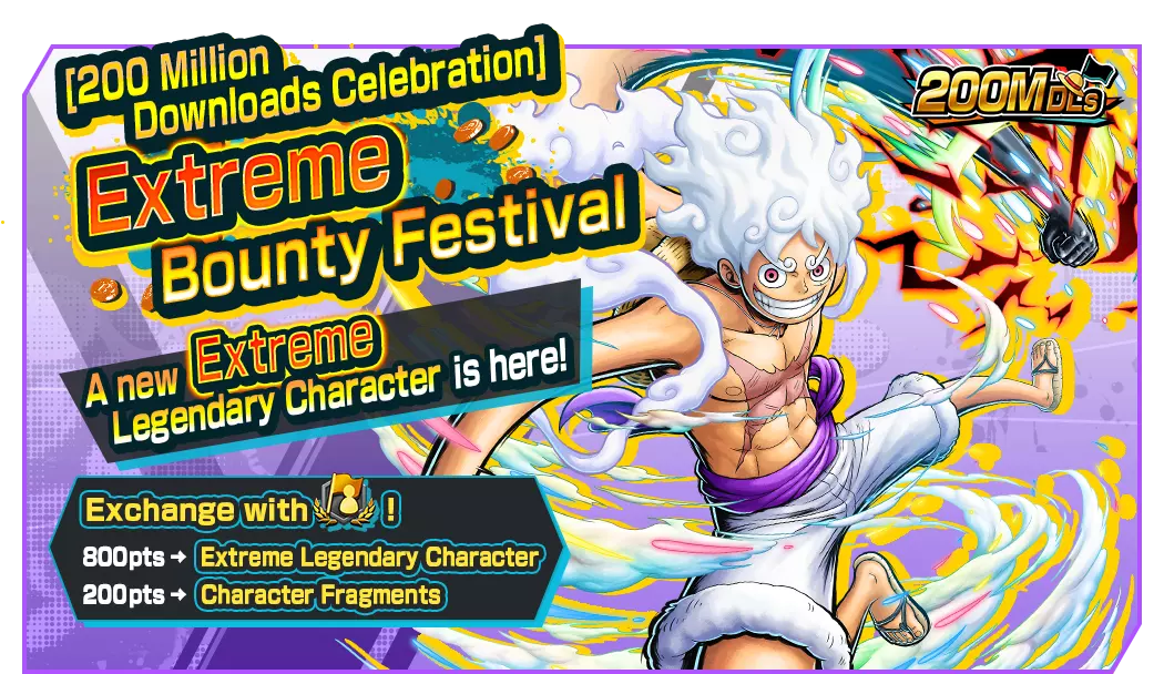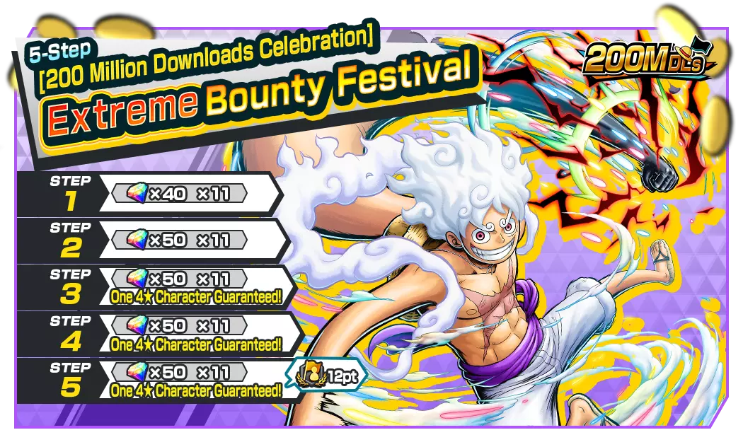 四皇蒙奇·D·路飞登场![2亿下载量庆典]极限悬赏节现已开启!2亿下载量庆典直播奖励!这是你在六天内总共获得300颗彩虹钻石的机会!在2亿下载量庆典可乐兑换处可兑换4★水晶球、特殊强化球等物品!在勋章活动期间,你可以制作“百倍强化勋章”和“山治(未来服装)勋章”。从活动任务中获取勋章材料吧!■ 未来活动 2亿下载量纪念登录奖励 2亿下载量纪念直播奖励登录奖励 2亿下载量纪念勋章活动任务 2亿下载量纪念可乐兑换 勋章升级支援活动 道具概率活动 联盟活动任务 [2亿下载量纪念]极限悬赏庆典 [2亿下载量纪念]每日一次极限悬赏庆典 5阶段[2亿下载量纪念]极限悬赏庆典 [2亿下载量纪念]极限传奇票招募 [2亿下载量纪念]极限传奇票DX招募 2亿下载量纪念免费10连招募 极限悬赏庆典庆祝!额外彩虹钻石特卖! 超值特卖!彩虹钻石现已推出! 超级特惠!彩虹钻石现已推出! 含转移勋章的彩虹钻石现已推出! 含强化宝珠的彩虹钻石现已推出! ■ 极限悬赏节