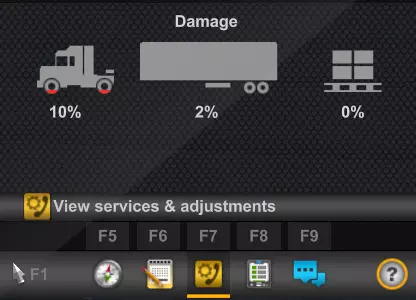 Route advisor 诊断页面。 损坏警告指示器 您会注意到的卡车损坏的第一个迹象是卡车仪表盘上的损坏警告指示器,以及仪表盘电脑上显示的“请联系服务部门!”“检查发动机”或类似信息(具体取决于卡车型号)。当卡车的任何主要部件累积的总损伤(损伤+磨损)达到或超过15%时,它们将显示出来。如果卡车的任何主要部件总损伤超过50%,仪表盘上会额外亮起一个严重损坏指示灯。轮胎损坏不会导致卡车仪表盘上出现任何警告指示灯。
