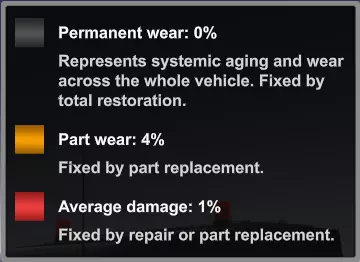 诊断模式下的挂车零件(旋转状态)和改装商店界面。这些组在游戏中也被称为“零件”,每个组都整合了众多(实际上的)独立零件,从而简化了游戏模拟以及玩家的操作流程。在购买或改装卡车、挂车的商店中也能找到此类零件组。卡车、挂车和驾驶室的配件不计入损坏记录系统,因此不会受损或产生磨损。每个零件可独立承受或累积损坏,并且可以单独进行维修或更换。损坏类型。本节将介绍游戏中出现的各种损伤类型,以及它们之间的相互关系,从而构成完整的损伤系统。 游戏中有三种损伤类型: 伤害 磨损 永久磨损 (如果后续我提及这三种损伤类型中的任何一种,它们将以粗体显示。)谈到零件状态时,我也可以使用“损坏”或“磨损”等术语,若未特别注明,这些术语并不指代此类情况。