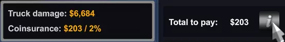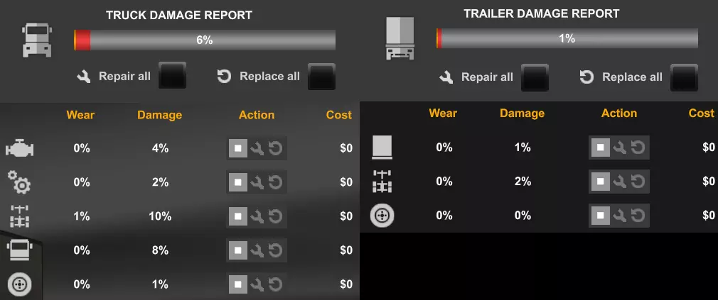 Франшизу по страхованию и процентную ставку можно просмотреть в интерфейсе диагностики. В этом примере застрахованный выплачивает только франшизу в размере 203 $, поскольку 6 684 $ * 2% = 133,68 $, что меньше 203 $. Если вы хотите посмотреть сами, значения, которые управляют концепцией страхования, можно найти в файле bank_data.sii в папке def. Поскольку в игре у нас нет каких-либо текущих расходов, я думаю, что такая страховка очень нереалистична. Кроме того, не каждый ремонт или общее обслуживание грузовиков будет оплачиваться по страховке. На мой взгляд, в игре должна быть предусмотрена возможность выбора, обращаться ли в страховую компанию за ремонтом или нет. Мой совет - просто игнорировать концепцию страхования в ее нынешнем виде и радоваться снижению стоимости ремонта. В противном случае, если вы хотите, чтобы ваша игра была более реалистичной, вам следует установить мод, который отменяет сострахование и заставляет вас платить полную сумму за ремонт. Ремонт и замена деталей. Детали можно отремонтировать или заменить, обратившись в сервисный центр. Повреждение можно устранить, выбрав значок ремонта на детали. Стоимость ремонта - это процентная величина повреждения, отображаемая в пользовательском интерфейсе, умноженная на стоимость детали в магазине. Если деталь, например, стоит 15 000 $, а ущерб составляет 10%, то стоимость ремонта составит 1500 $. При ремонте детали урон будет снижен до 0%, даже если технически он был выше, чем указано в пользовательском интерфейсе. Кроме того, стоимость всегда будет рассчитываться исходя из процента, указанного в пользовательском интерфейсе, а не из фактического ущерба, даже если он выше в памяти игры. Замена детали также устранит все ее повреждения. Если деталь повреждена, но общий износ уже составляет 100% или превышает его, то ремонту она больше не подлежит. Если деталь имеет повышенный износ, то единственный способ устранить его - это заменить деталь, стоимость которой будет равна полной стоимости детали в магазине. Чтобы заменить деталь, выберите опцию "Заменить" на детали в интерфейсе ремонта. Замена детали приведет к снижению износа и повреждений до 0%, независимо от фактической степени износа или повреждения. Замена детали также эффективна, если износ самосвала составляет 100%. Реставрация. Постоянный износ можно устранить только путем полного восстановления грузовика. Это можно сделать при любом уровне постоянного износа, нажав кнопку "Запросить полное восстановление" в левой части интерфейса сервиса. Восстановление грузовика приведет к обнулению показаний одометра постоянного износа и устранению любых повреждений или износа всех частей грузовика. Восстановление грузовика обойдется намного дороже, чем его первоначальная цена в магазине. Стоимость восстановления любой части грузовика составит 1000 $, что в 1,1 раза превышает первоначальную цену в магазине. Те же цены применяются к восстановлению прицепов. Переменные, которые определяют стоимость реставраций, можно найти в файле service_data.sii в папке def. Поскольку постоянный износ никак не влияет на игровой процесс, я бы посоветовал подождать как можно дольше, прежде чем восстанавливать грузовик. Единственное изменение, которое вы можете заметить, - это когда постоянный износ достигает 100%, потому что тогда в интерфейсе диагностики больше не отображается изн