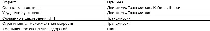 沃尔沃VNL(2018)的损坏警告指示器和显示屏消息。 损坏后果。 受损卡车在累计损坏达到总损坏量的15%或以上后,可能会因不同部件而受到一种或多种影响。在此之前,损坏不会造成任何后果,卡车的表现将与完全未损坏的卡车相同。下表显示了可能的效果及其引发细节: