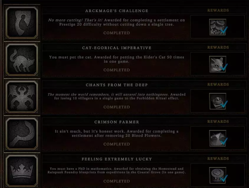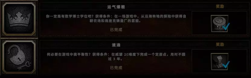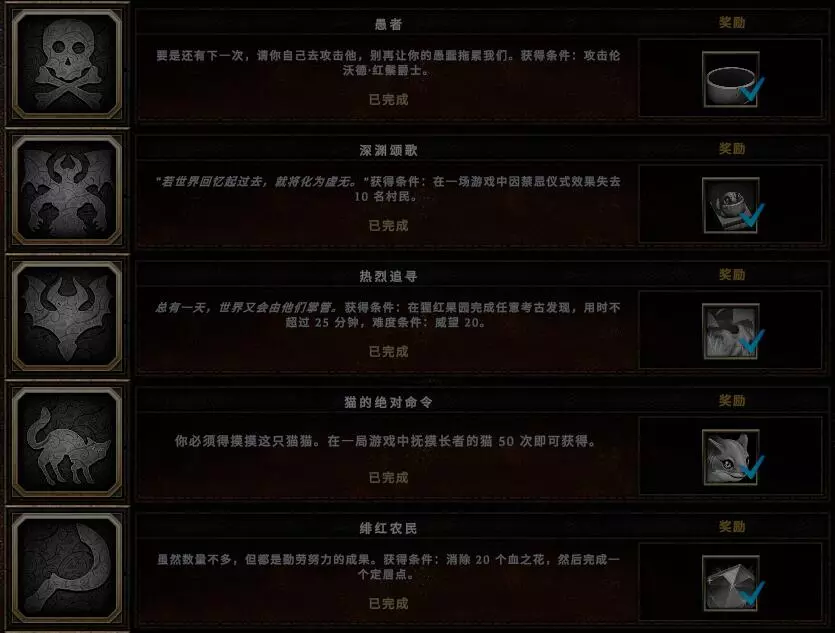 备注:1.愚者成就需要雷铸基石:叛逆,该基石只有在风暴祭坛正常刷出橙色基石的年份的暴雨季才可以刷出。 2.长者的猫可以通过持续抚摸来暂停其行动。 3.运气爆棚这一成就真的只能看运气,在尽可能获取更多蓝图的情况下,我刷了3个下午才成功。