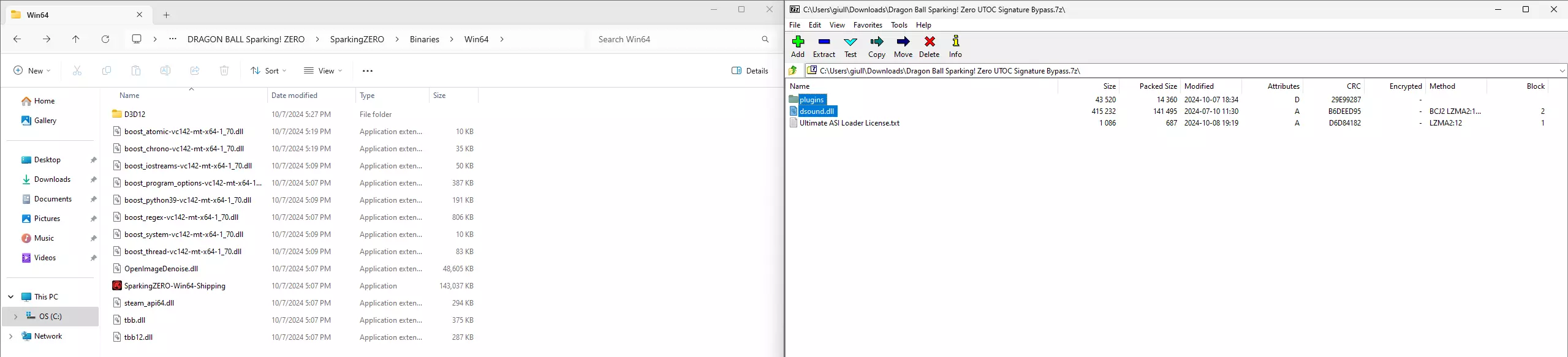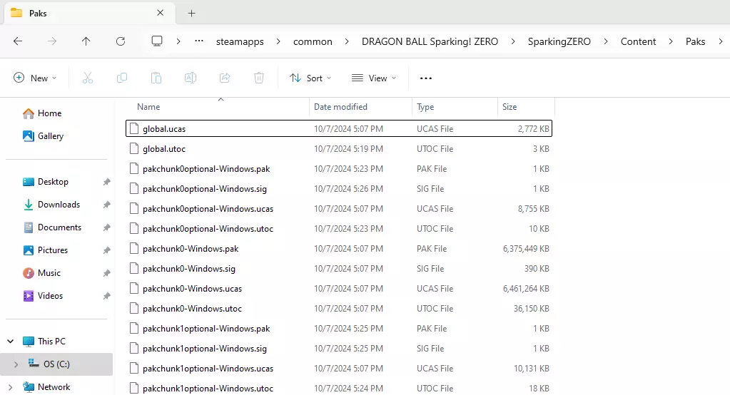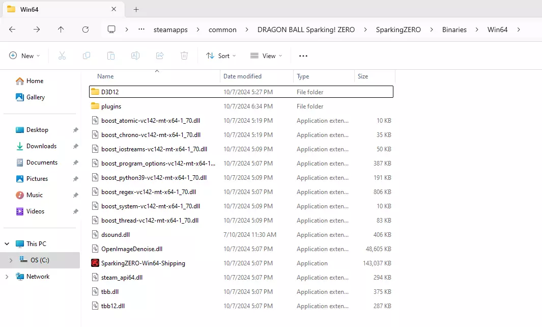 为了让这一切正常运行,我们必须下载模组补丁,这样才能安装我们的模组,当然还有我们想在游戏中使用的那些模组。这里是补丁以及一些可以下载模组的网站:《龙珠:电光火石ZERO》UTOC签名绕过补丁[ko-fi.com]、模组网站[gamebanana.com]、模组网站2[www.nexusmods.com]。现在我们进入游戏主目录文件夹,并按照以下路径操作:SparkingZERO/Binaries/Win64