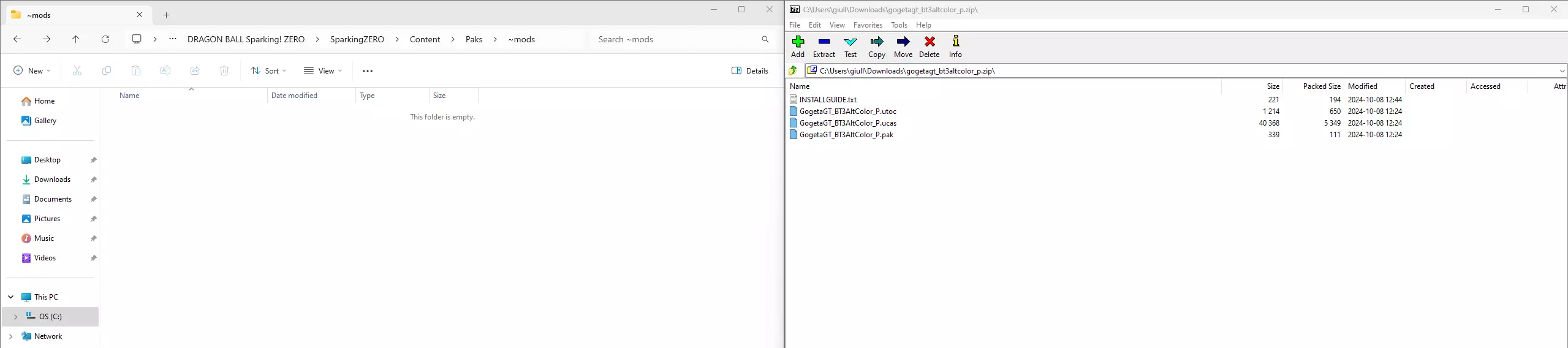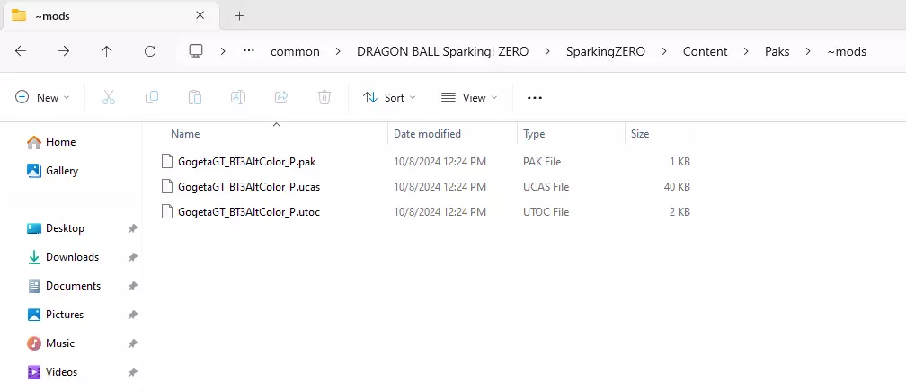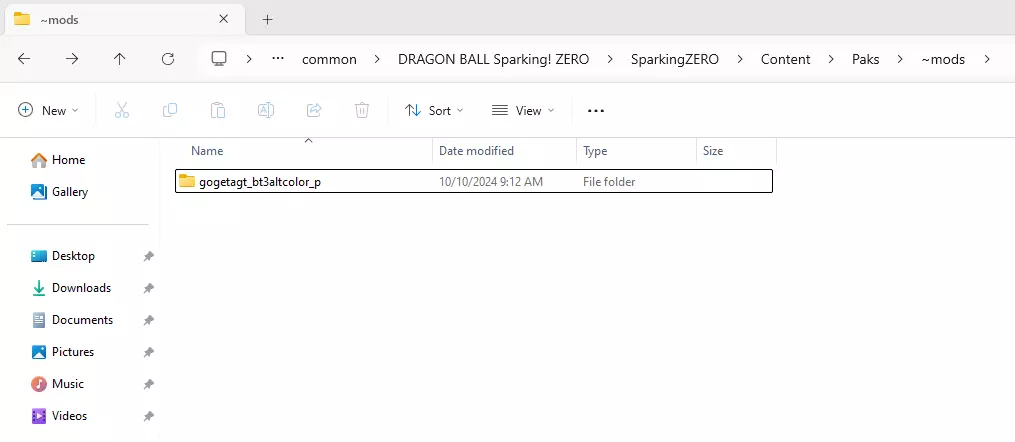 现在我们要下载我们想在游戏中使用的模组,在本指南中,我将要安装的模组是 Gogetta Ssj4 Alternate Colors [gamebanana.com]。现在我们回到游戏主目录文件夹,按照以下路径操作:SparkingZERO/Content/Paks