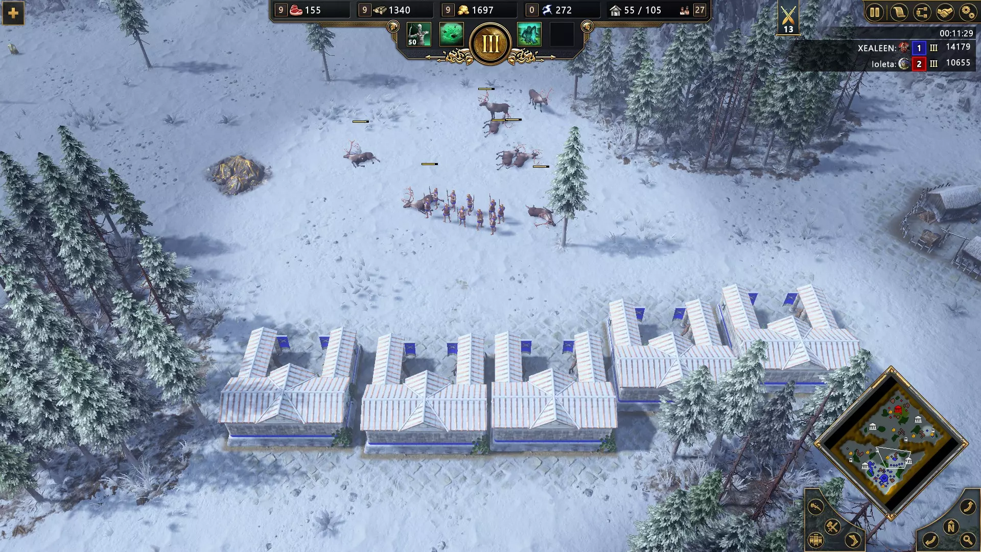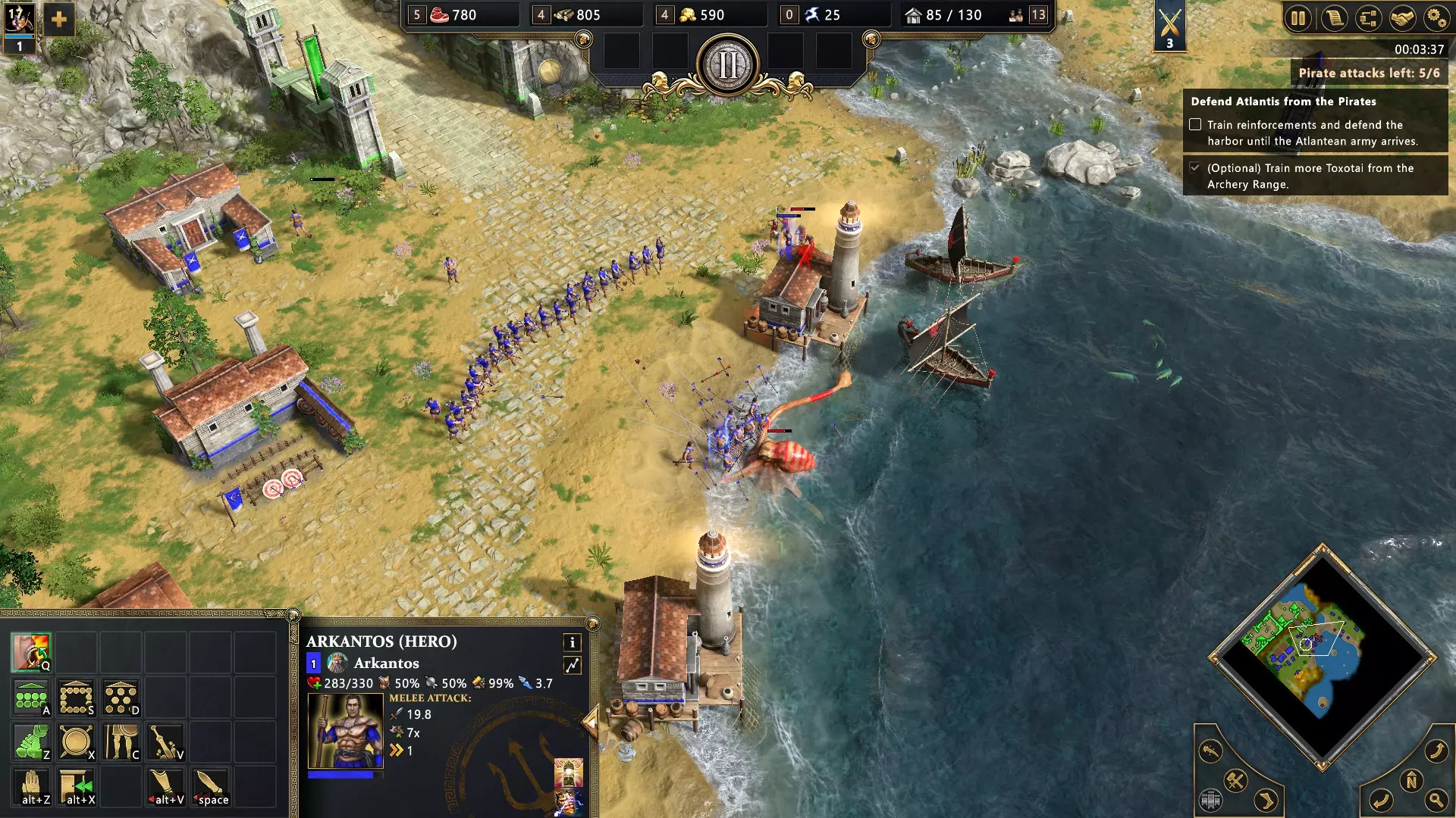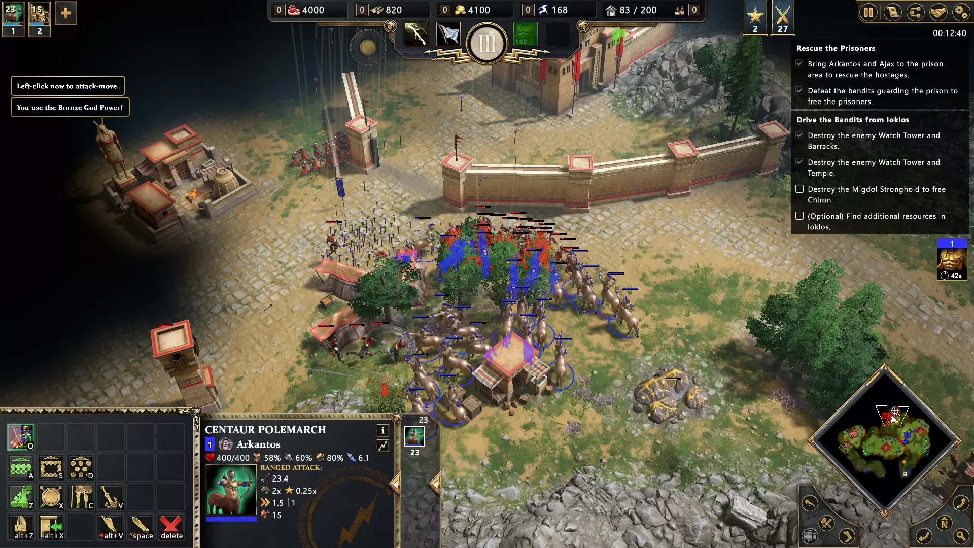 开始匹配,选择宙斯或波塞冬作为主神。进入英雄时代并选择赫尔墨斯作为次神,以在你的神庙中解锁神话部队半人马的训练。这支队伍是出色的远程部队,能够百发百中。训练尽可能多的半人马并消灭敌军。不要忘记“战役”部分的成就“赫戎的学徒”。您可以同时获得这两个成就。