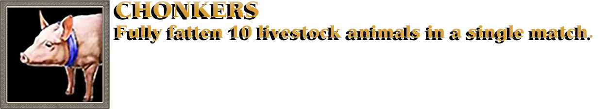 要达成此成就,你需要饲养动物,例如牛、山羊、猪和牦牛。与其他动物(如野生动物)的区别在于,野生动物需要进行捕猎,而饲养动物则可以在你的任何一支部队经过它们身边时将其捕获并加以控制。请注意:如果您的队伍距离正在觅食的动物较远或数量少于敌人,敌方玩家和AI也可能会捕获它们。 比赛刚开始时,地图上的每只觅食动物都含有少量食物,但您让它们存活的时间越长,它们就会变得越肥硕。除了生命值条外,这些动物还有一个显示其饱食度的进度条。让10只由你控制的动物达到最大饱食度,该成就就属于你了。