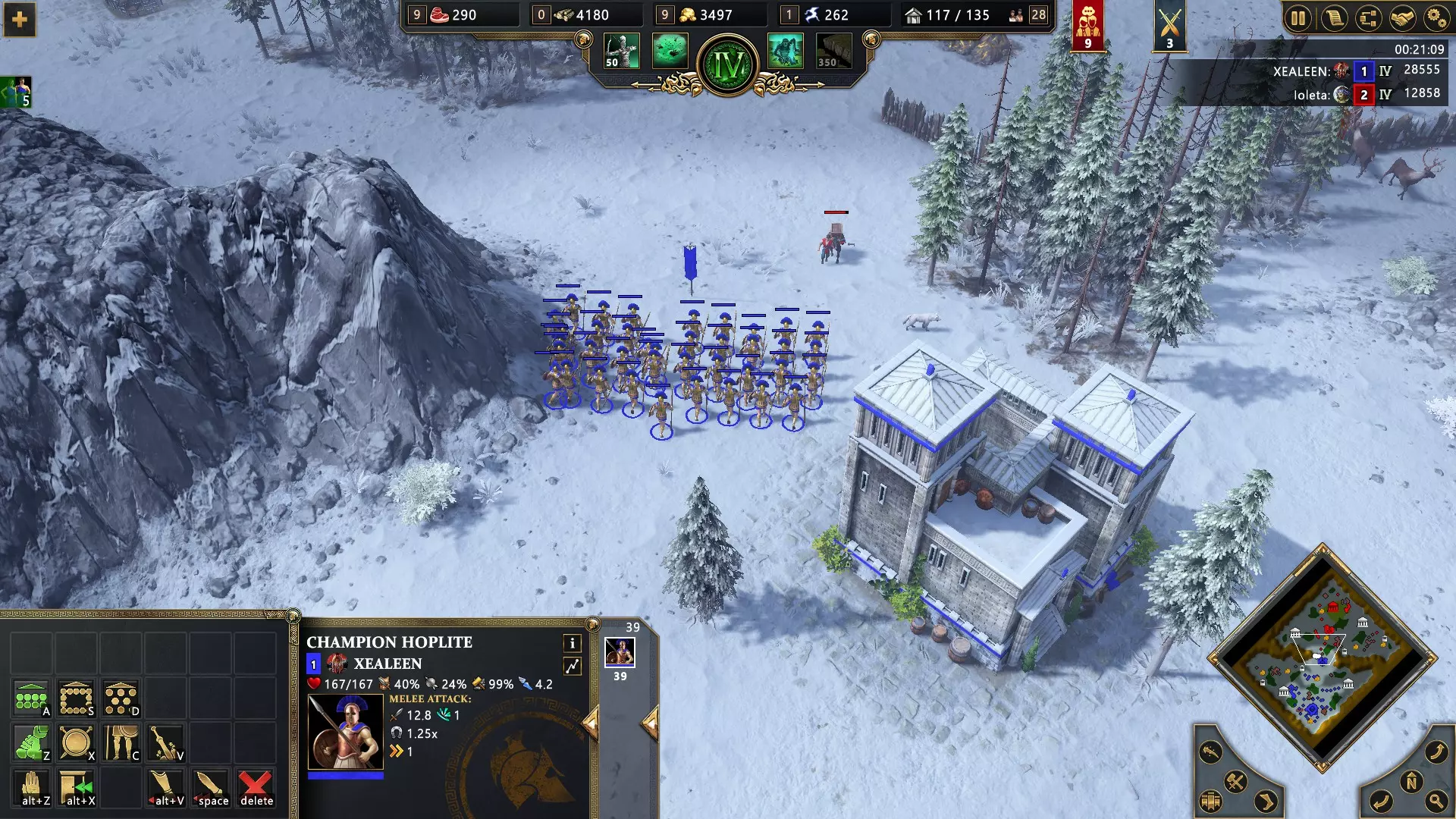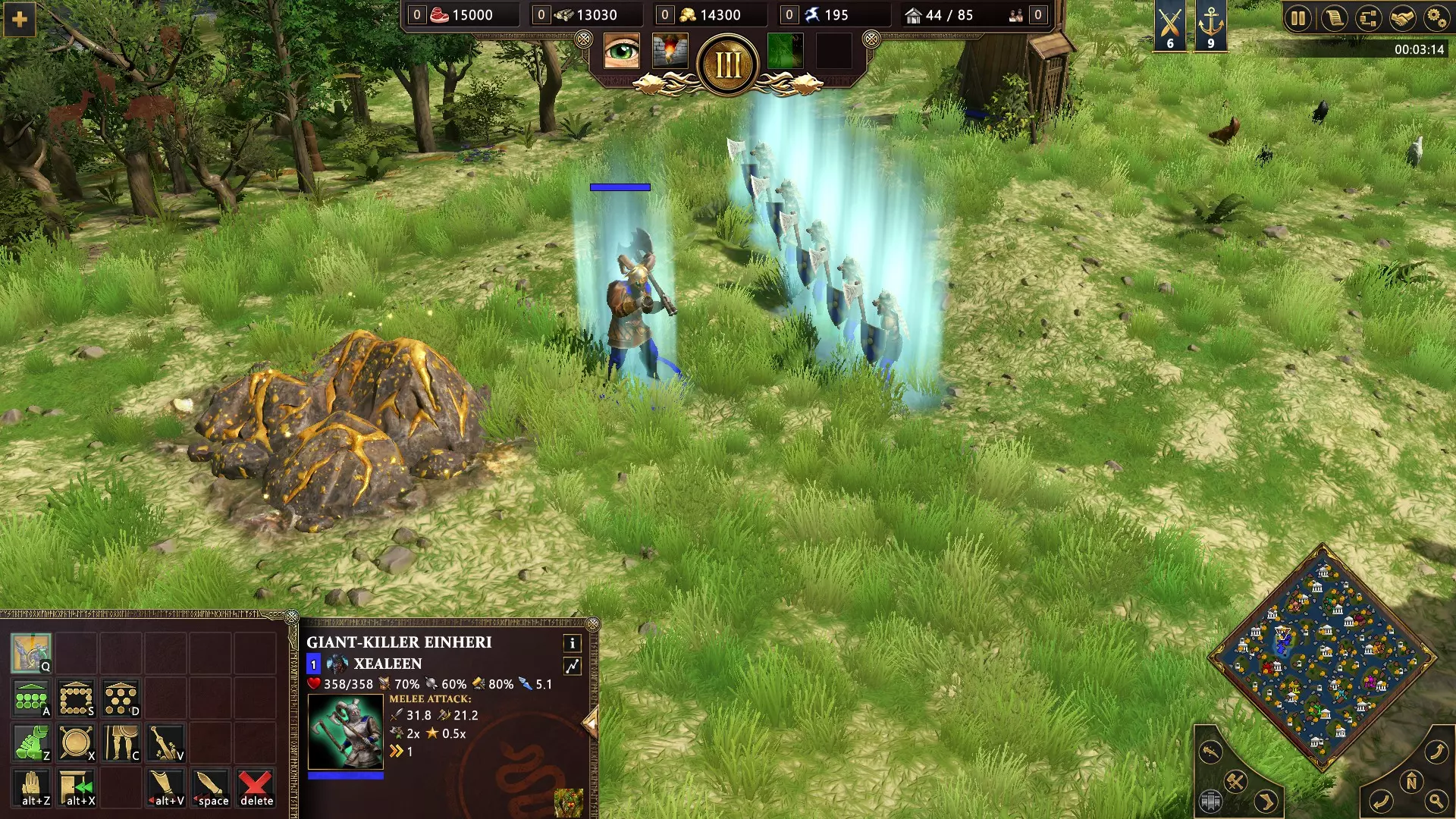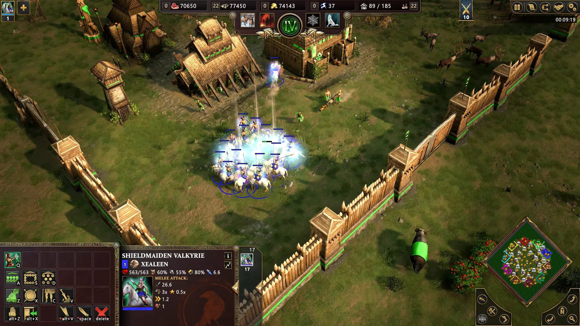 开始匹配,选择奥丁或洛基作为主神。进入古典时代后,选择海姆达尔作为次神,以在你的神庙中解锁英灵(Эйнхерии)这一神话单位的训练。英灵可以通过Q键使用“号角爆破”技能:10单位范围内的友方单位获得50%攻击力加成(效果会逐渐减弱直至消失)。此外,该技能还会对附近的敌人造成少量伤害。