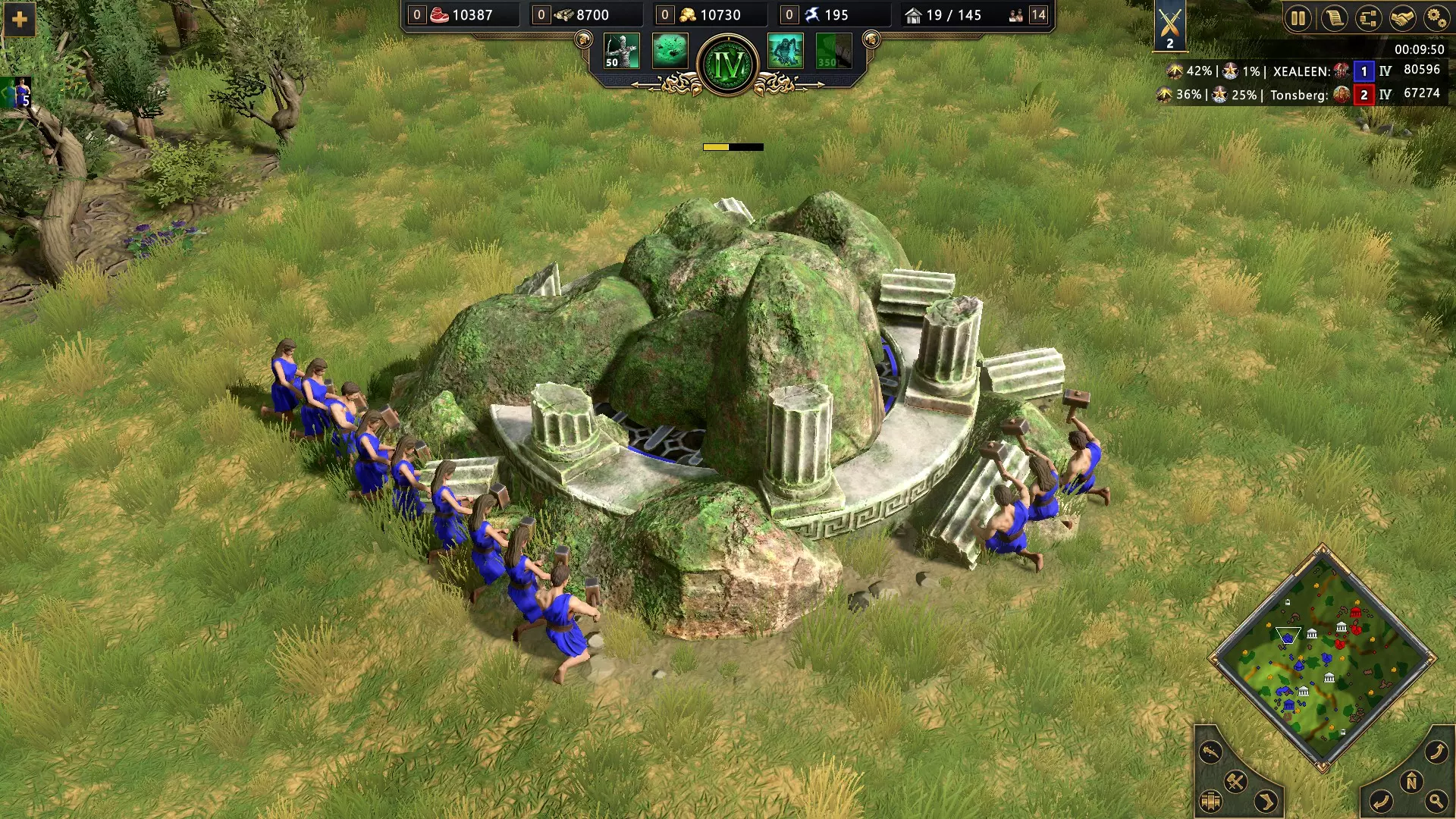 选择克洛诺斯作为主神开始匹配。建造神庙并研究“时间混沌”科技。该科技会将“时间推移”可同时移动的建筑数量增加2个(总计3个),并使哨塔、宫殿和镜像塔线路上使用“时间推移”的成本降低一半。