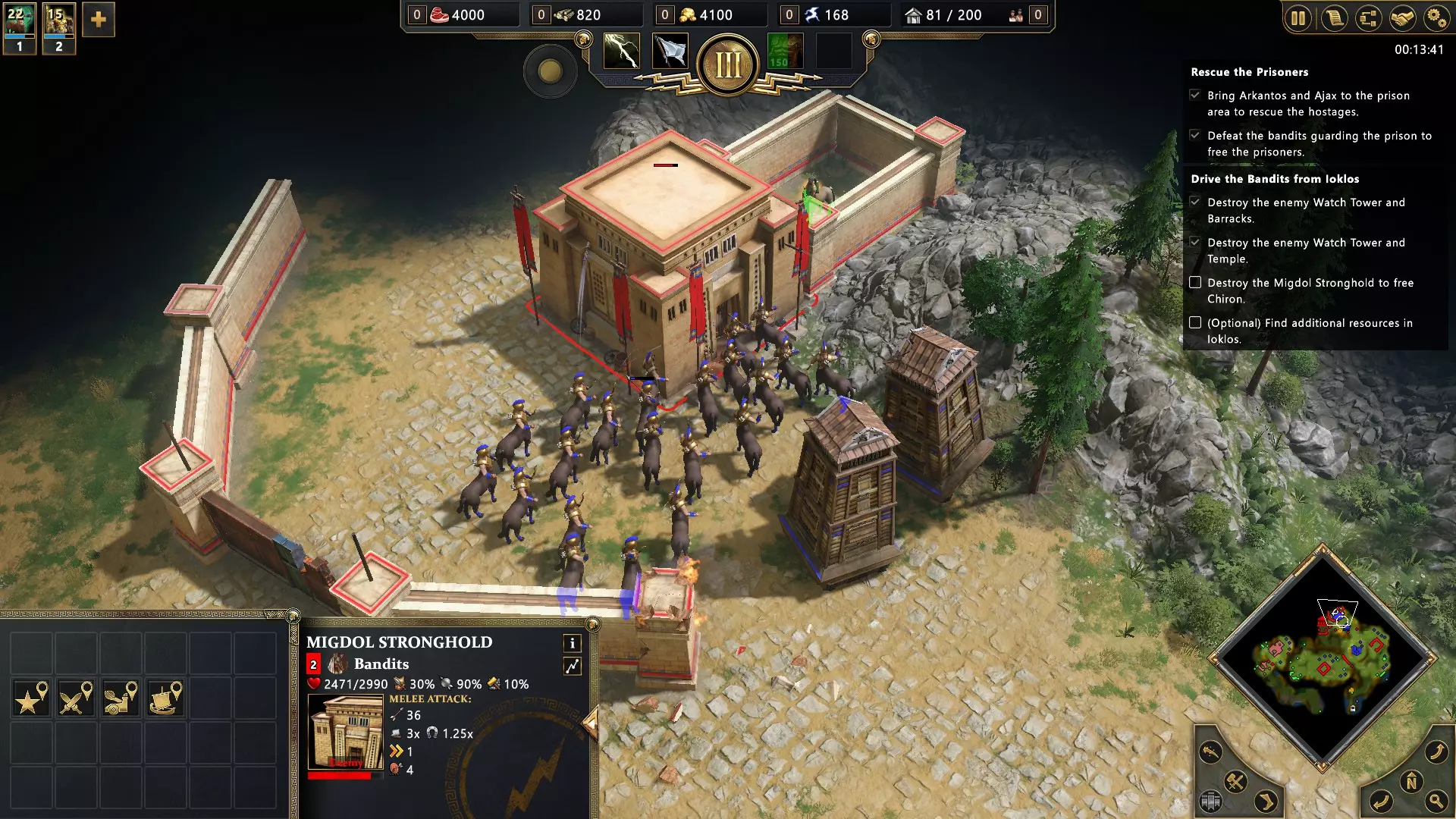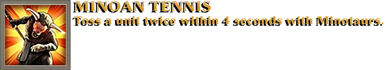 开始匹配,选择艾达或宙斯作为主神。进入古典时代并选择雅典娜作为次神,即可在神庙中解锁神话单位米诺陶洛斯的训练。米诺陶洛斯拥有“血腥打击”能力:将敌方单位击退,造成60点挥砍伤害。此能力对所有人类单位以及以下类似步兵的类人型神话单位生效:其他米诺陶、独眼巨人、阿努比斯、蝎人、木乃伊、复仇者、英灵和僵尸。 要获得此成就,至少需要两名米诺陶对同一个单位使用其能力。请确保该单位在第一次攻击后存活下来。