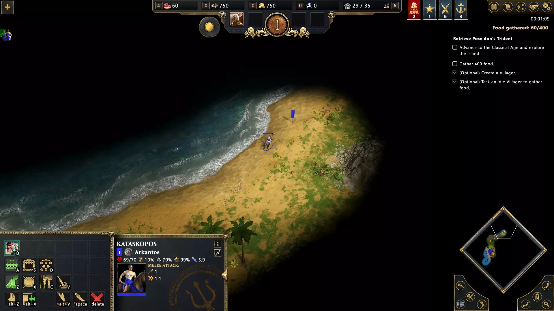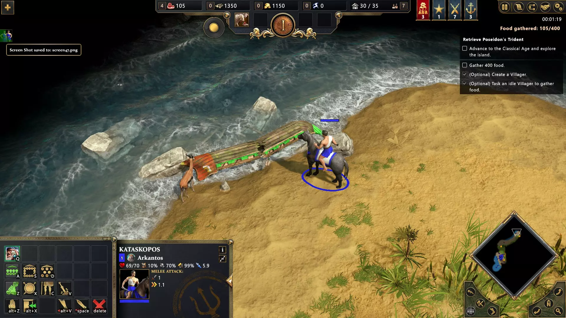 开始匹配,选择奥拉诺斯或盖亚作为主神。进入古典时代,选择奥克阿诺斯作为次神,以在你的神庙中解锁神话单位卡拉德里亚的训练。卡拉德里亚是飞行治疗单位,因此请在任何战斗中带上它,以治疗你的单位并获得成就。