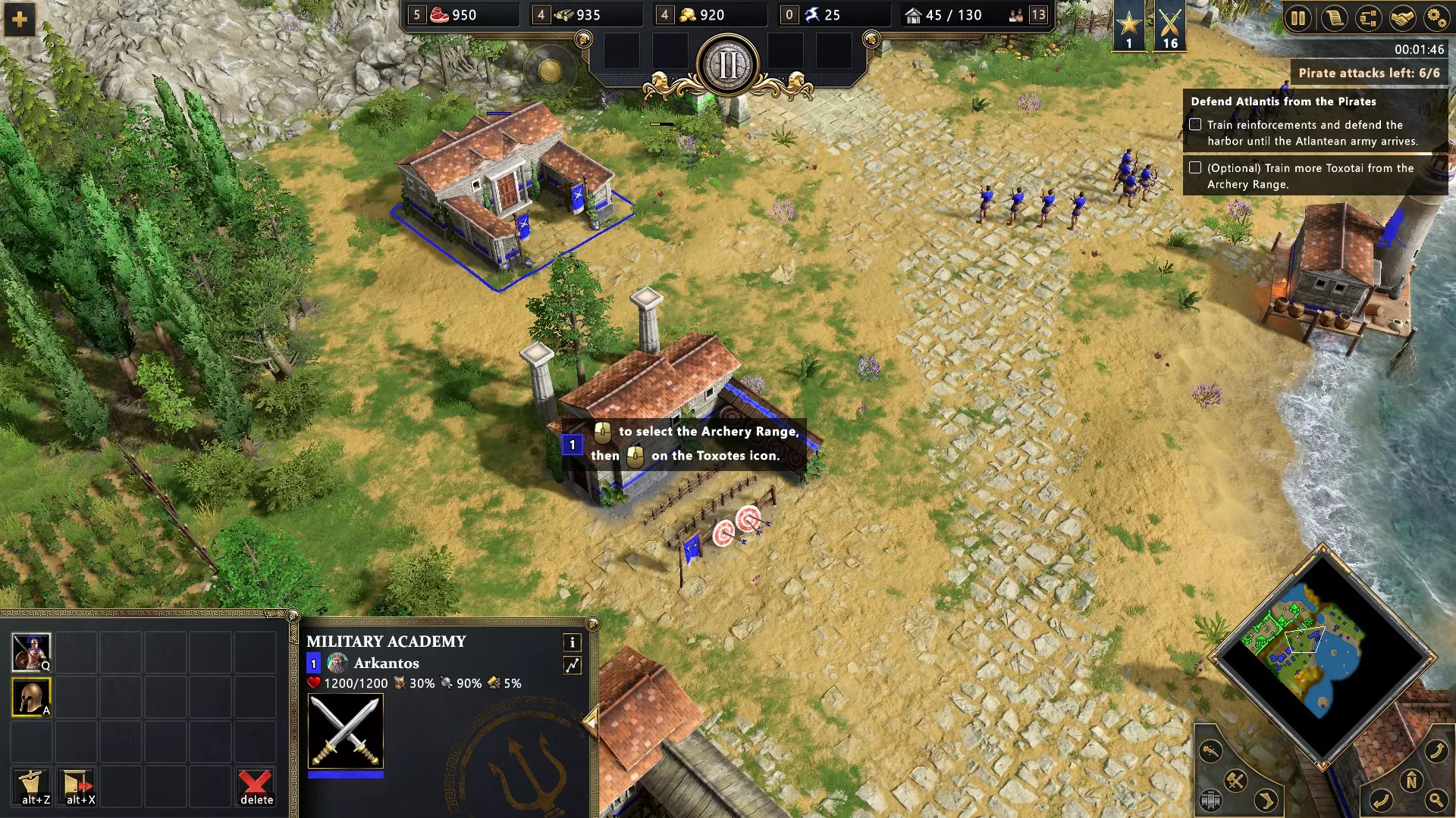 在第一个任务中,需要训练10名重装步兵(Гоплитов)和10名毒素射手(Токсотов)。灯塔对面有2座建筑,其中一座用于训练重装步兵(Гоплитов),另一座用于训练毒素射手(Токсотов)。