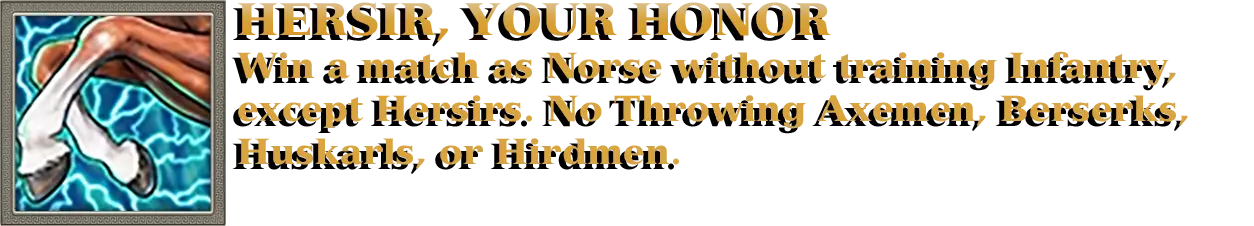 这两个成就是最容易一起获得的。只需选择任意一位北欧神明,并在仅训练神话生物和英雄的条件下赢得比赛。英雄不算作普通步兵,因此你可以随意训练他们。