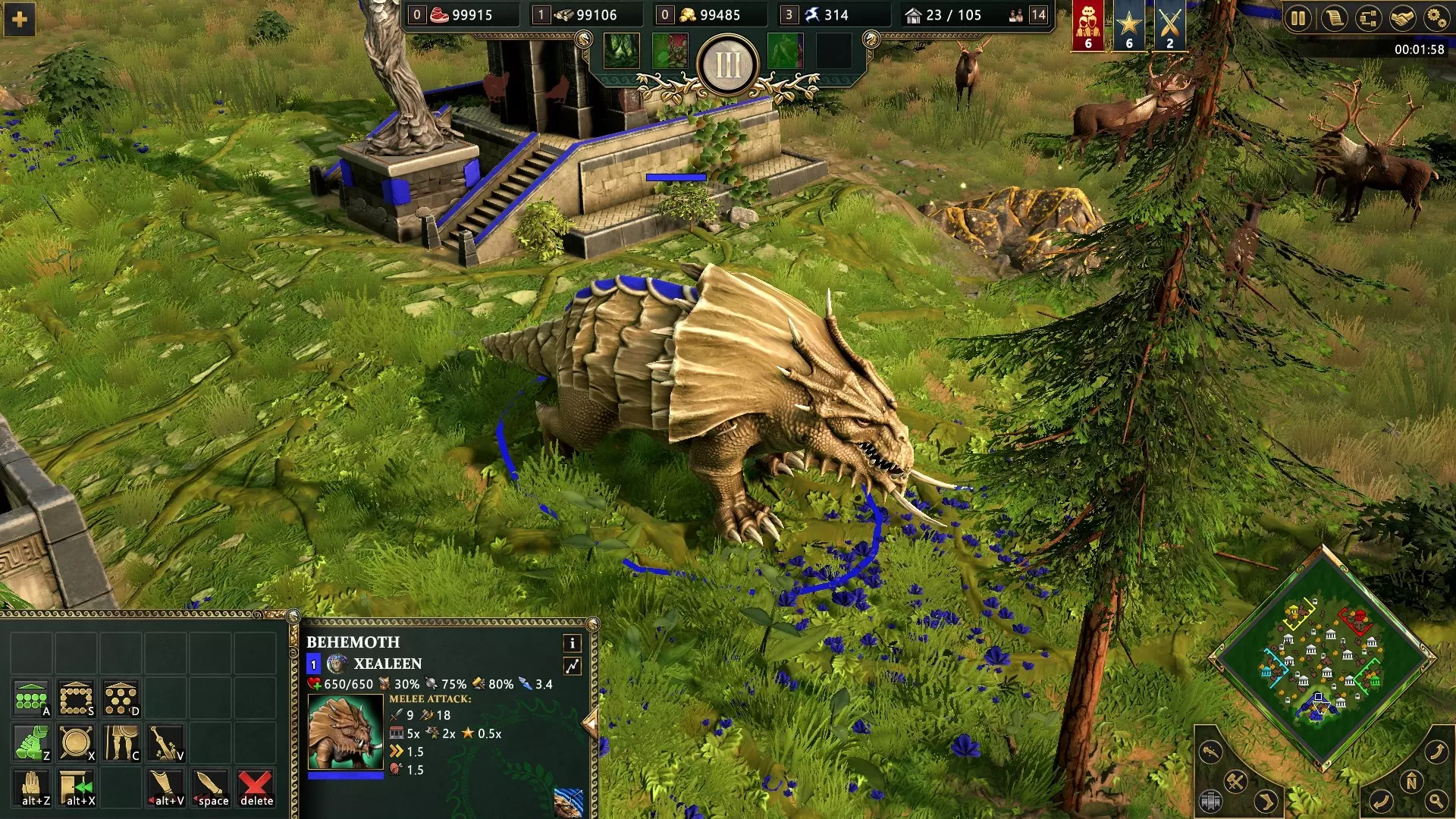 开始匹配,选择克洛诺斯或盖亚作为主神。进入英雄时代并选择蕾亚作为次神,以在你的神庙中解锁神话单位贝希摩斯的训练。贝希摩斯恢复生命值的速度更快,这使它们成为出色的活体攻城武器,能够无需维修即可自行恢复生命值。它们还拥有被动技能,能减少从正面(而非侧面或背面)受到的伤害,这使它们成为攻击敌方堡垒和城市中心的优秀突击单位。让你的“贝希摩斯”总共阻挡5000点伤害,该成就就会属于你。